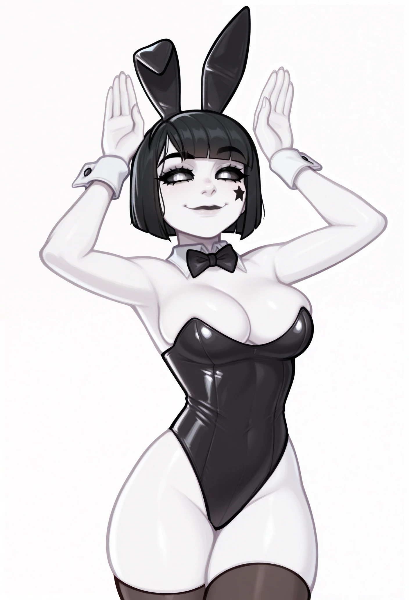 white skin, short hair, black hair, bob cut, blunt bangs, white eyes, black sclera, star facial mark, black headwear, beret