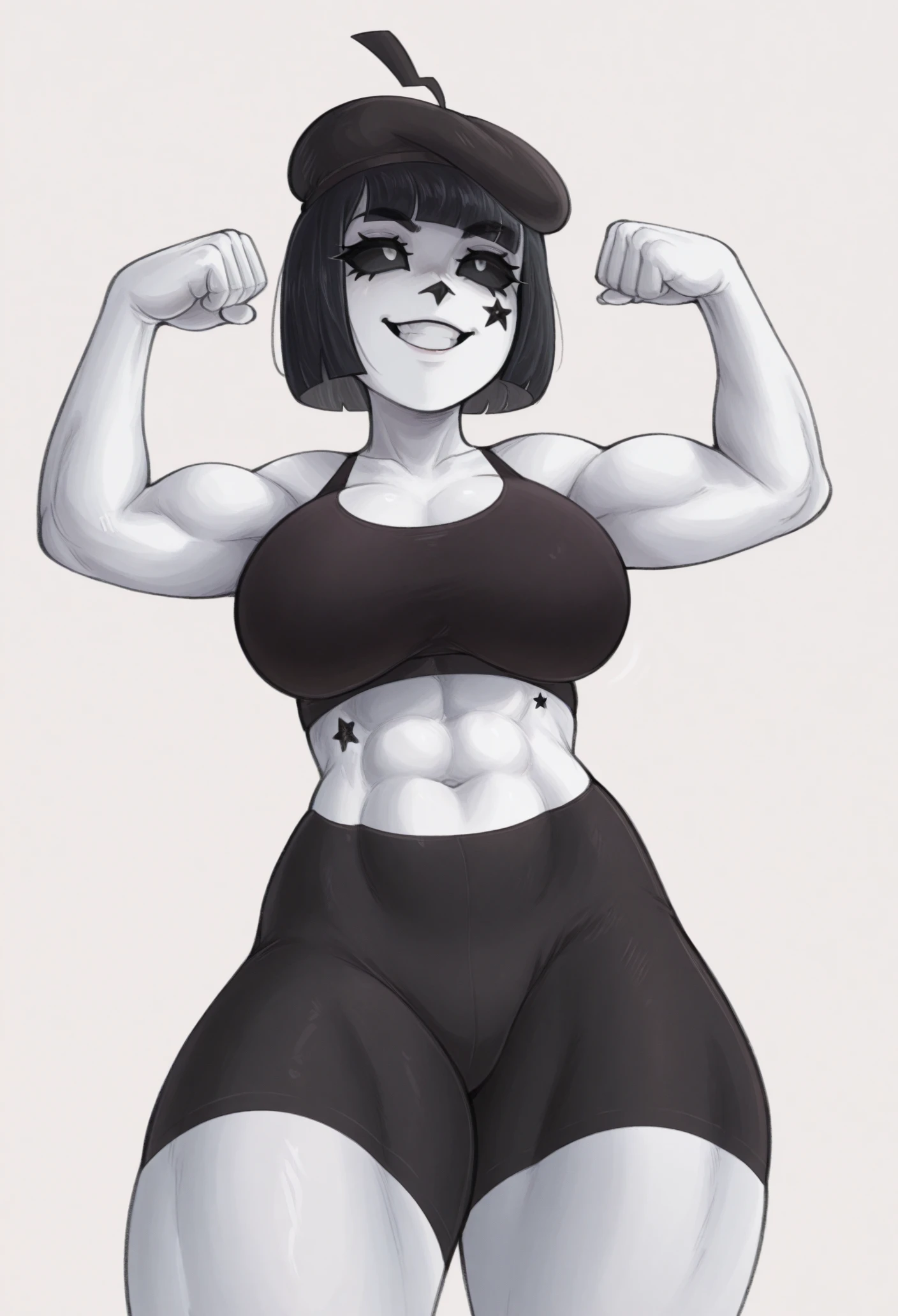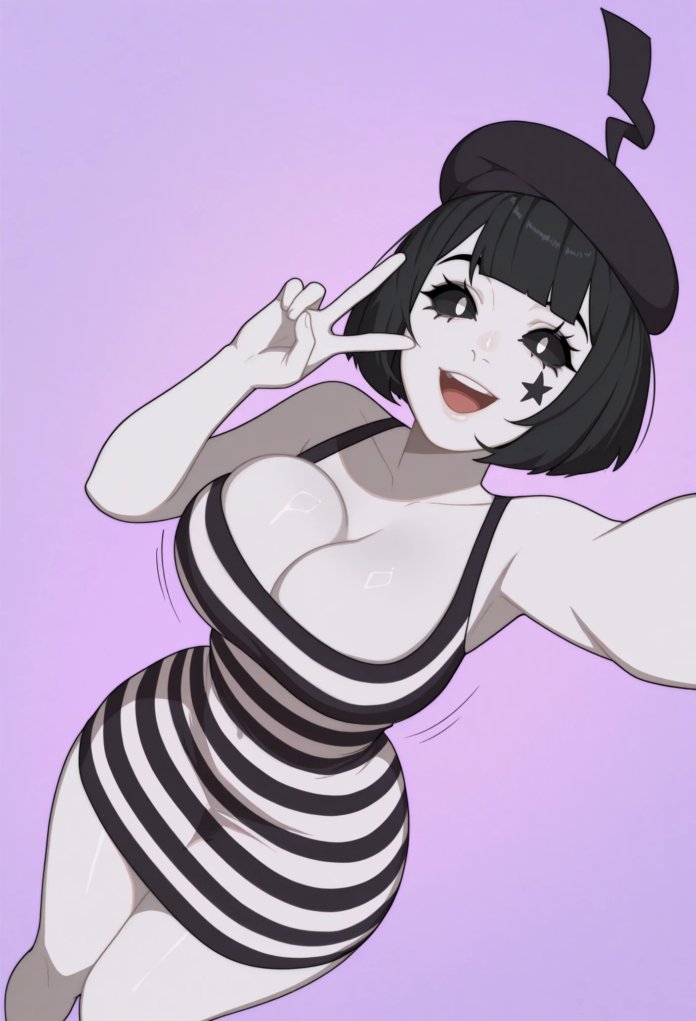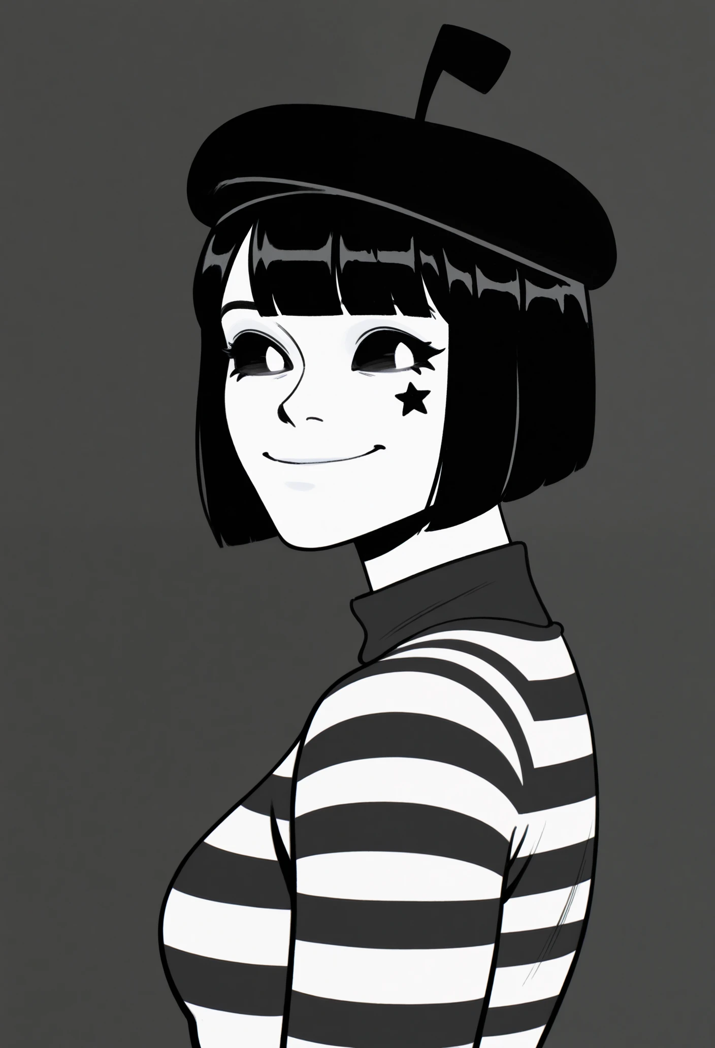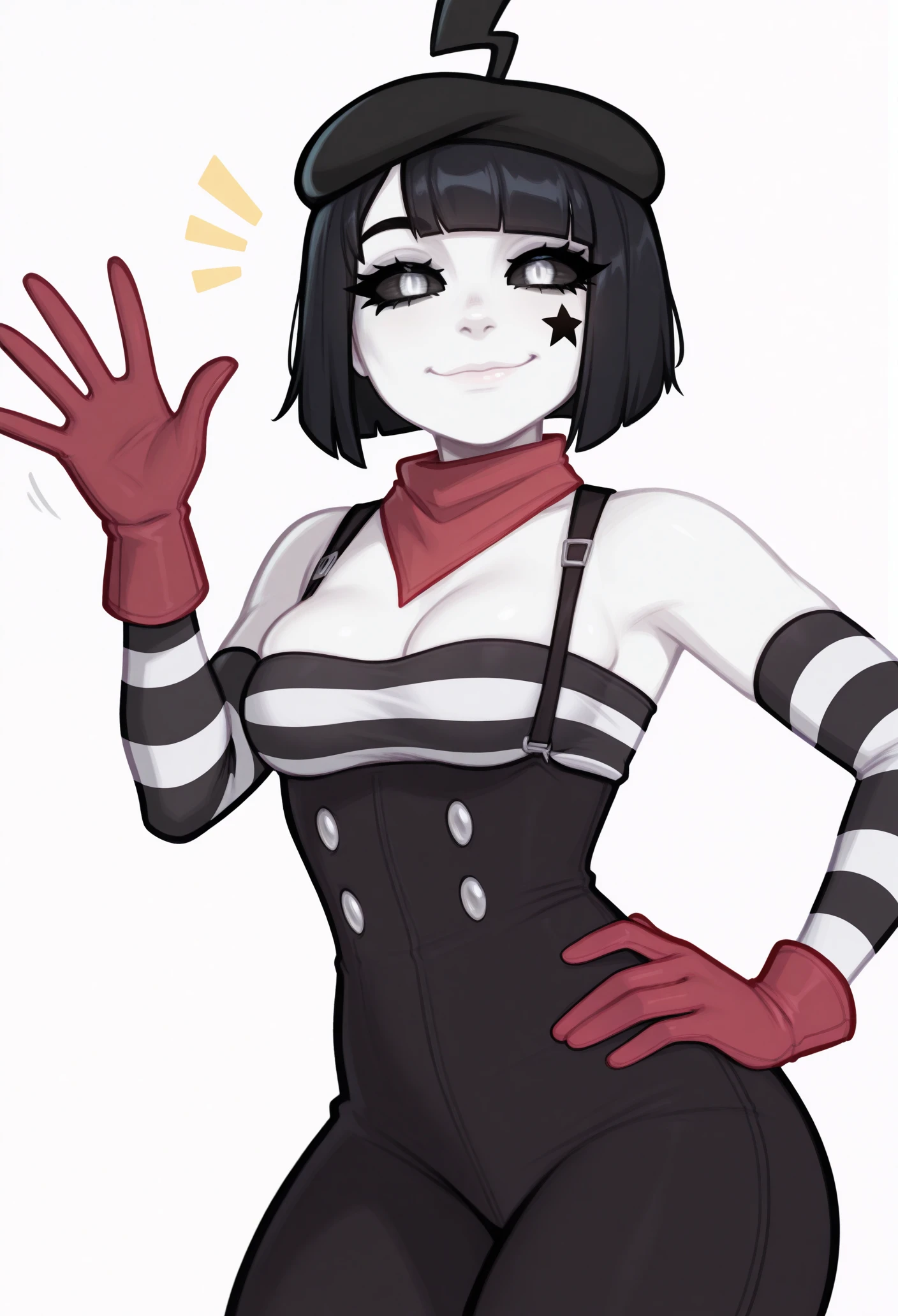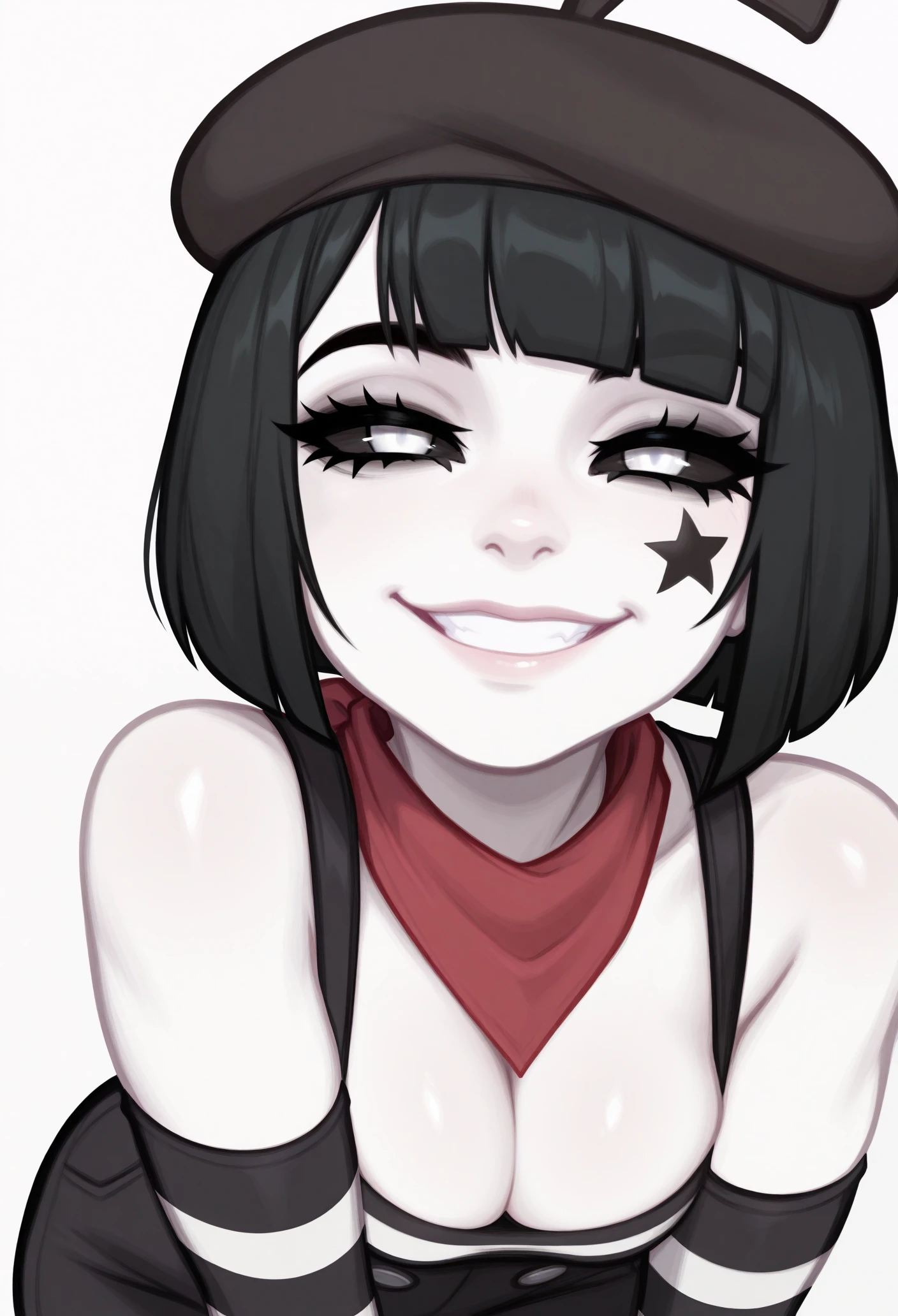 - Character Tags: white skin, short hair, black hair, bob cut, blunt bangs, white eyes, black sclera, star facial mark, black headwear, beret