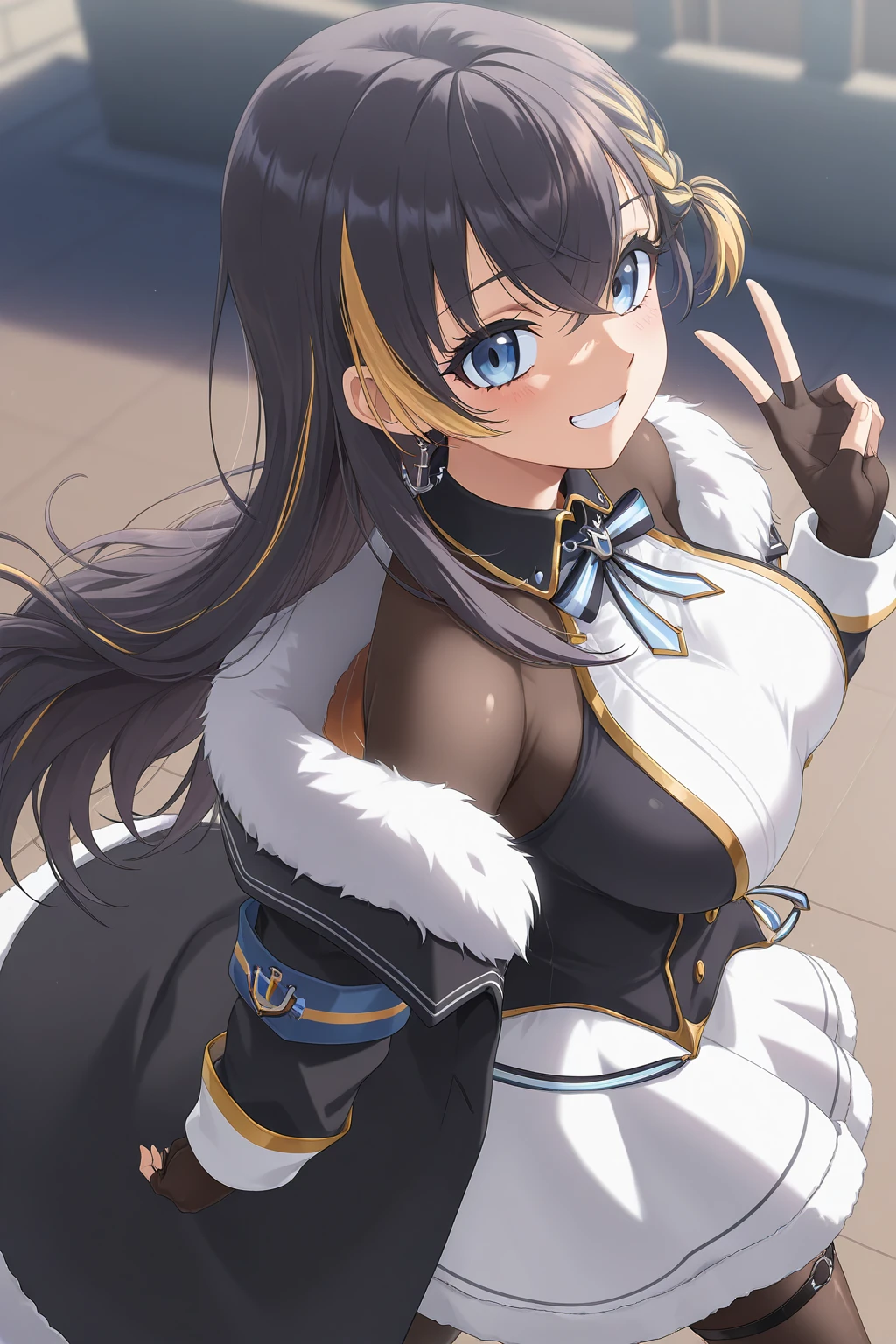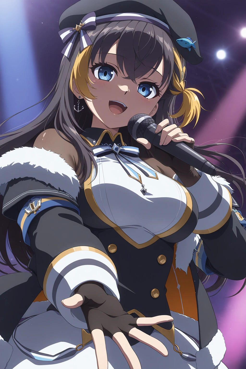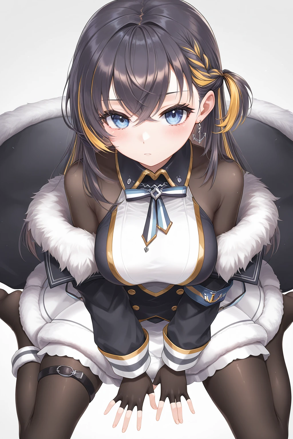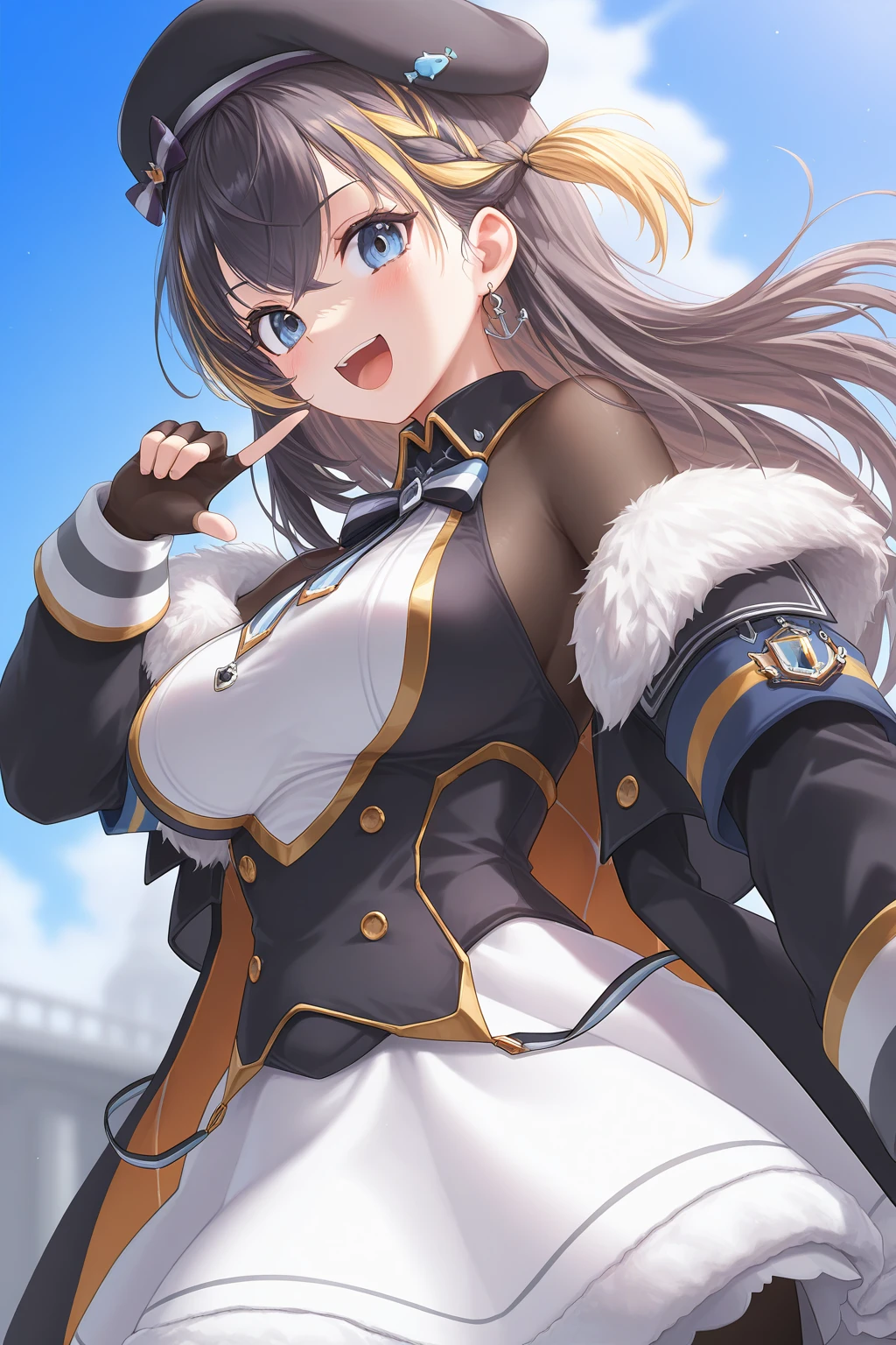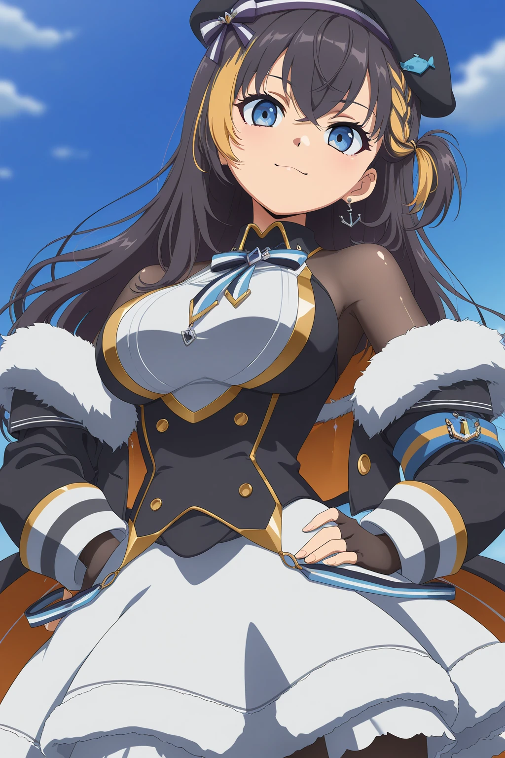 PGNJ, long hair, black hair, streaked hair, blonde hair, side braid, one side up, crossed bangs, blue eyes, eyelashes, breasts, beret, black headwear, hat ornament, fish hair ornament, anchor earrings, single earring, two-tone bowtie, collared dress, gold trim, sleeveless dress, bodystocking, black coat, fur-trimmed coat, armband, , two-sided fabric, fingerless gloves, black gloves, double-breasted, striped bow, fur-trimmed dress, black pantyhose, o-ring thigh strap, knee boots, fur-trimmed boots