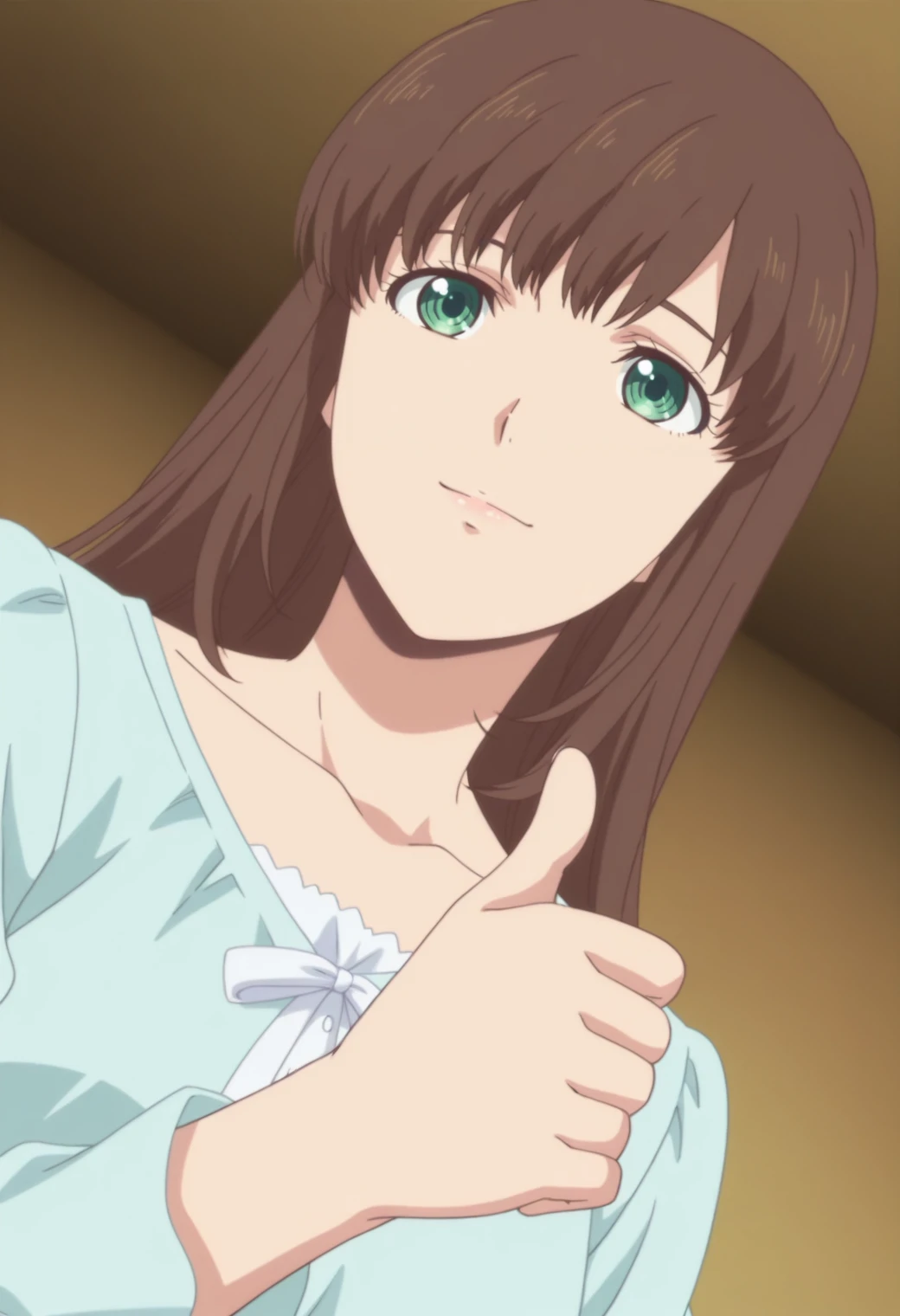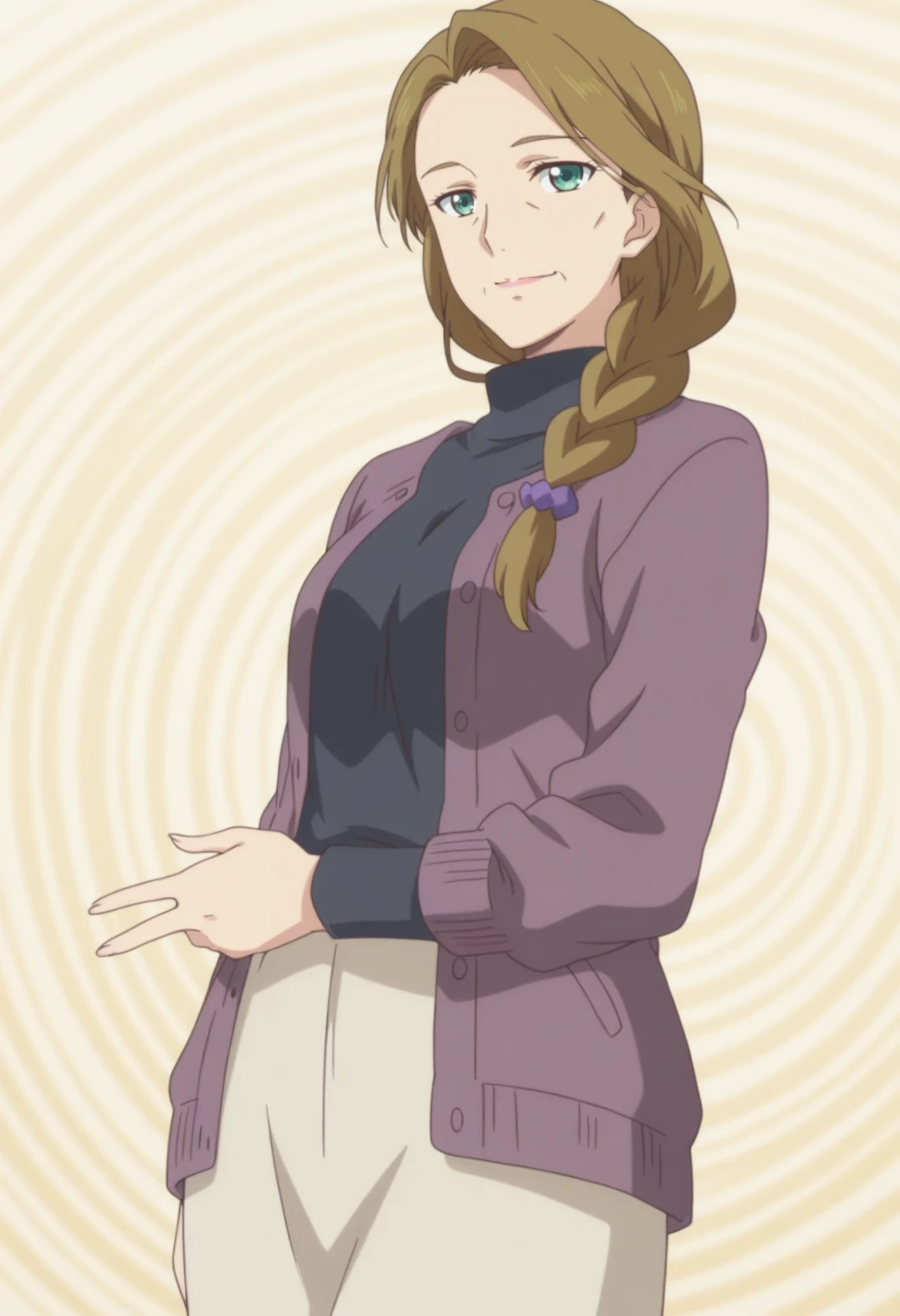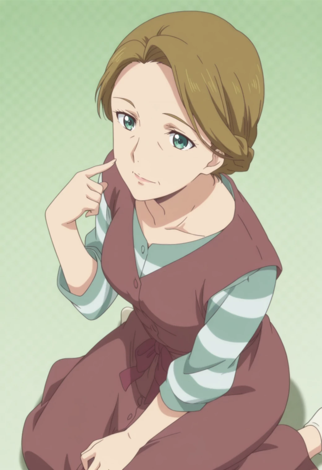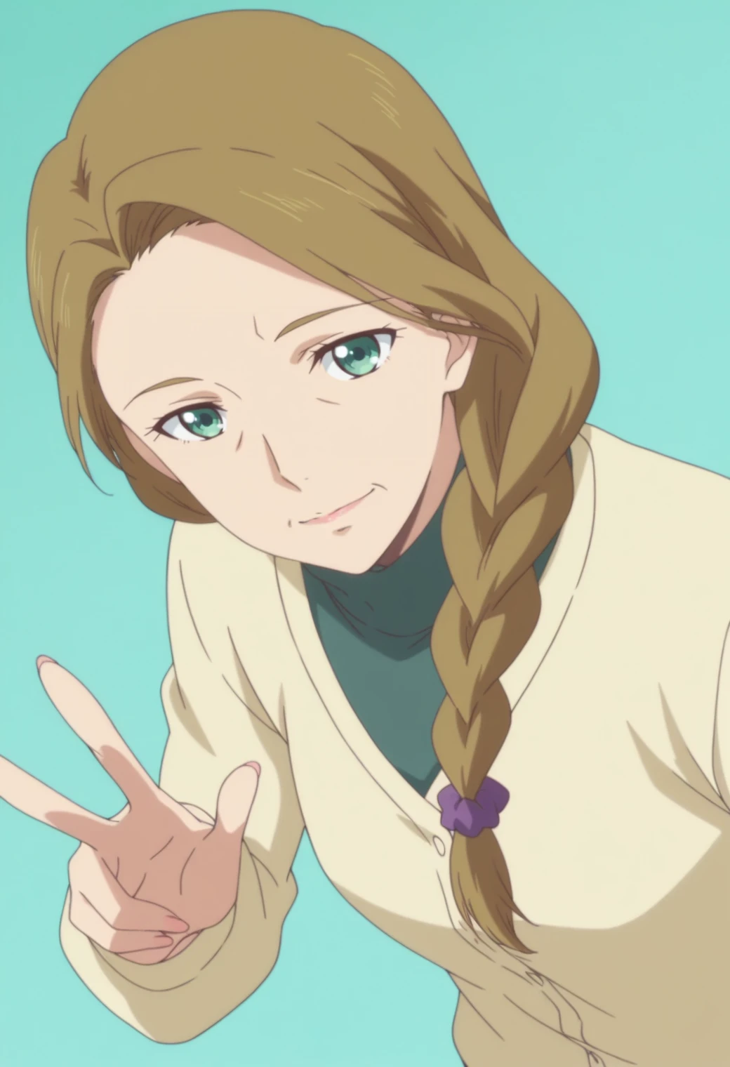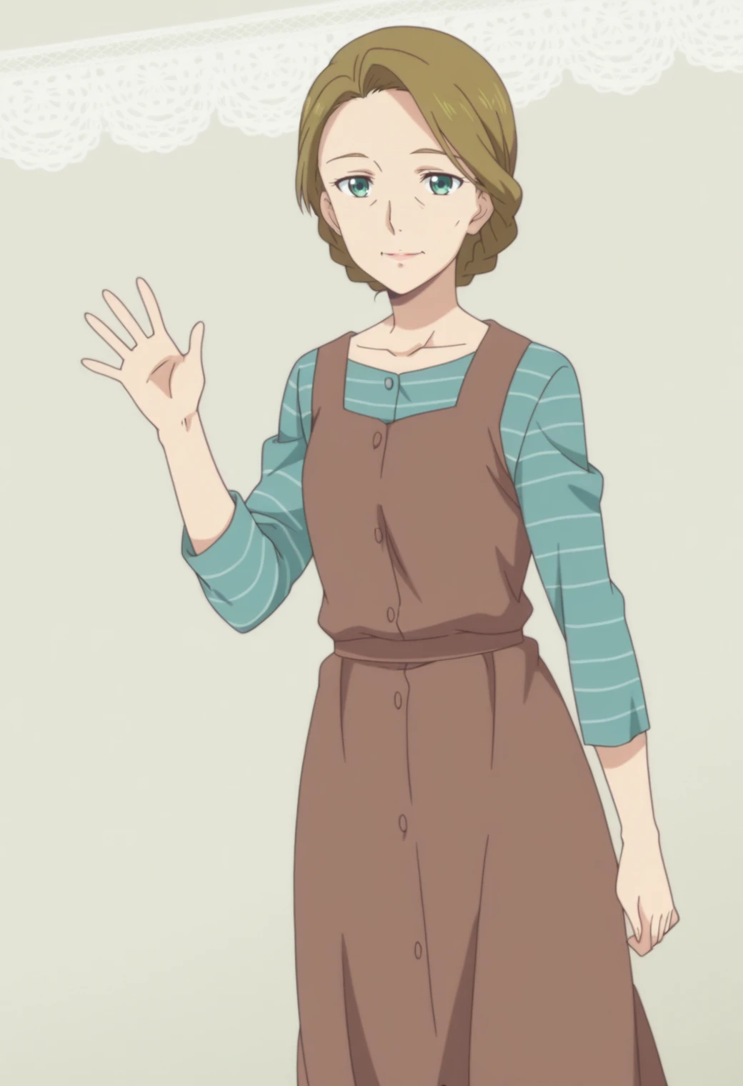 tachbana tsukiko, green eyes, brown hair, mature female, wrinkled skin, (single braid, hair over shoulder,) folded braid