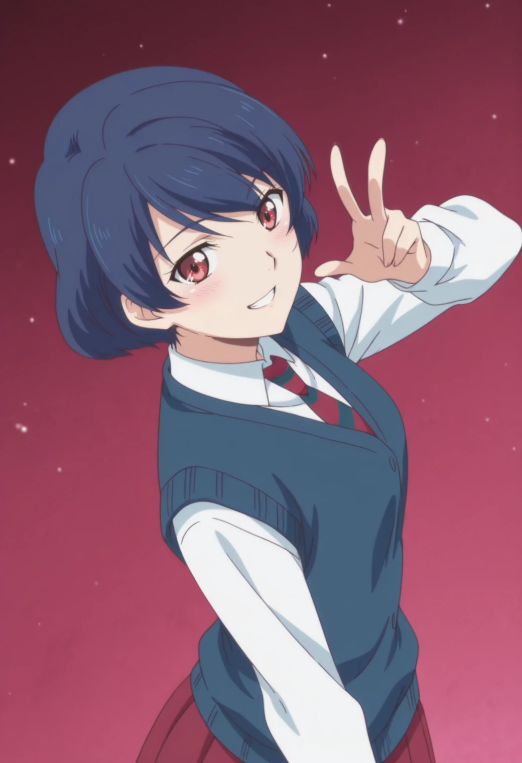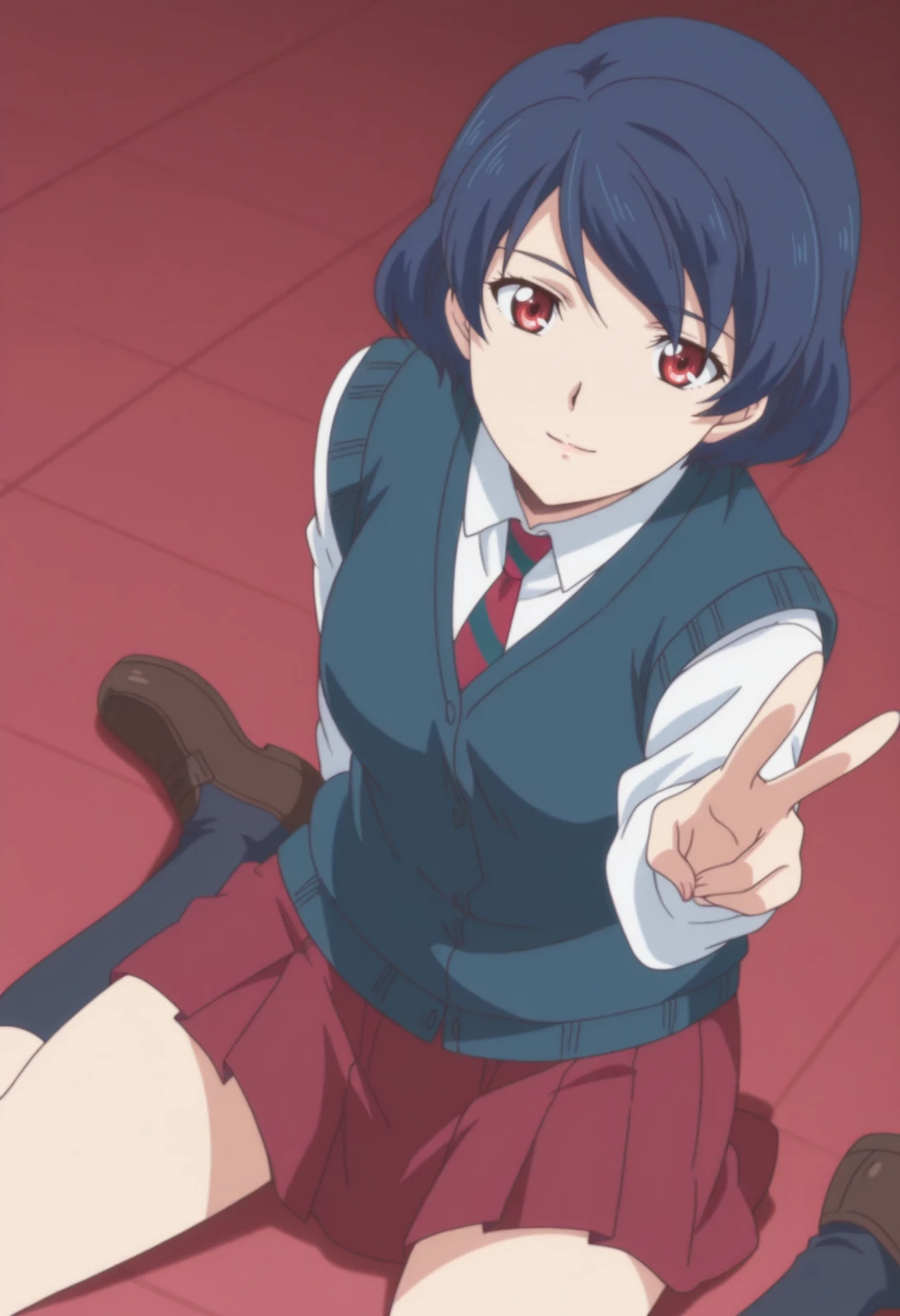 school uniform, white shirt, sweater vest, white shirt, long sleeves, blue vest, striped necktie, red skirt,