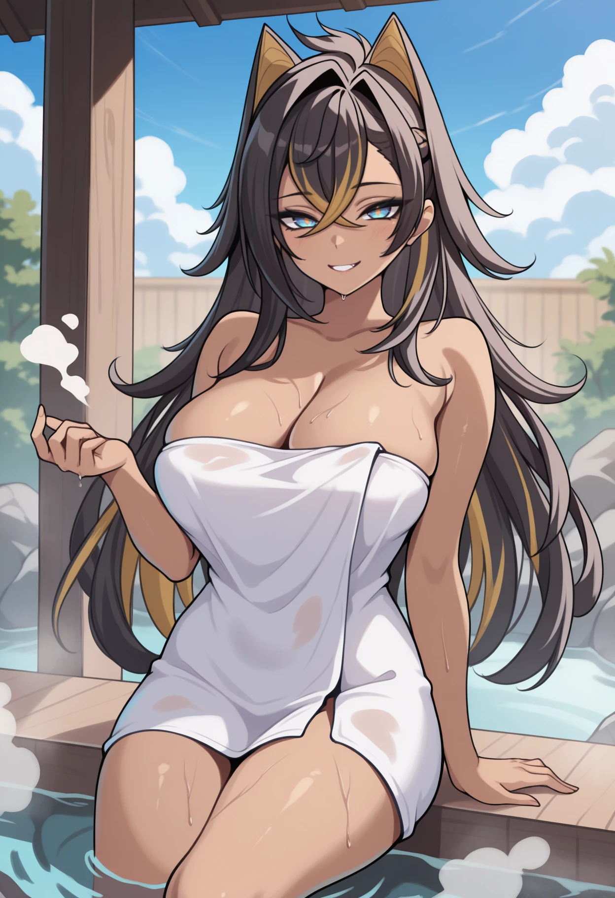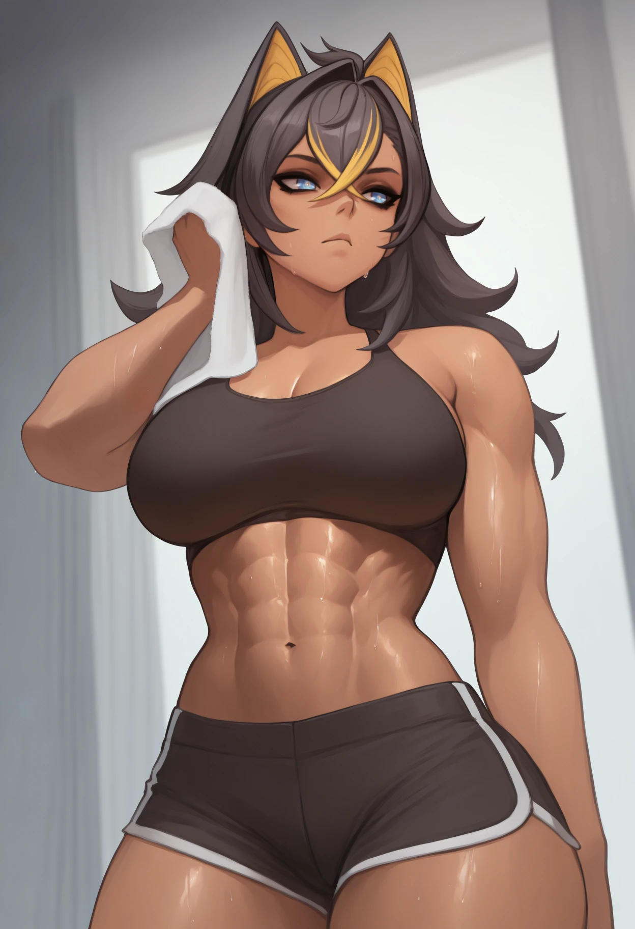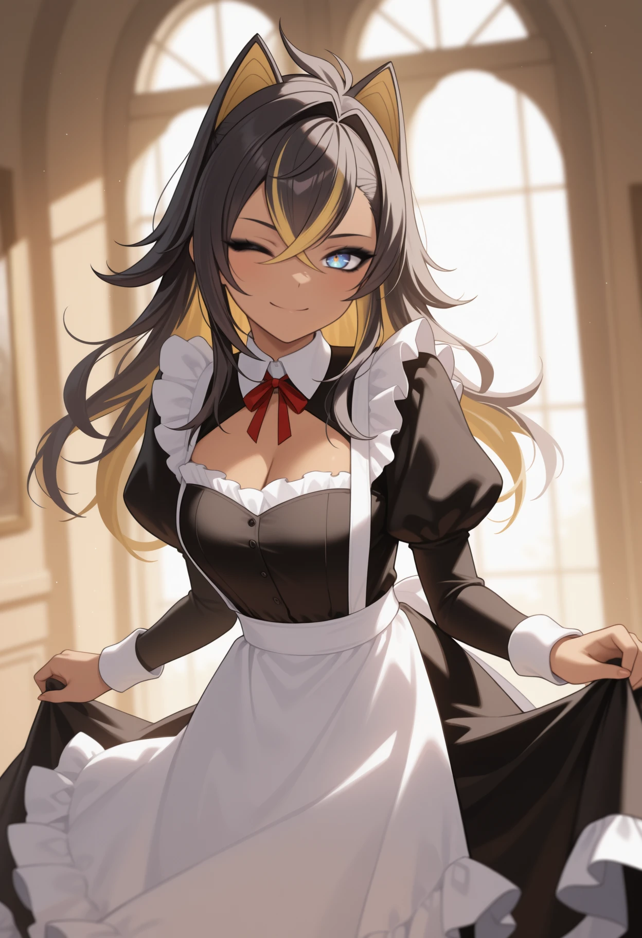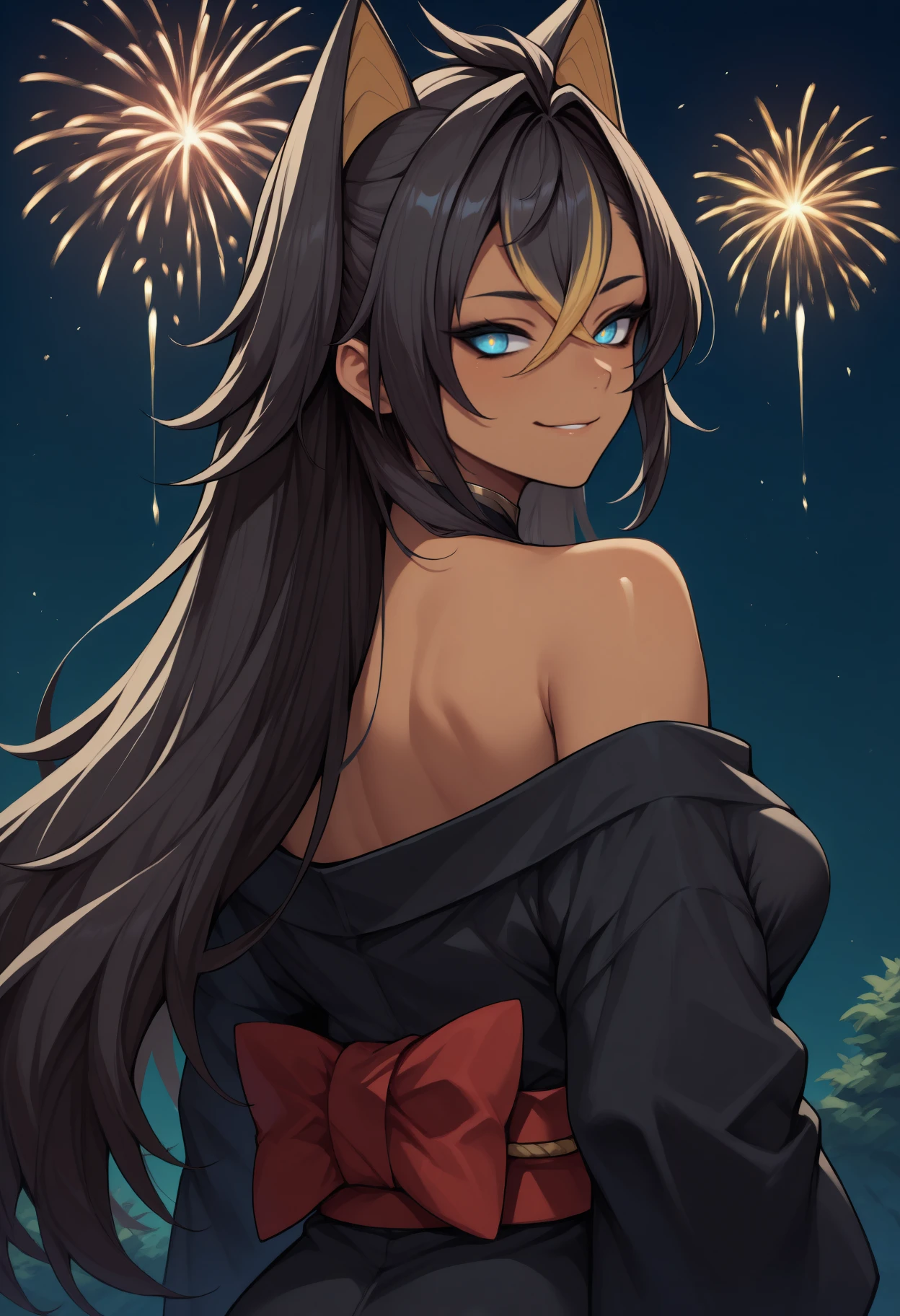 Trigger + Appearance: d3hya, dark-skinned female, long hair, streaked hair, black hair, blonde hair, hair between eyes, crossed bangs, hair intakes, hair ears, pointy hair, blue eyes, yellow pupils
