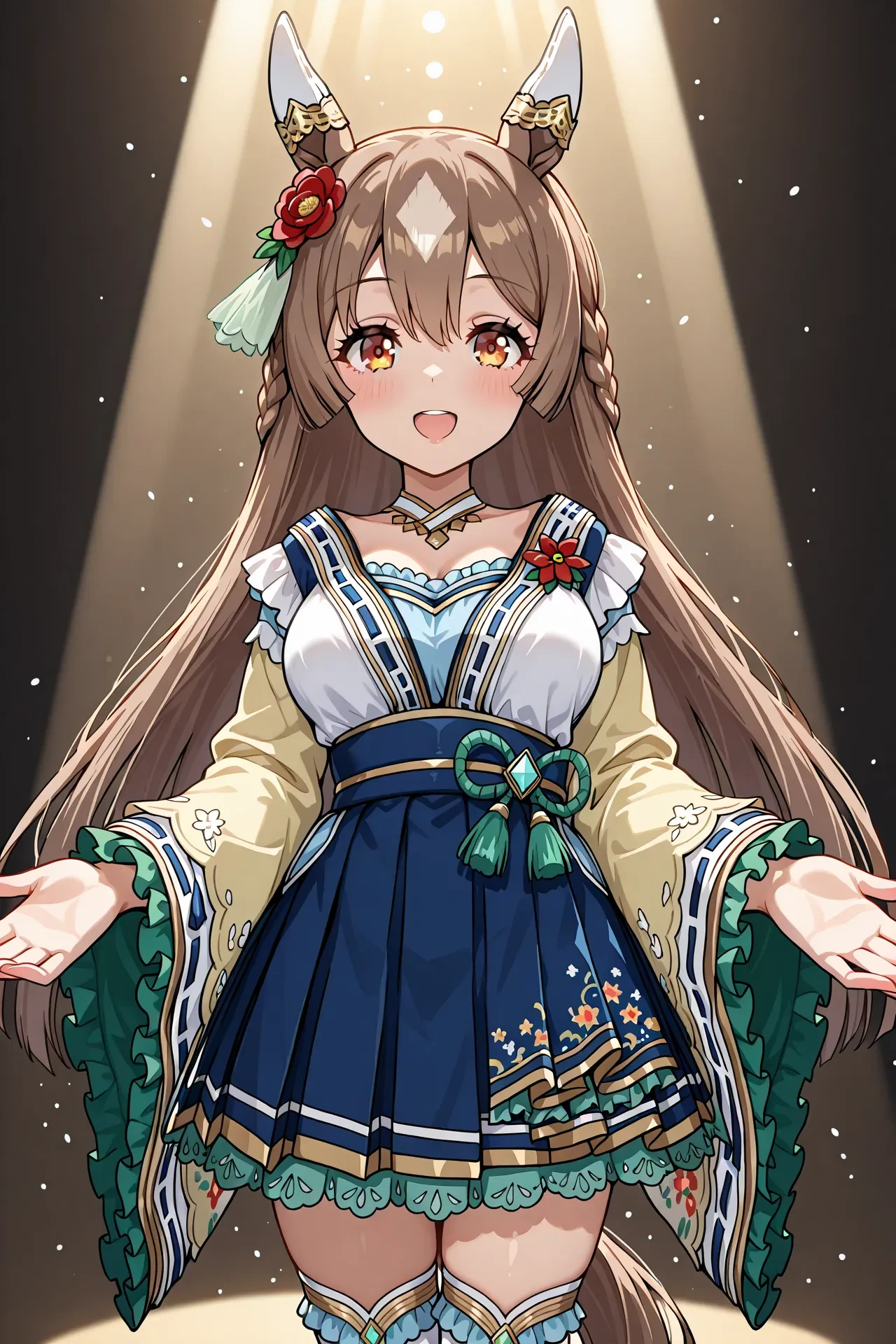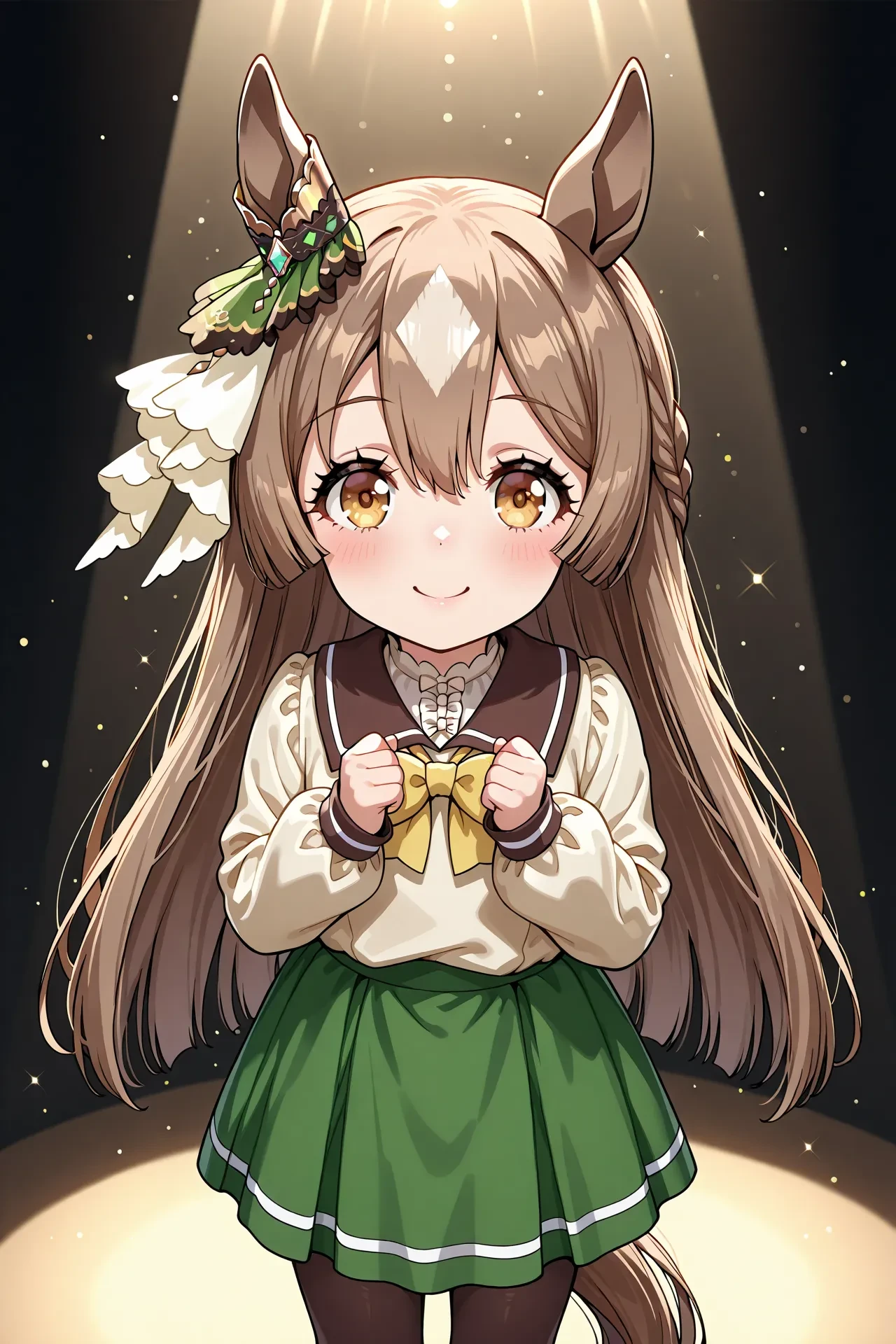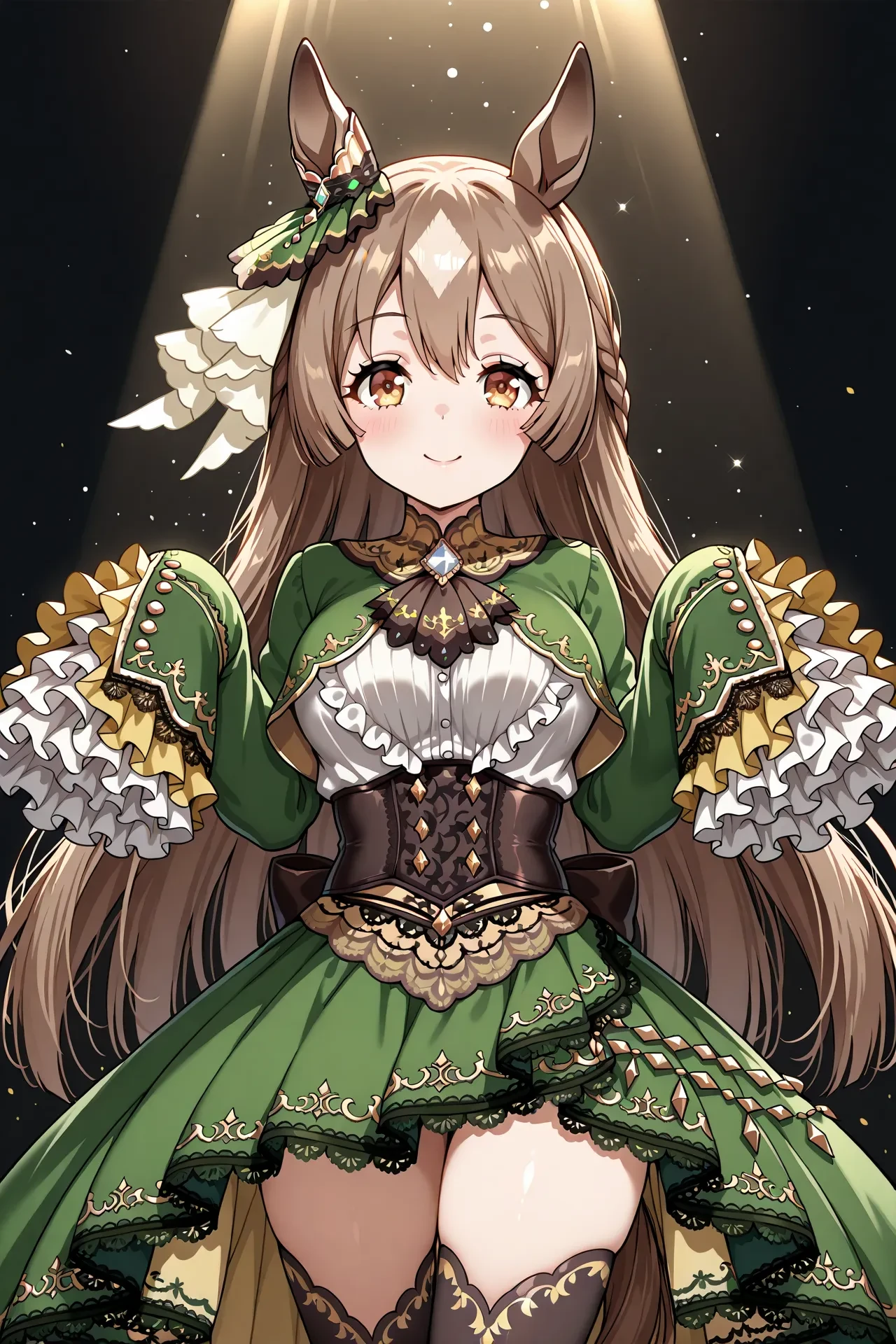 horse ears,horse tail,horse girl,ear ornament,long hair,brown hair,half updo,(very long hair),hair between eyes,braid,bangs,brown eyes,