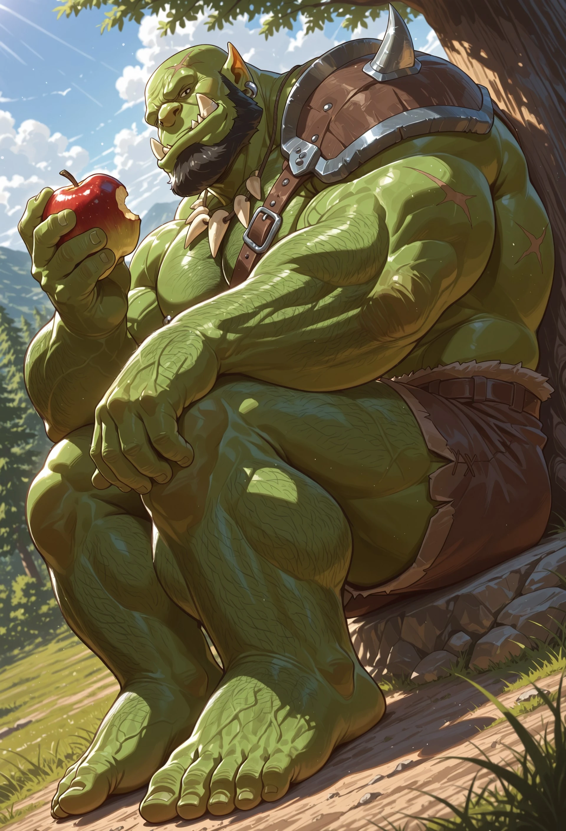 1boy, solo, Korg, orc, close up, side angle, smirk, looking at viewer, green skin, large muscles, wide body, orc tusks, silver ring on tusk, bald, scar on head, black beard, hairy, black pupils, white sclera, wide jaw