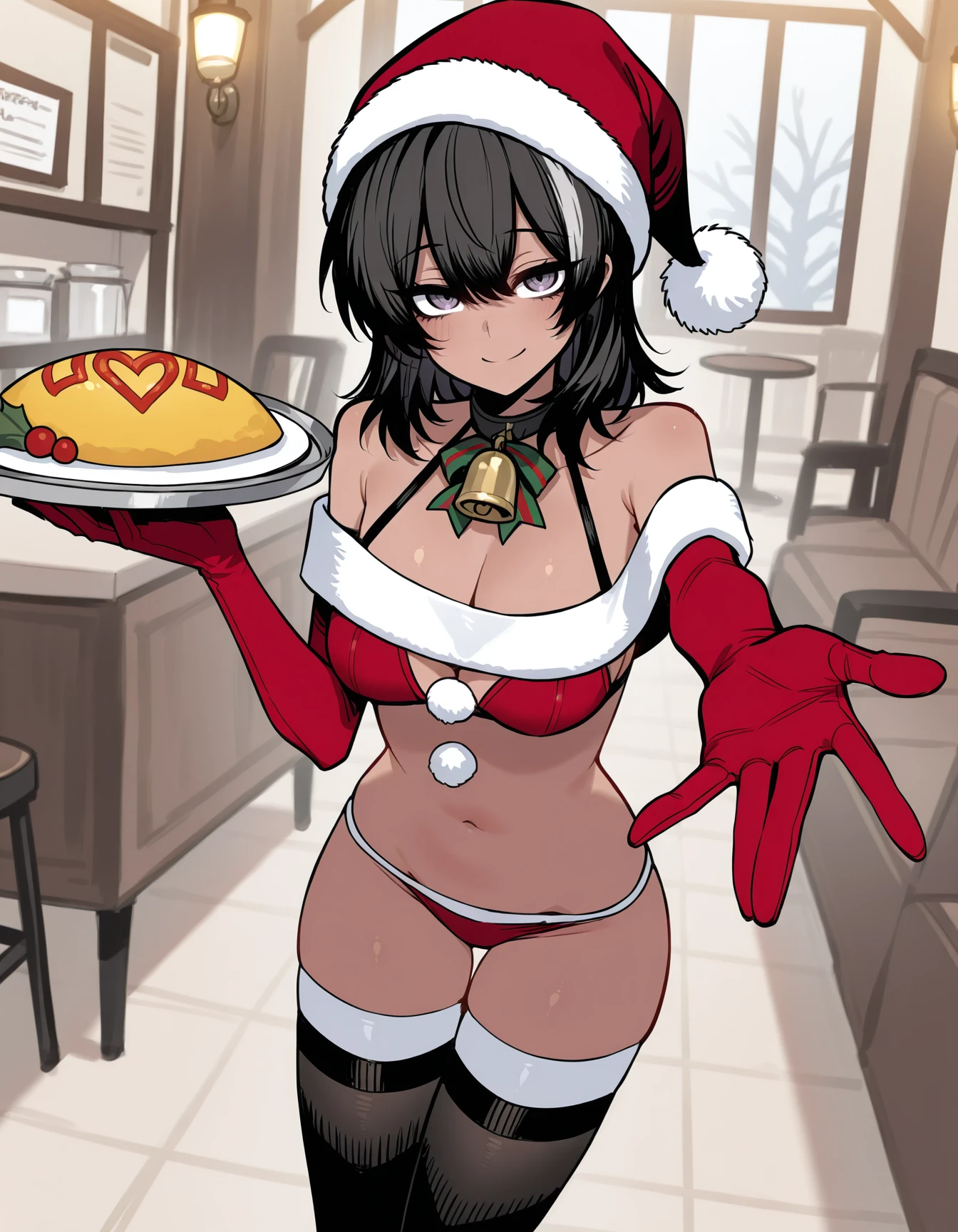 le0th13f, medium hair, neck bell, santa hat, bare shoulders, santa bikini, santa gloves, thighhighs