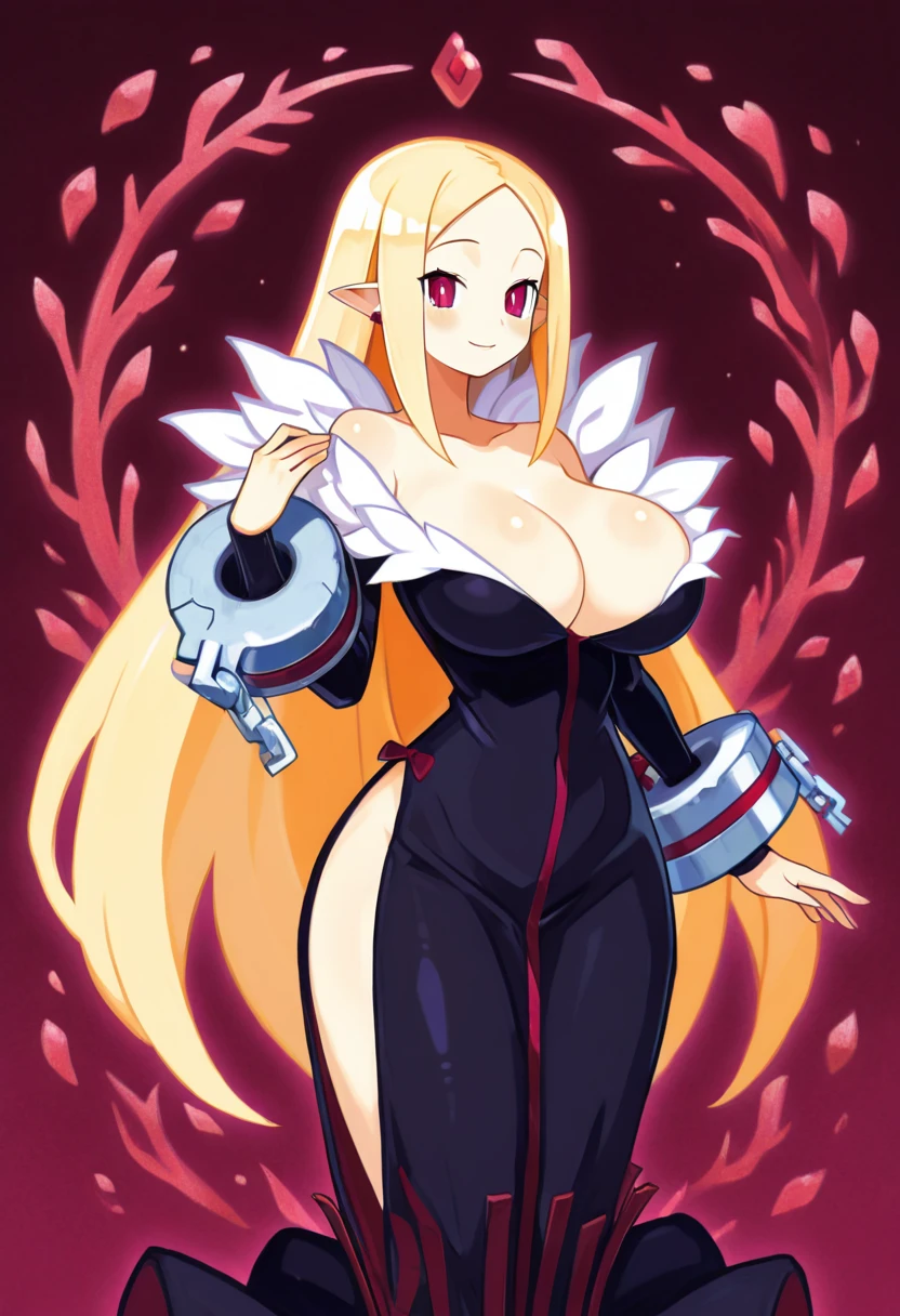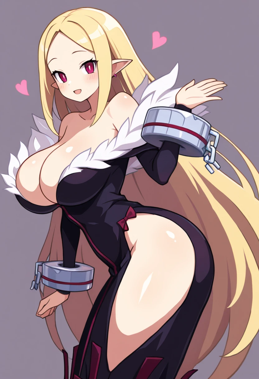 zzHealer, blonde hair, long hair, pointy ears, swept bangs, collarbone, side slit, fur trim, hip vent, jewelry, long dress, long sleeves, mermaid dress, cuffs,