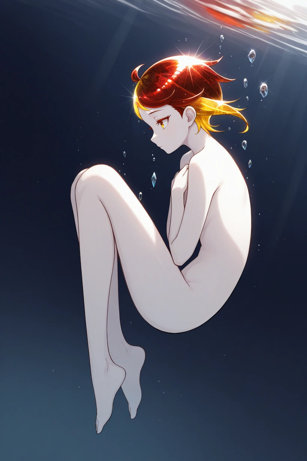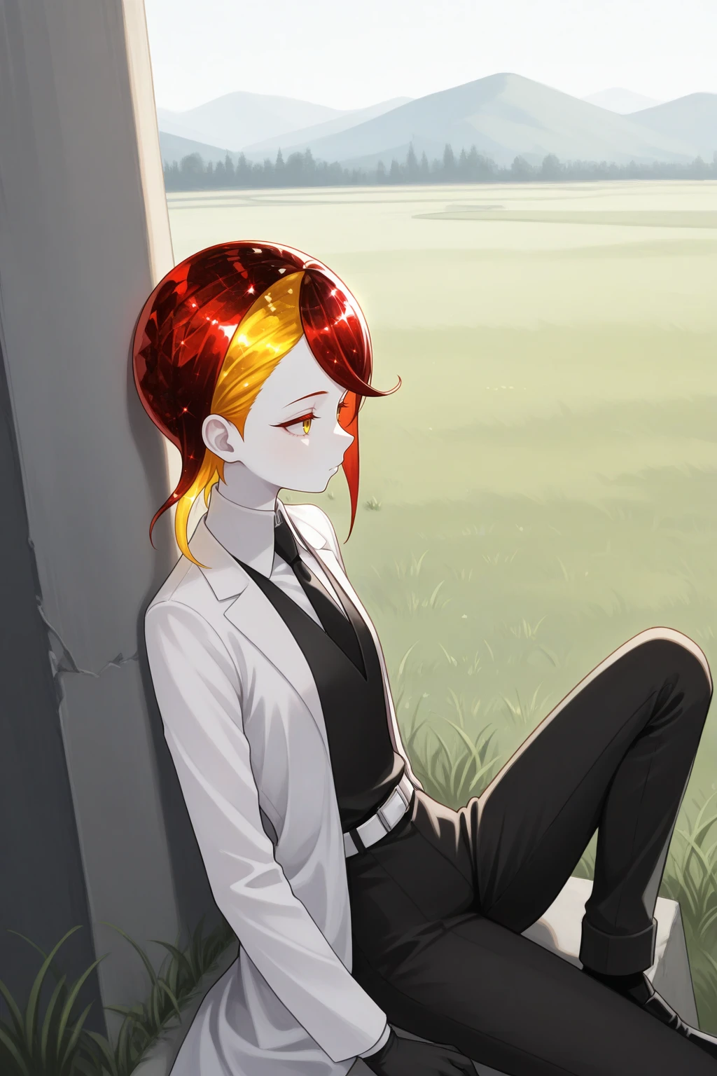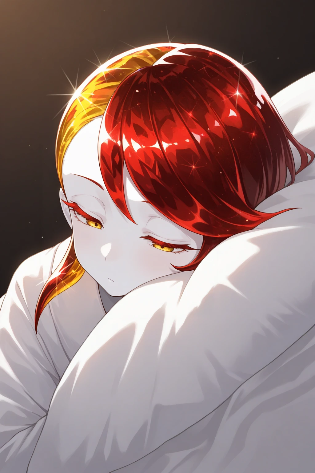 1other, rut1le, white skin, crystal hair, colored eyelashes, multicolored hair, two-tone hair, yellow hair, red hair, short hair, yellow eyes