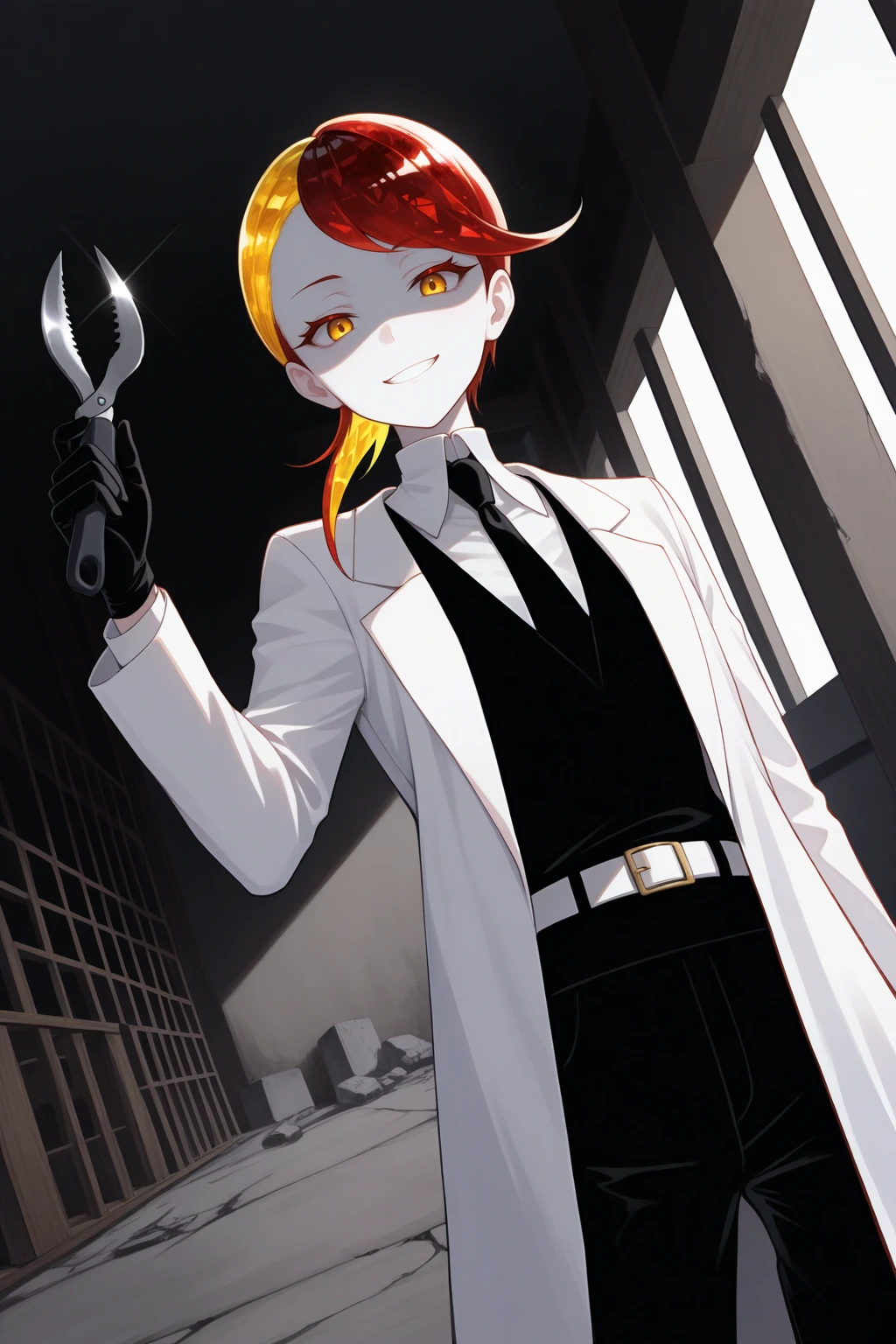 Outfit : white labcoat, black shirt, white collared shirt, black necktie, white belt, black pants, black footwear, black gloves