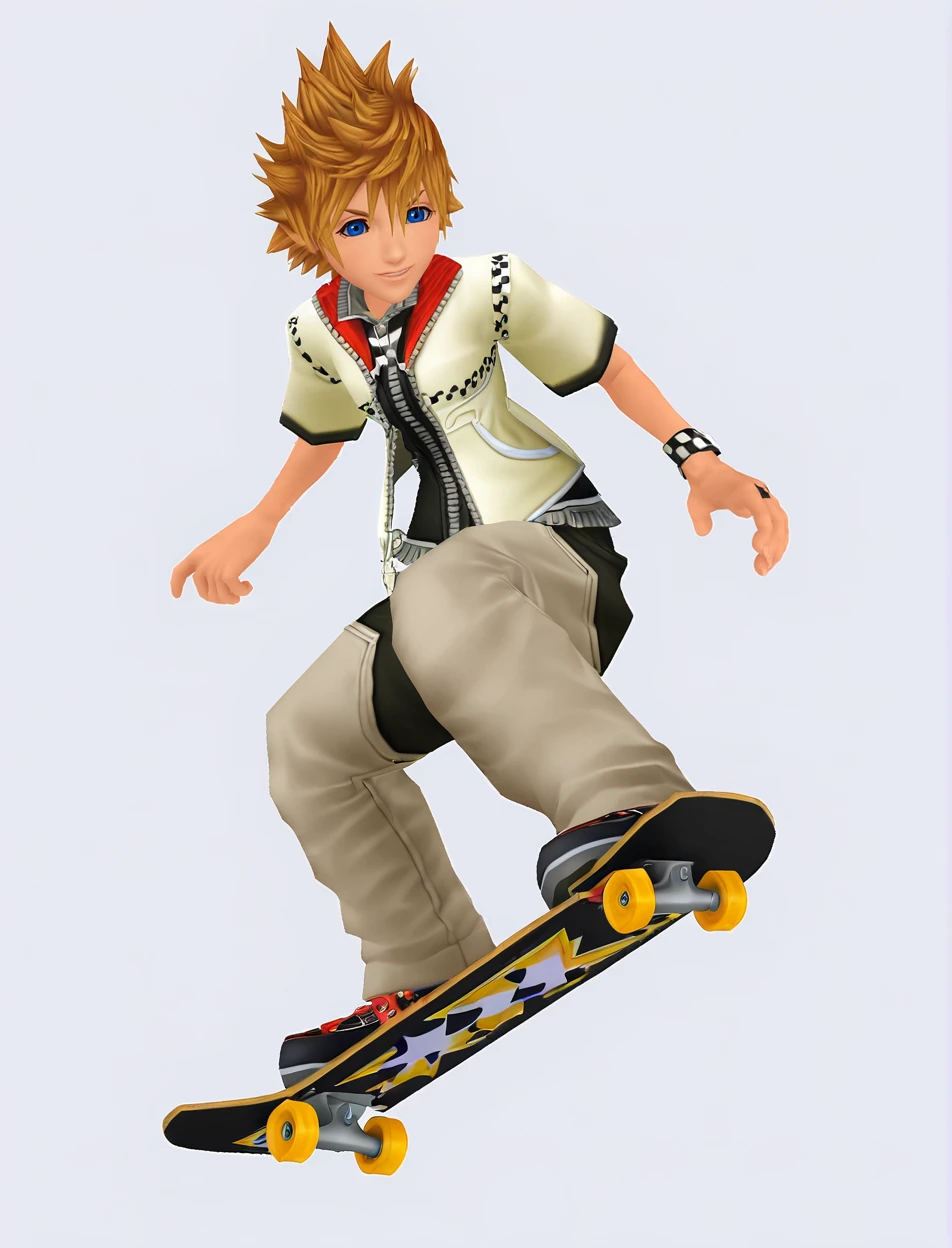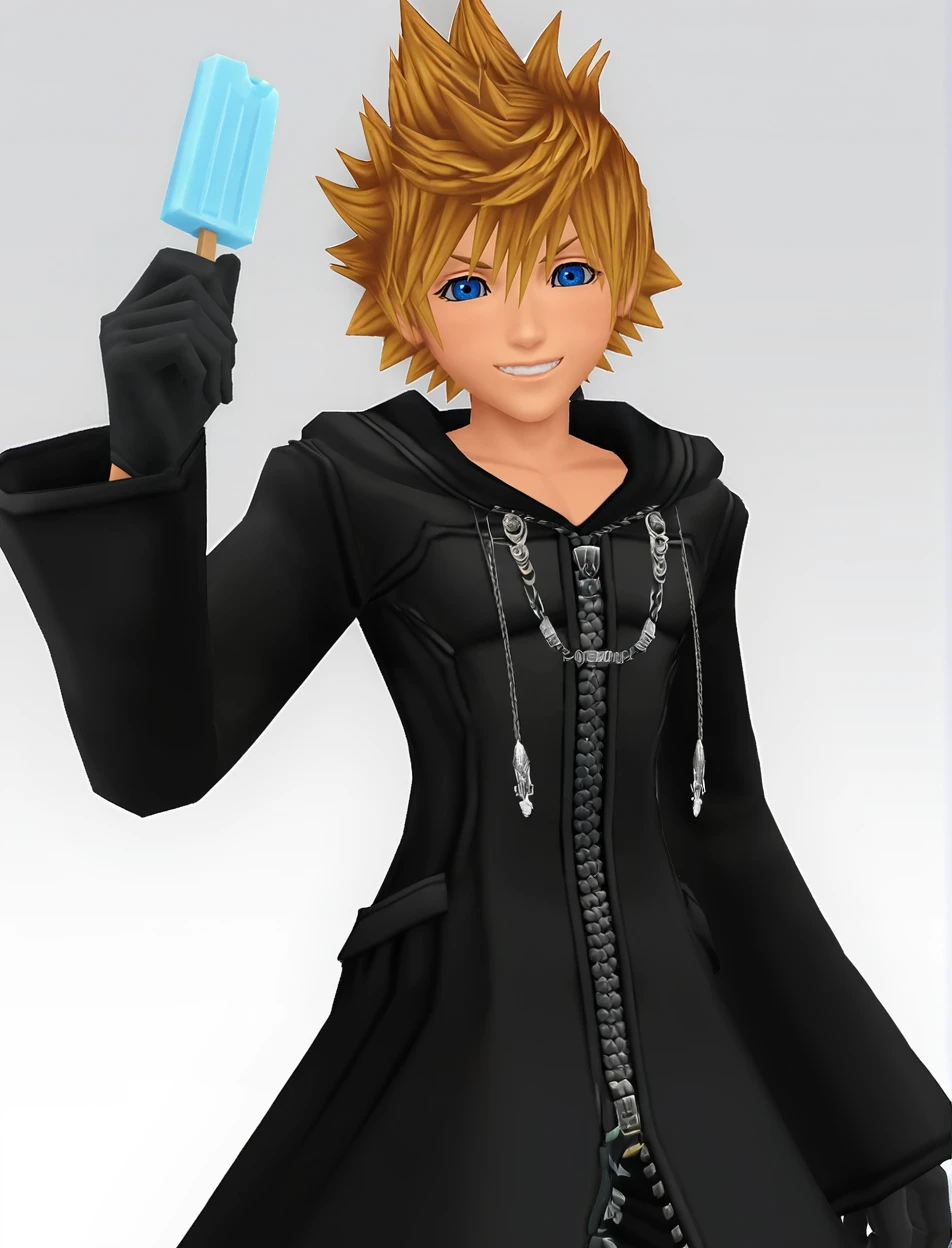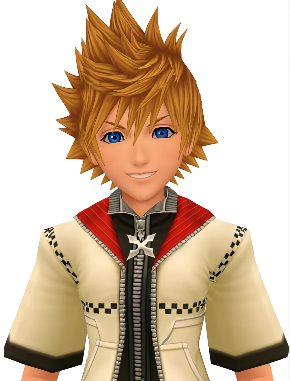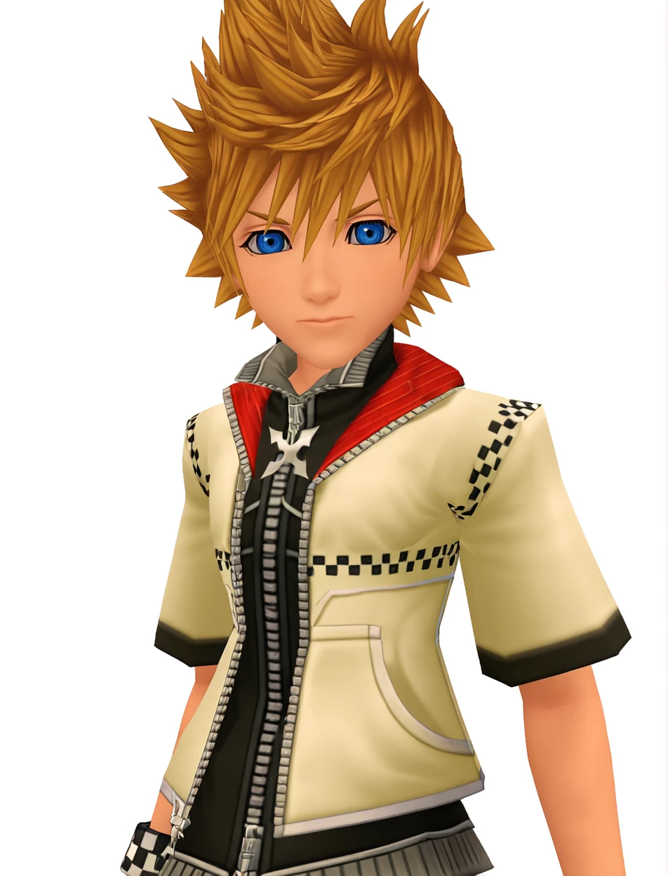 “male, blue eyes, spiky hair.”To generate Roxas wearing his iconic casual outfit from the beginning of Kingdom Hearts II, add the following keywords to the prompt: “kh_casual_outfit, white short jacket, checkerboard pattern, black inner shirt, zipper shirt, checkerboard wristband, baggy pants, two-tone pants, black and light gray pants, oversized shoes, black shoes, red shoe straps, shuriken-shaped necklace.”