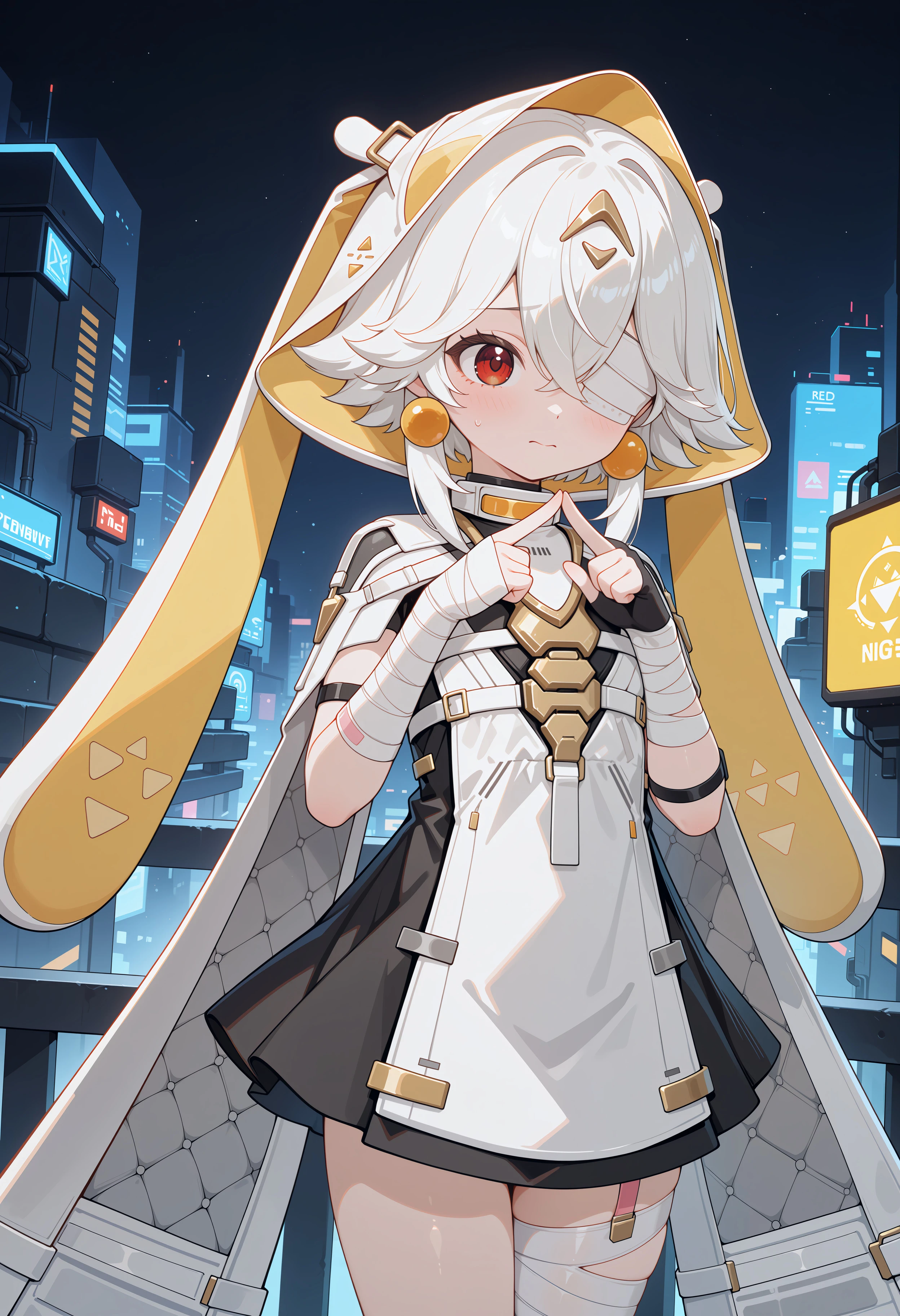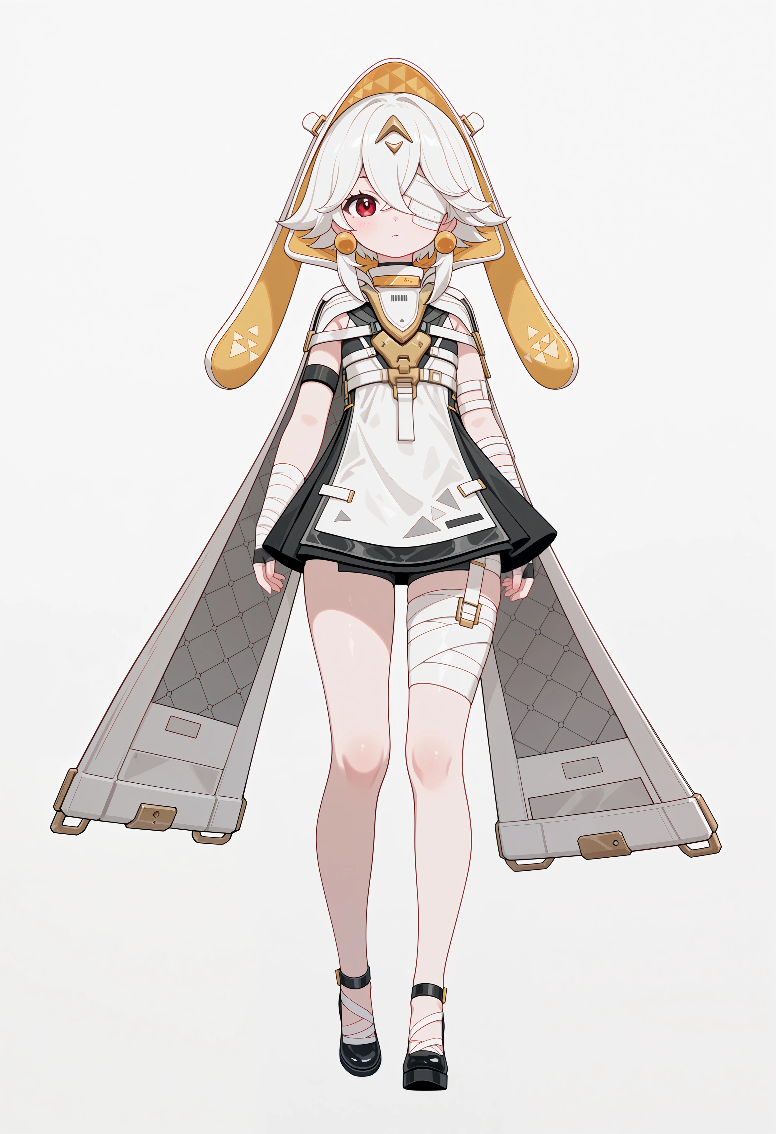 ruby official outfit, official hood, official rabbit hood, official white cape, bandage over one eye, black footwear, bandaged leg, bandaged arm, high collar, high belt, arm strap,