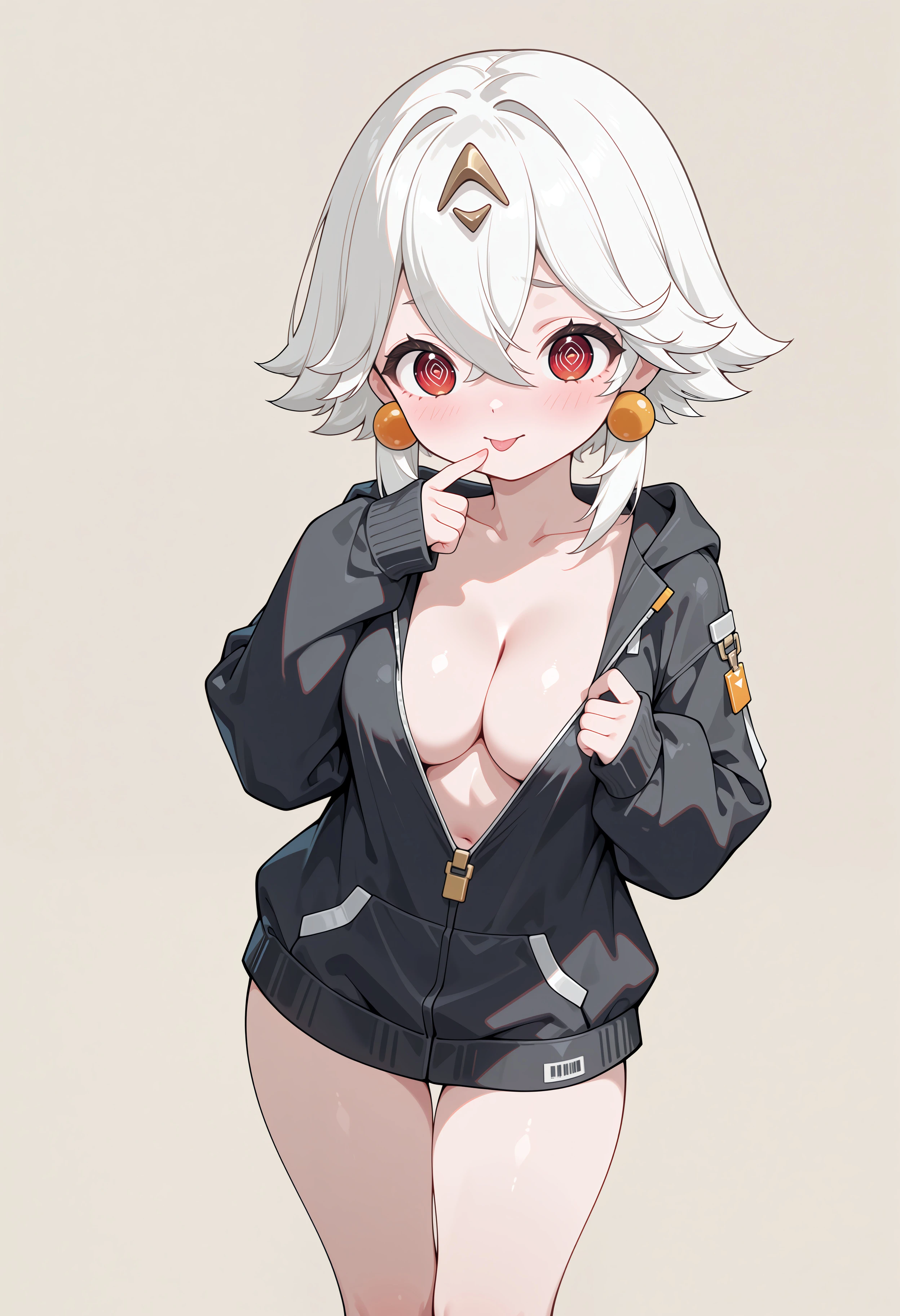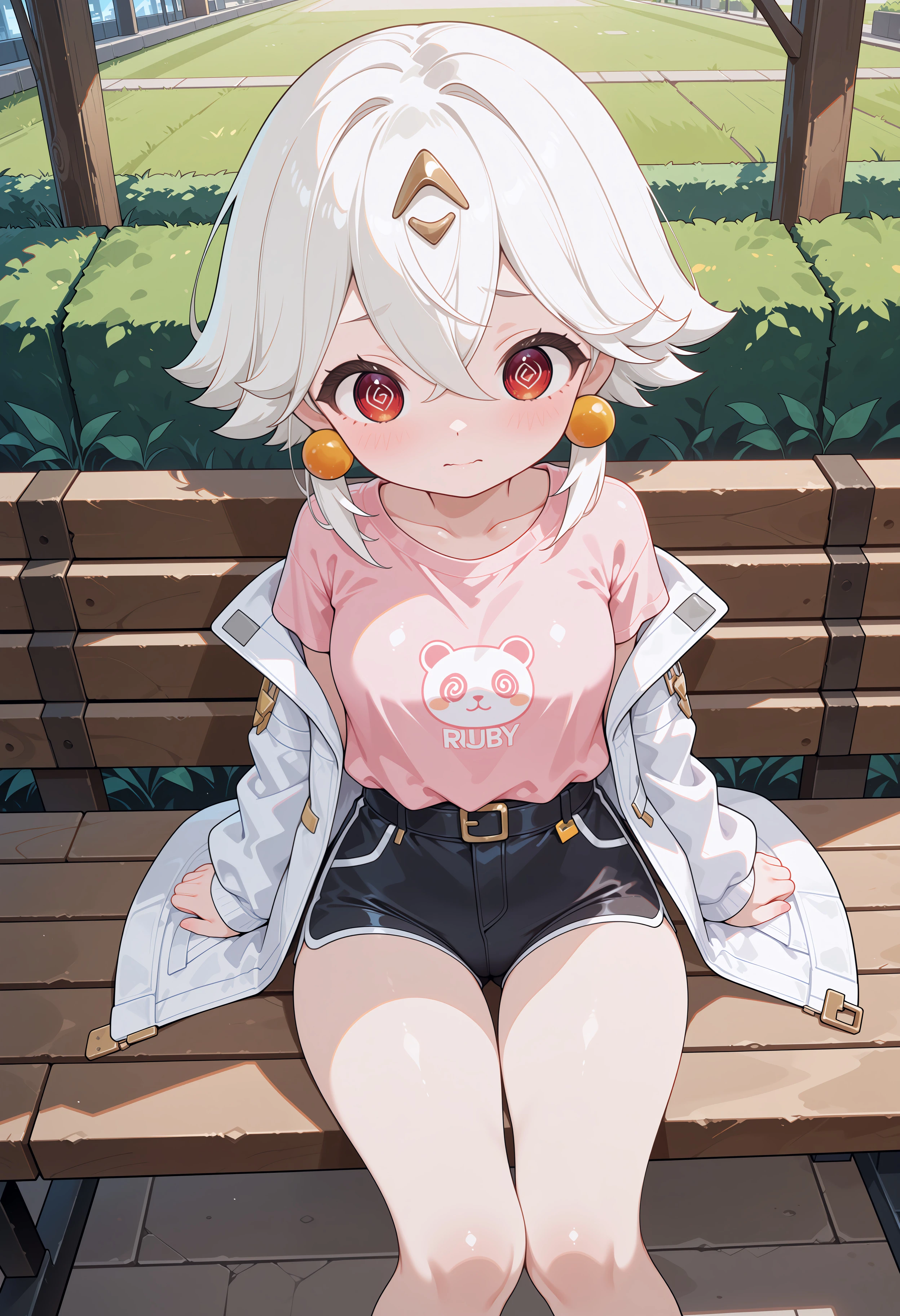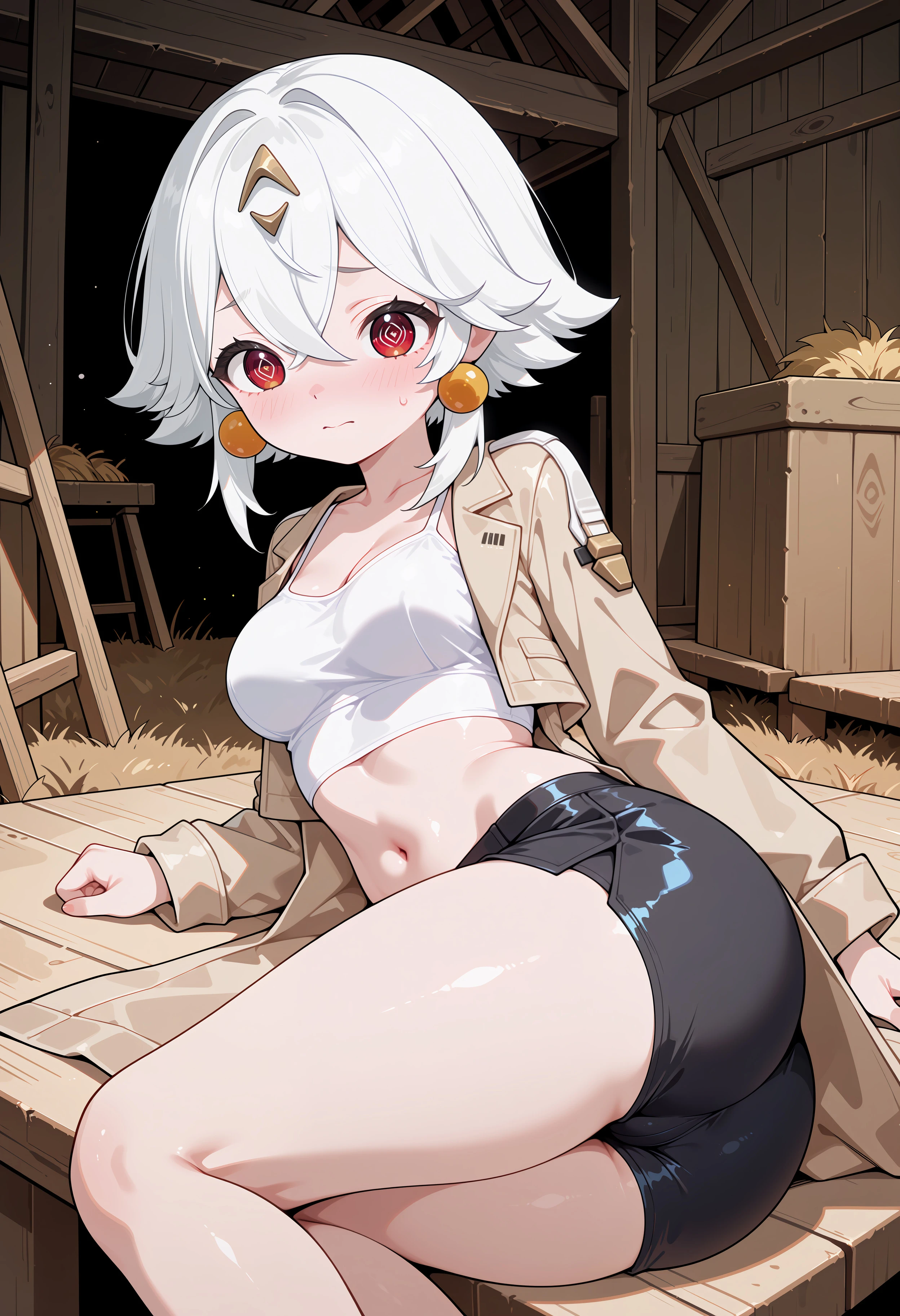 ruby \(tower of fantasy\), short hair, red eyes, white hair, earrings, hair ornament,