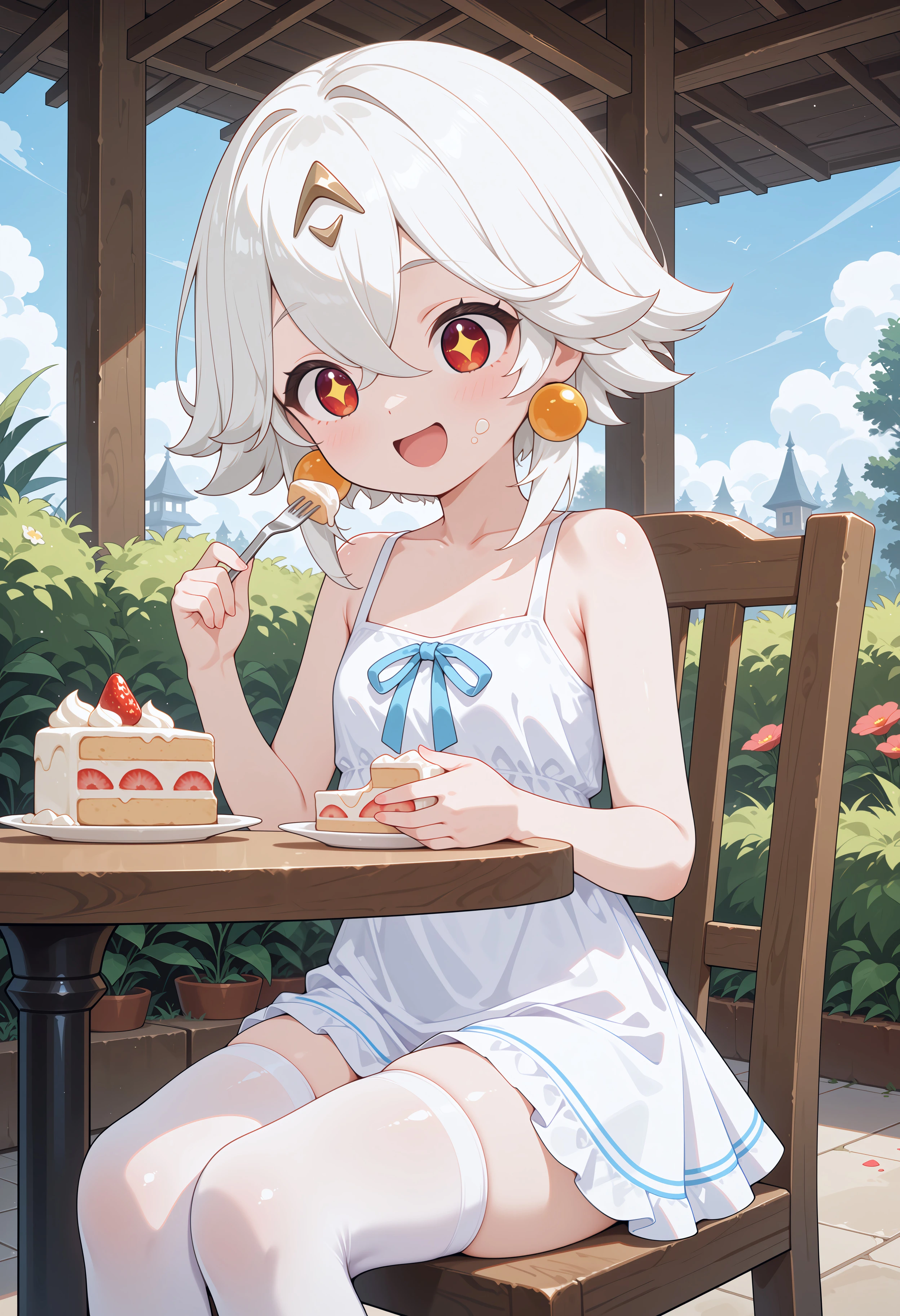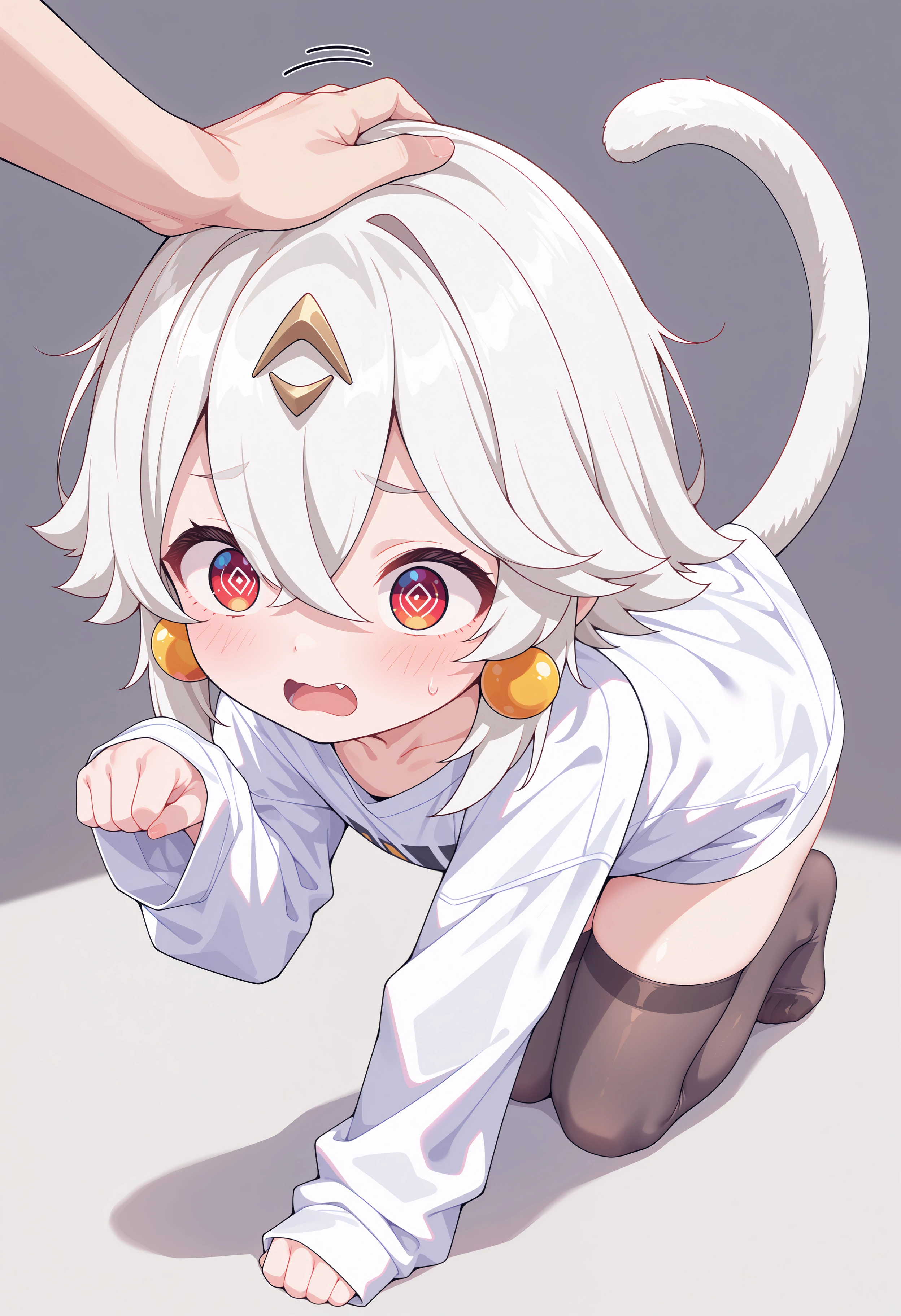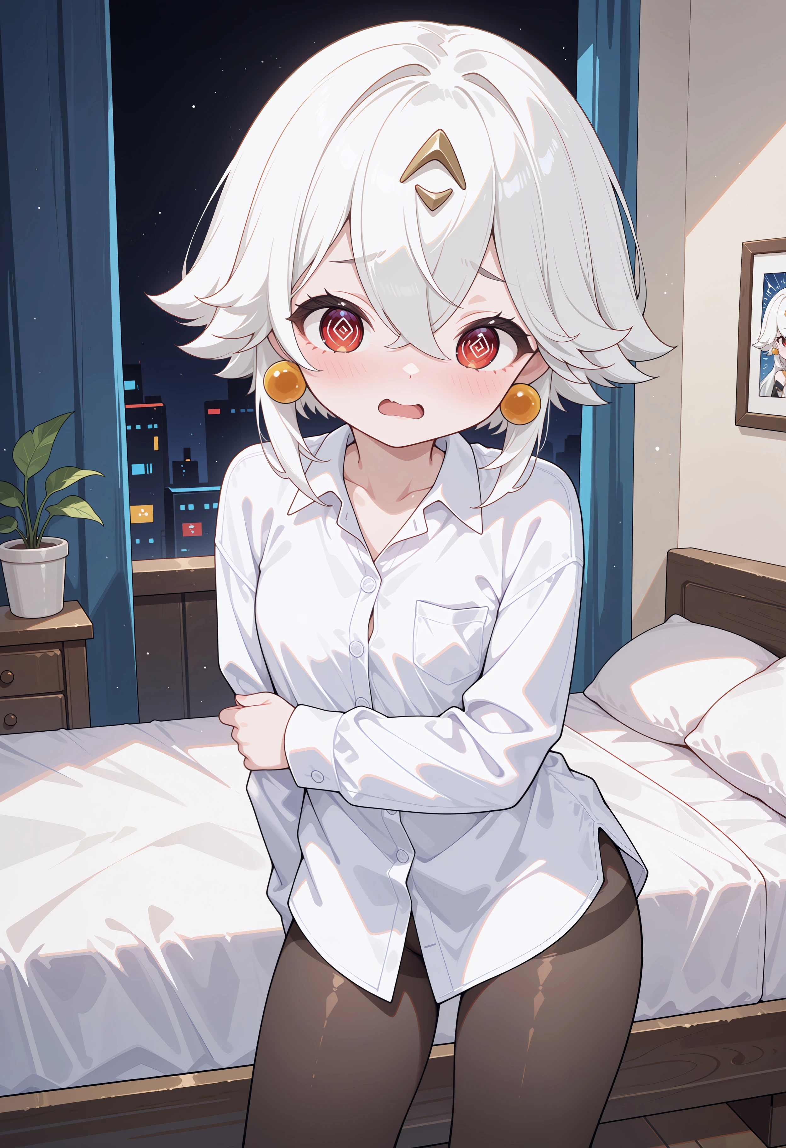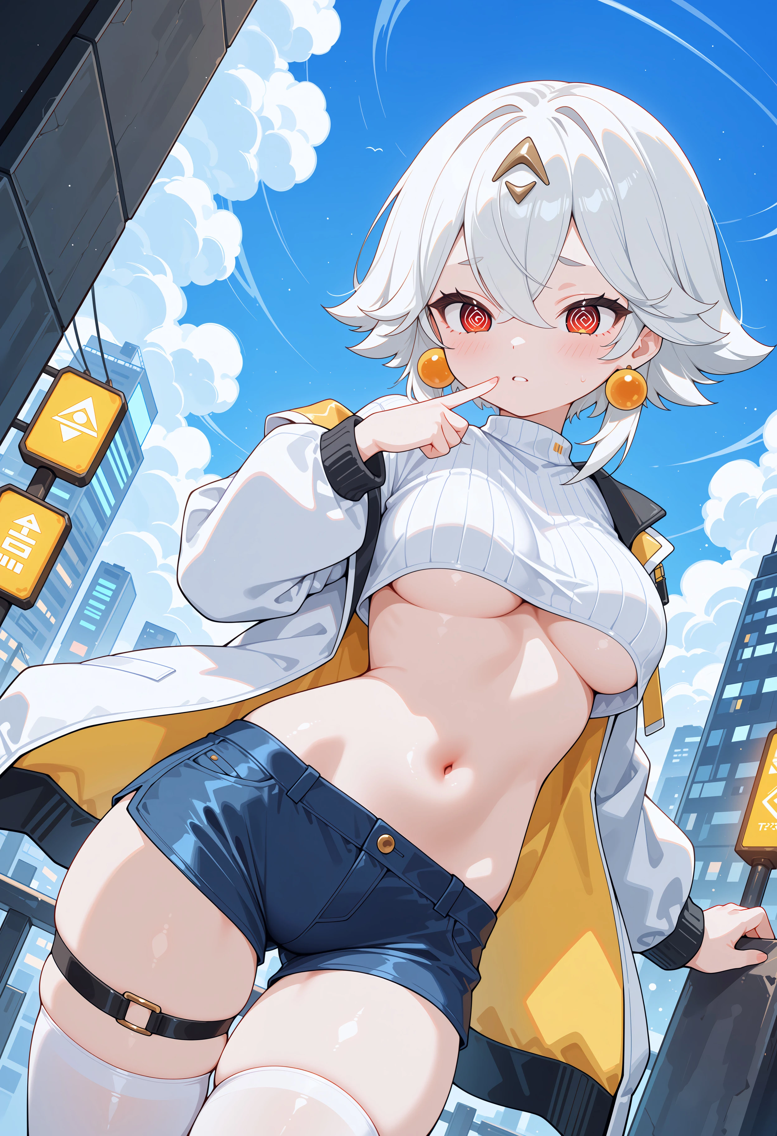 ruby \(tower of fantasy\), short hair, red eyes, white hair, earrings, hair ornament,
