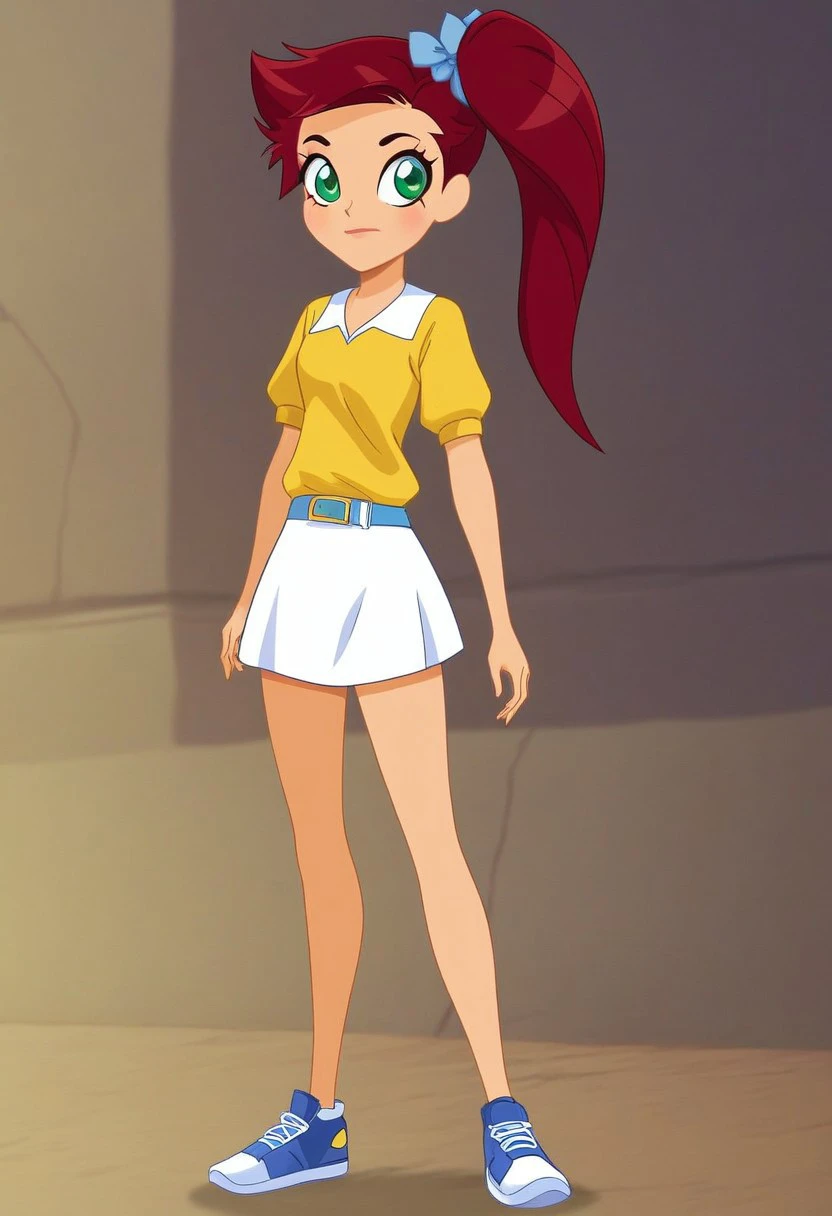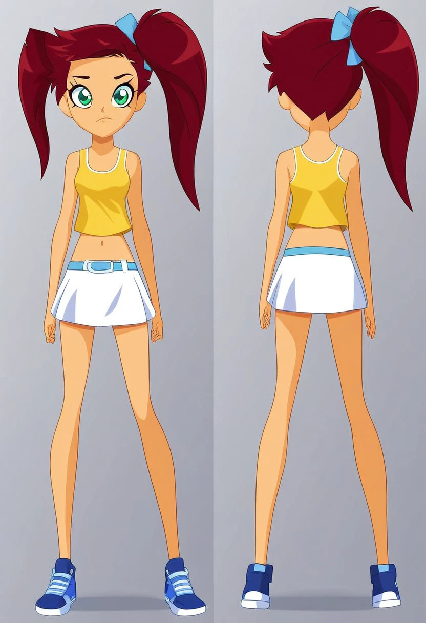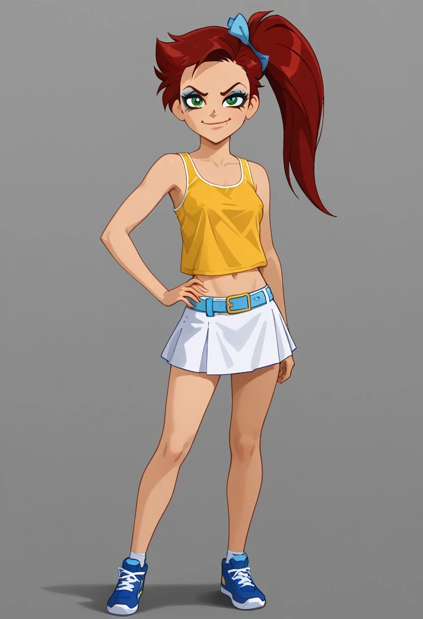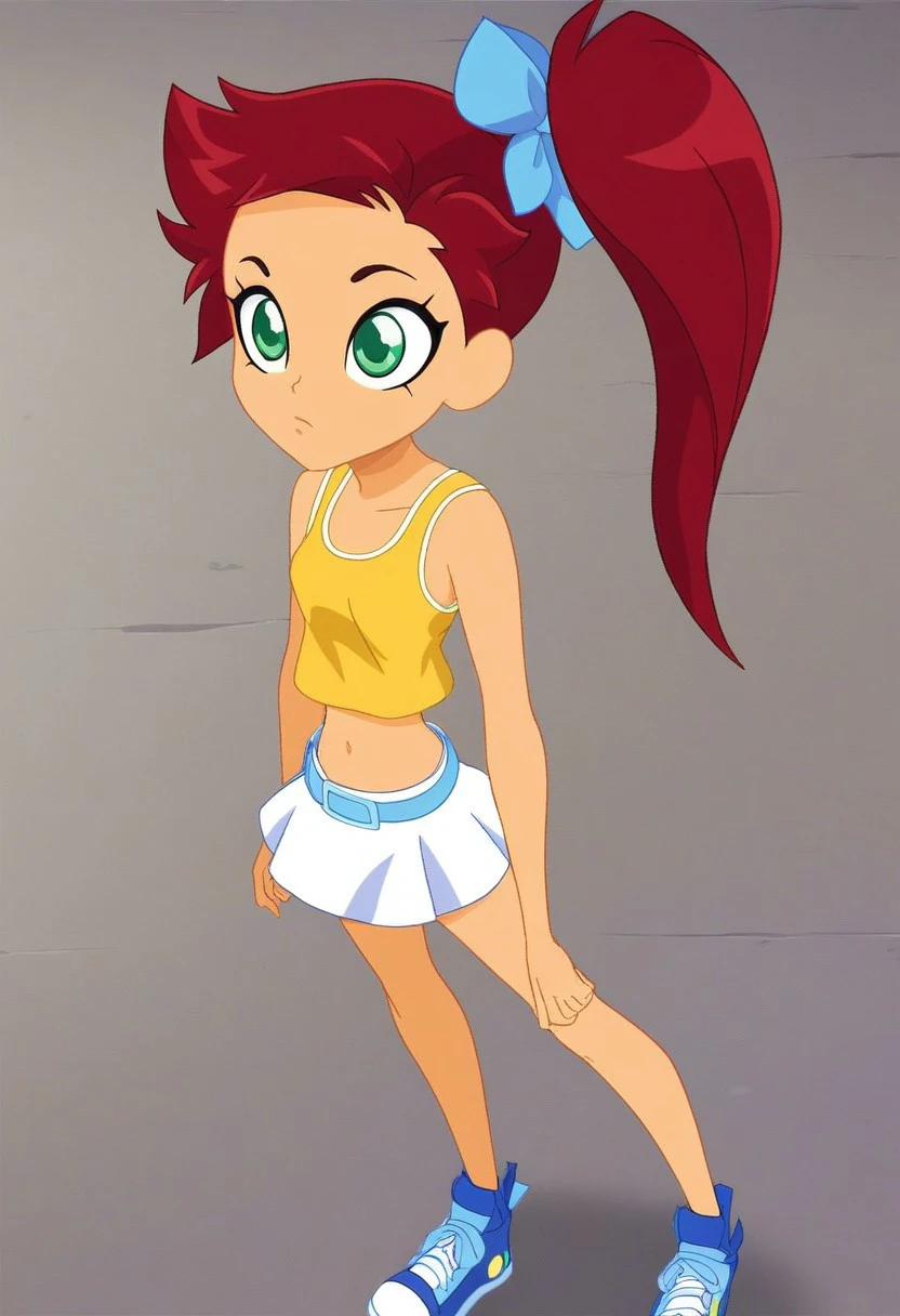 auriana, solo girl focus, shorty, skinny, side ponytail, long dark red hair with blue bow, bangs, huge open green eyes, white microskirt with blue belt, yellow tank top with open shoulder, blue sneakers, midriff, navel, eye makeup,