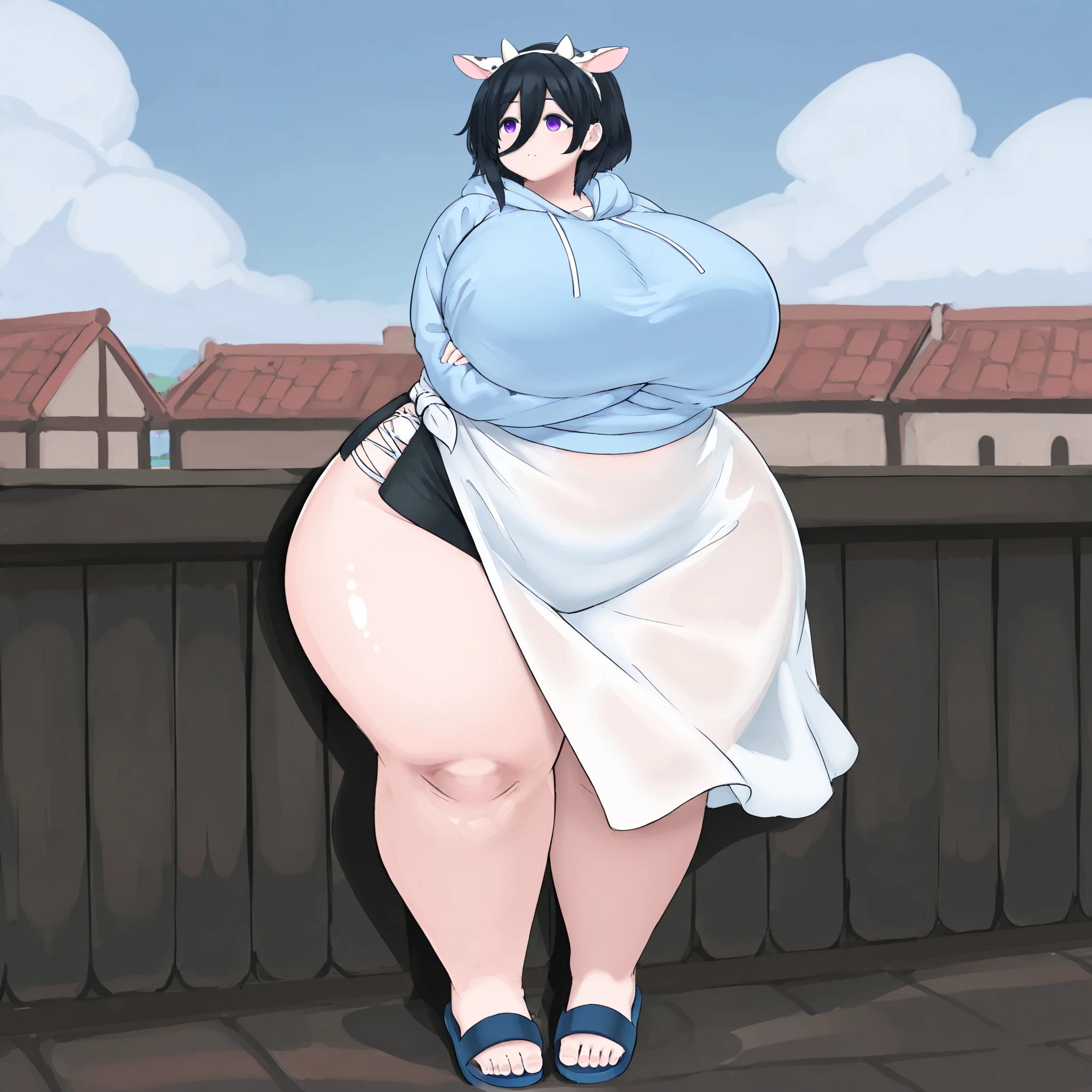 cowhoodie, hair between eyes, cow hairband, black laced shorts, light blue hoodie, white side sarong,