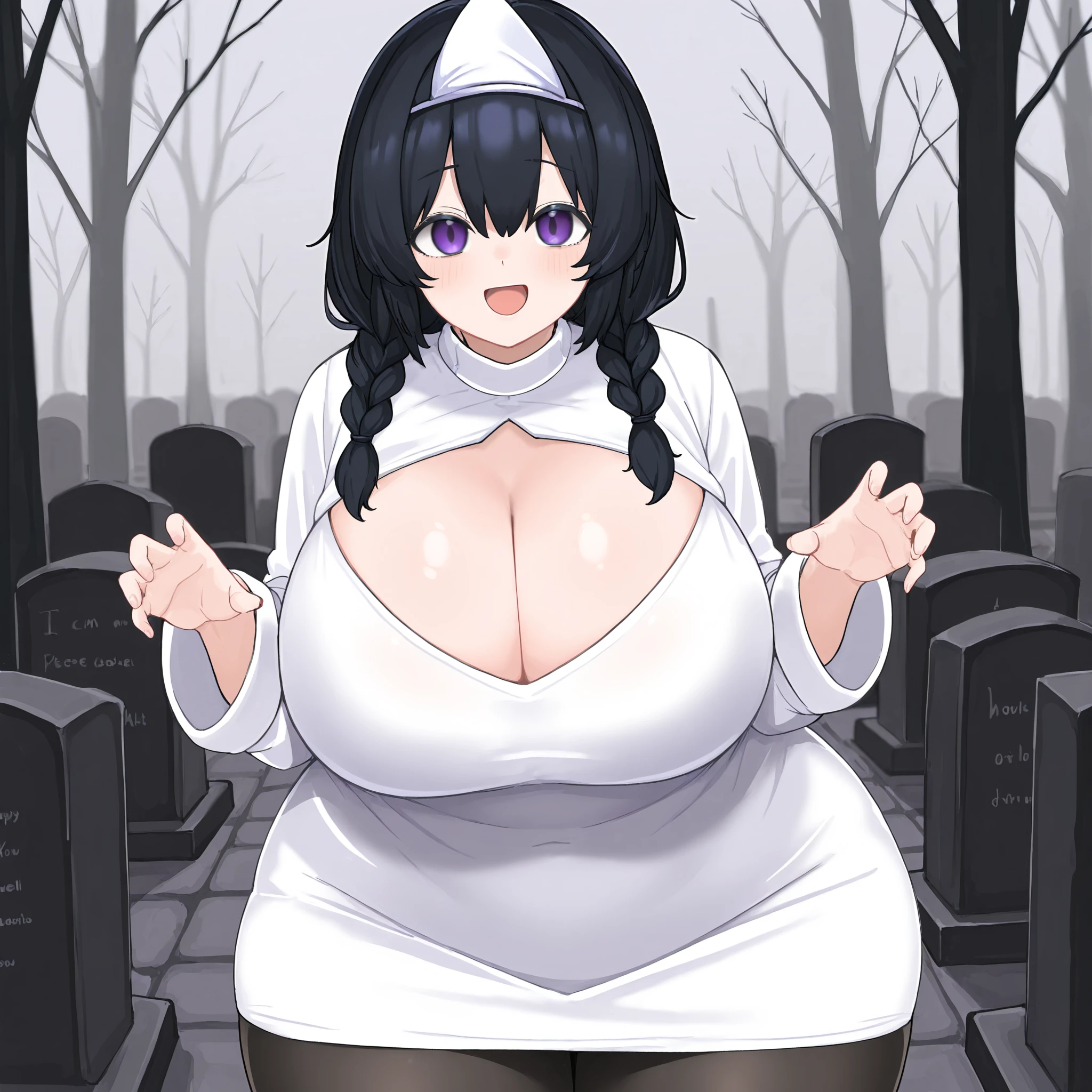 ghostoutfit, twin braids, triangular headpiece, white dress, cleavage, pantyhose
