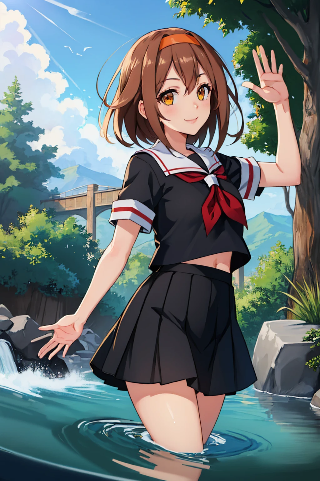 Default Outfit: school uniform, black serafuku, red neckerchief, short sleeves, black skirt