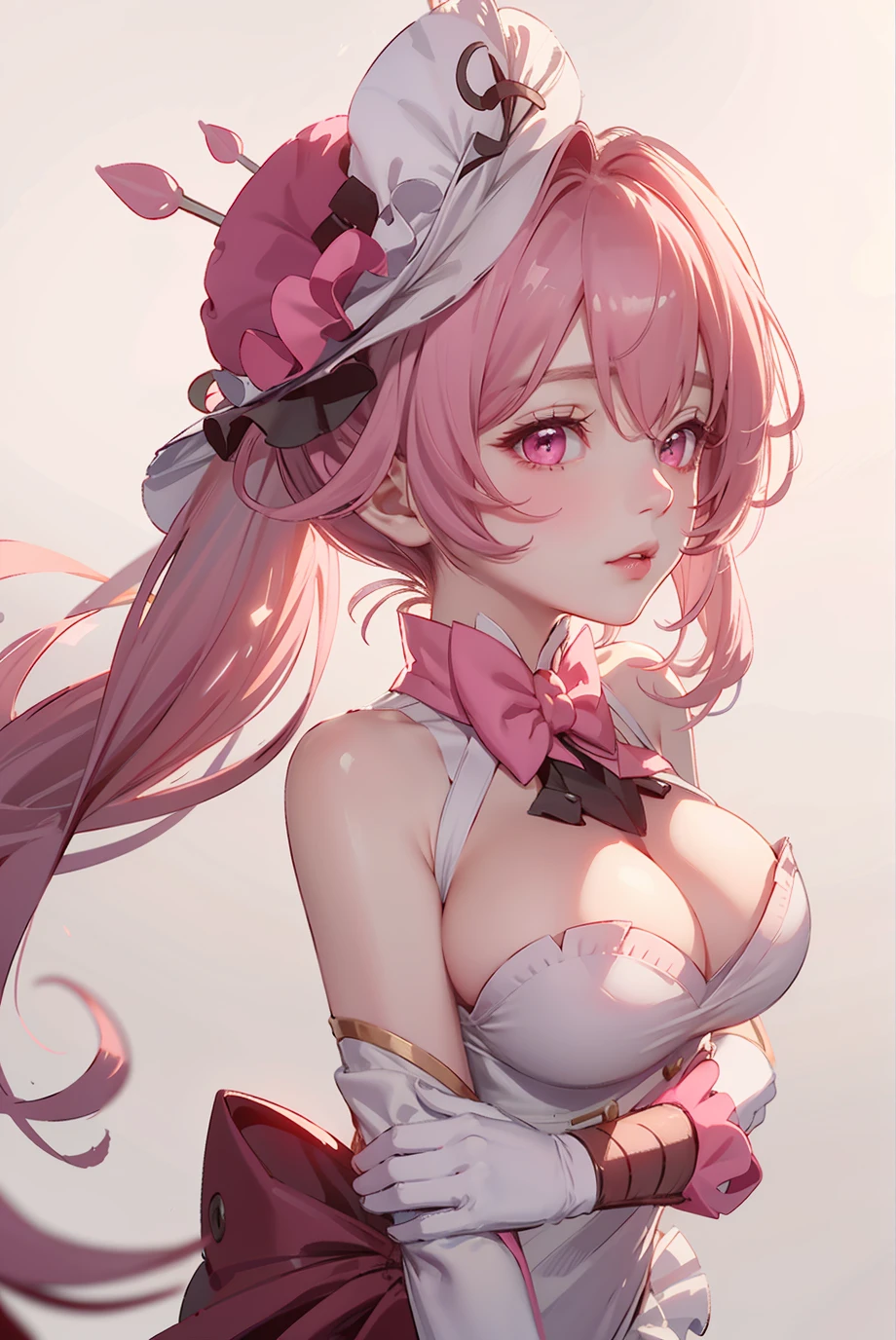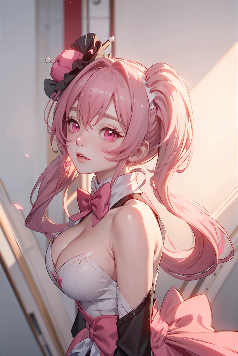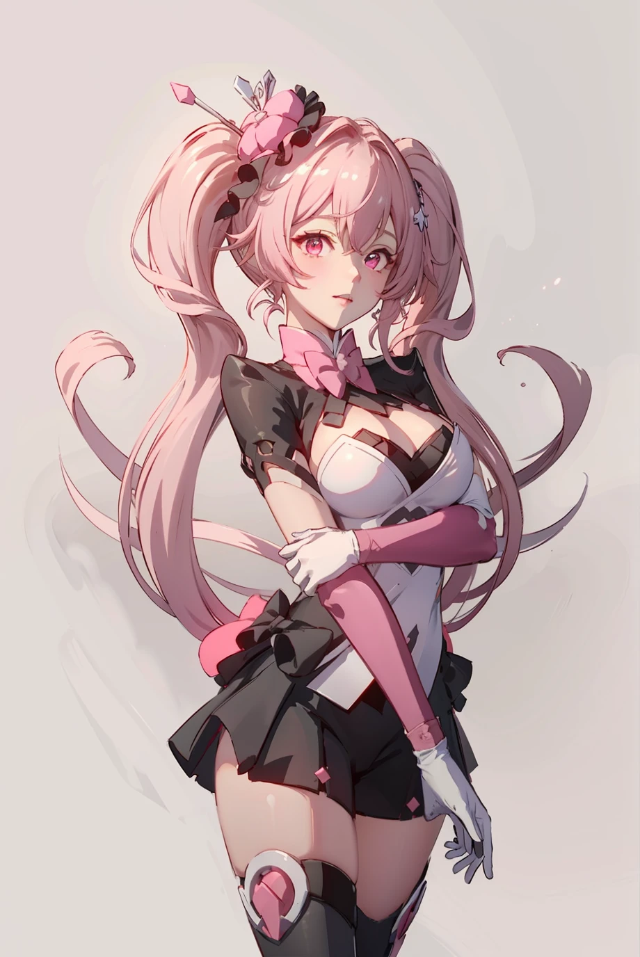 Eluya,1girl, pink eyes, solo, twintails, pink hair, gloves, long hair, thighhighs, hat, pink bow, white gloves, full body, looking at viewer, medium breasts, skirt, cleavage, pink bowtie