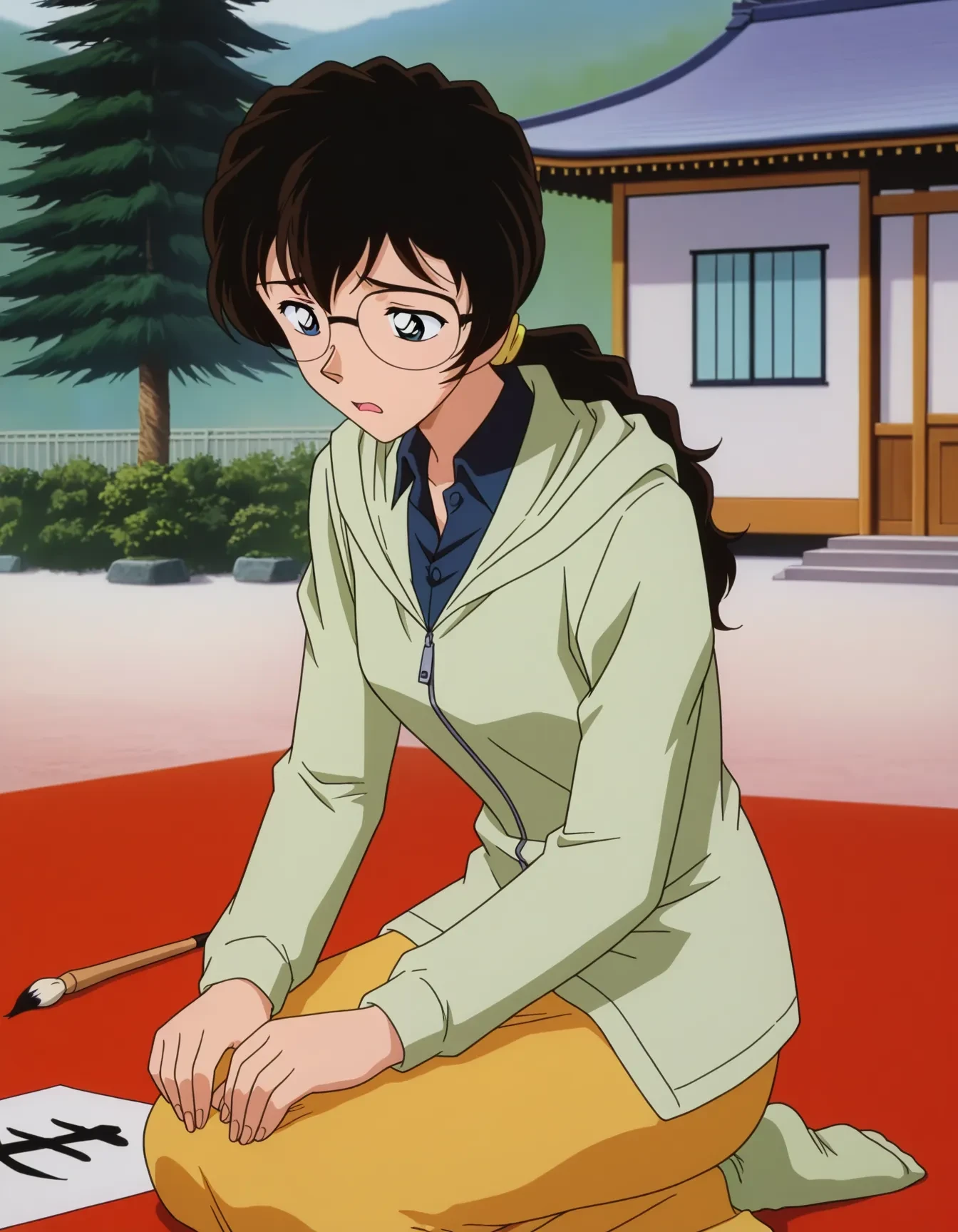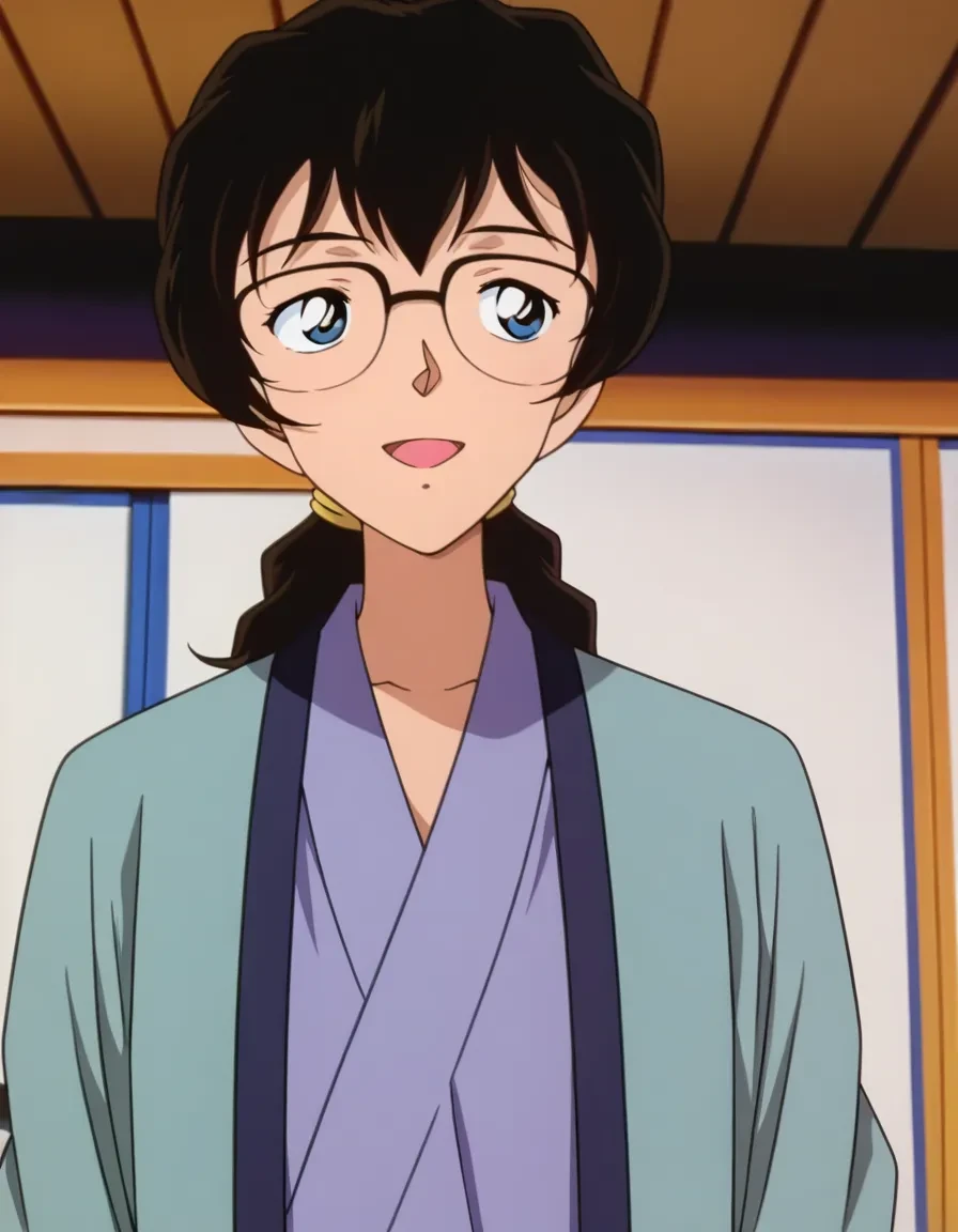 kawaguchi mizuki,black hair,long hair,hair between eyes,low ponytail,wavy hair,hair tie,glasses,