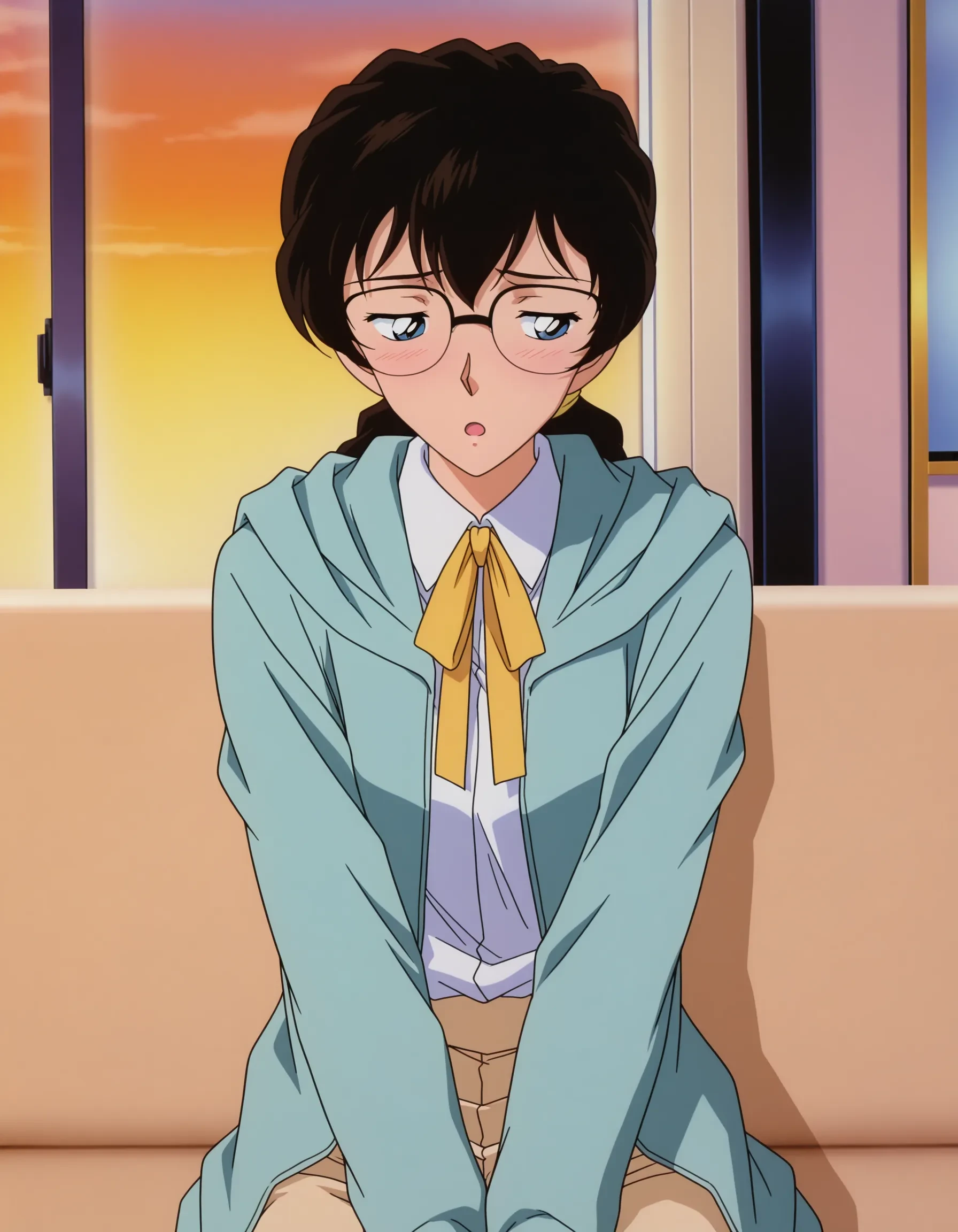 yellow ribbon,neck ribbon,aqua jacket,hooded jacket,,long sleeves,white shirt,collared shirt,beige pants,black footwear,