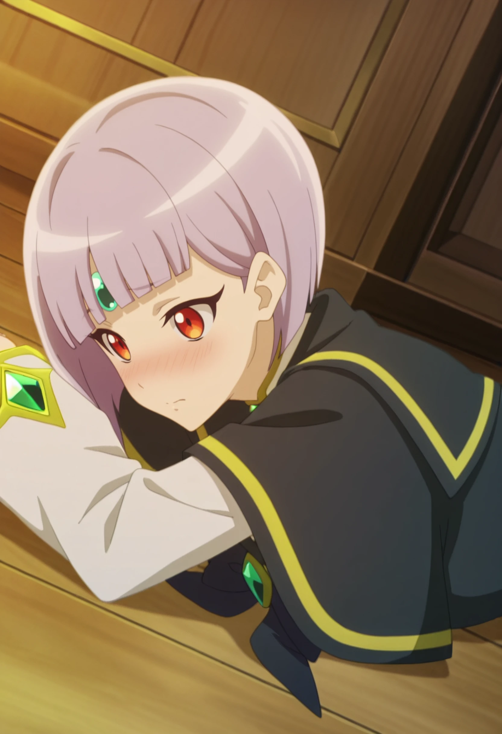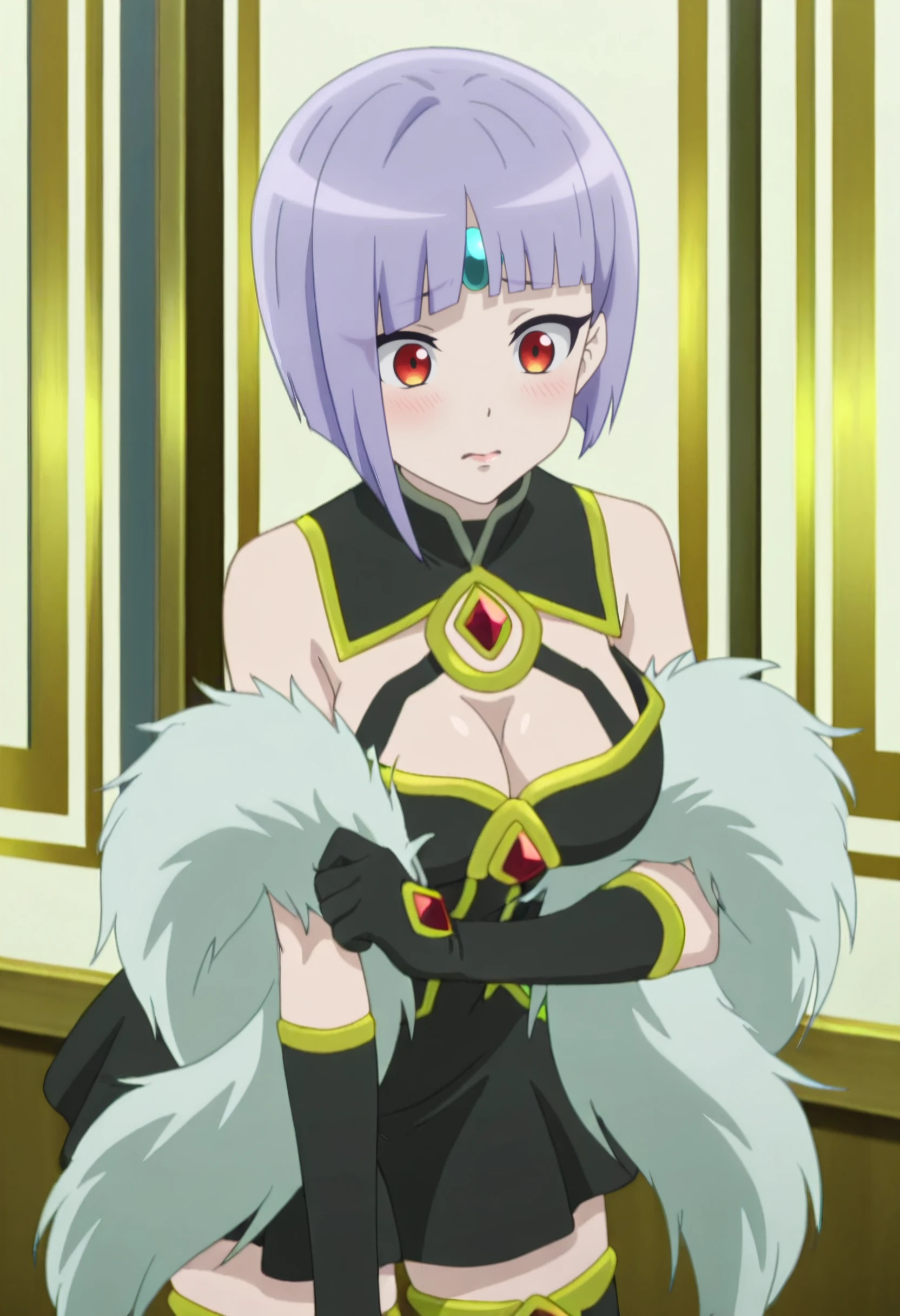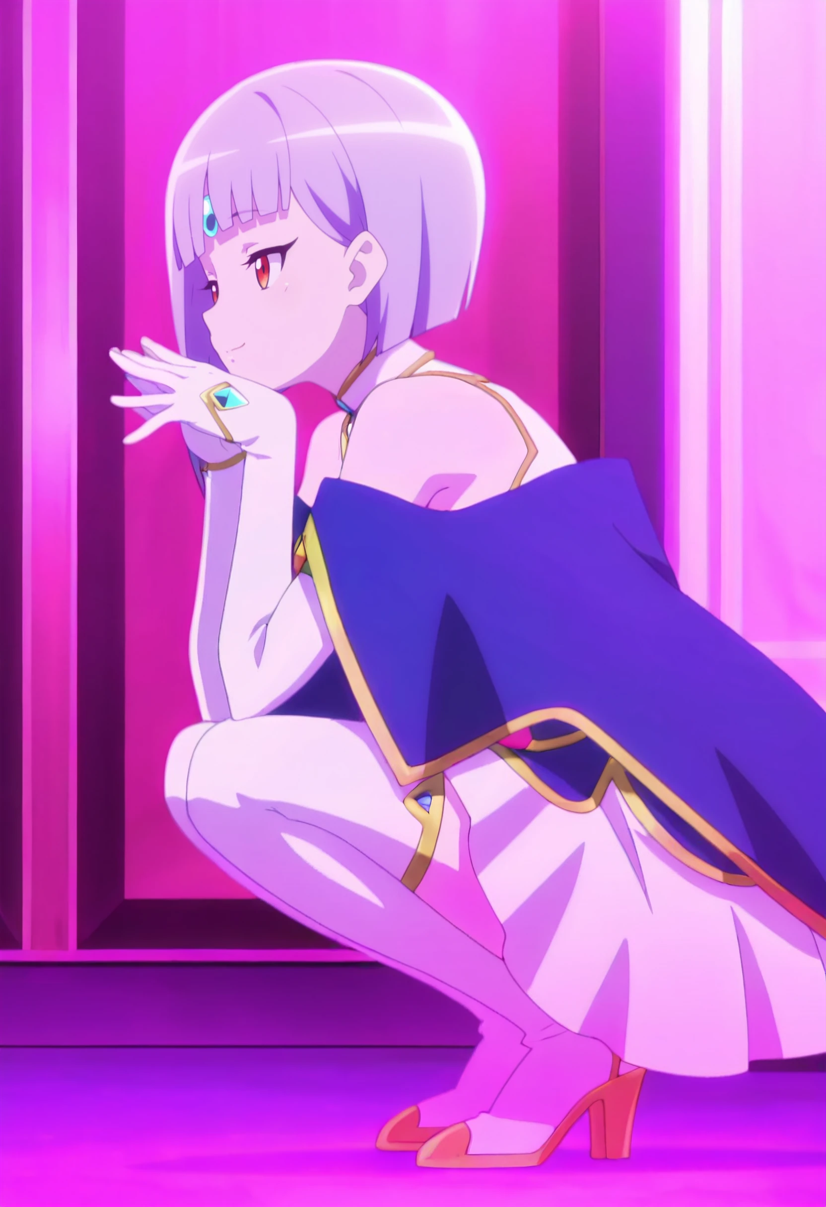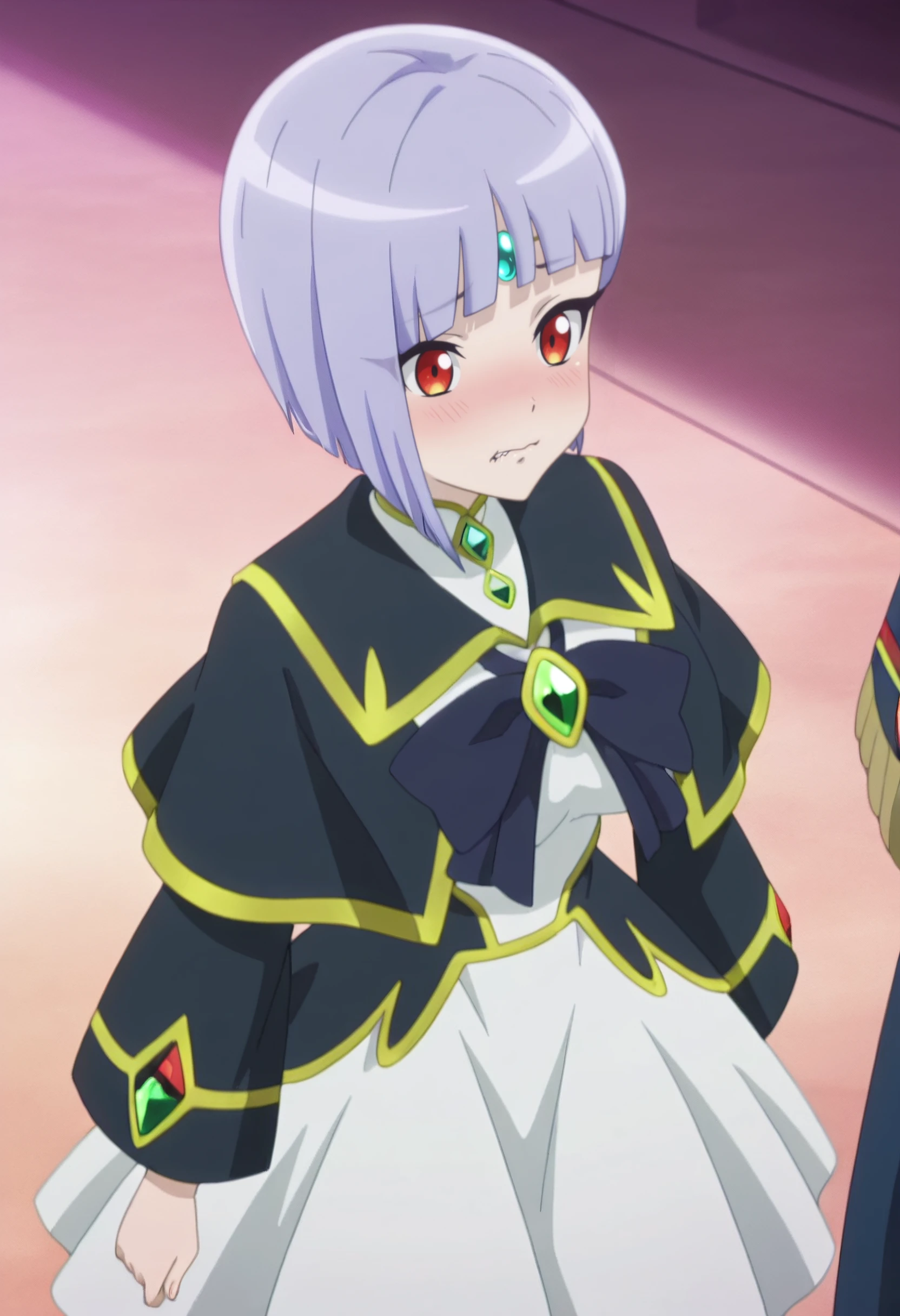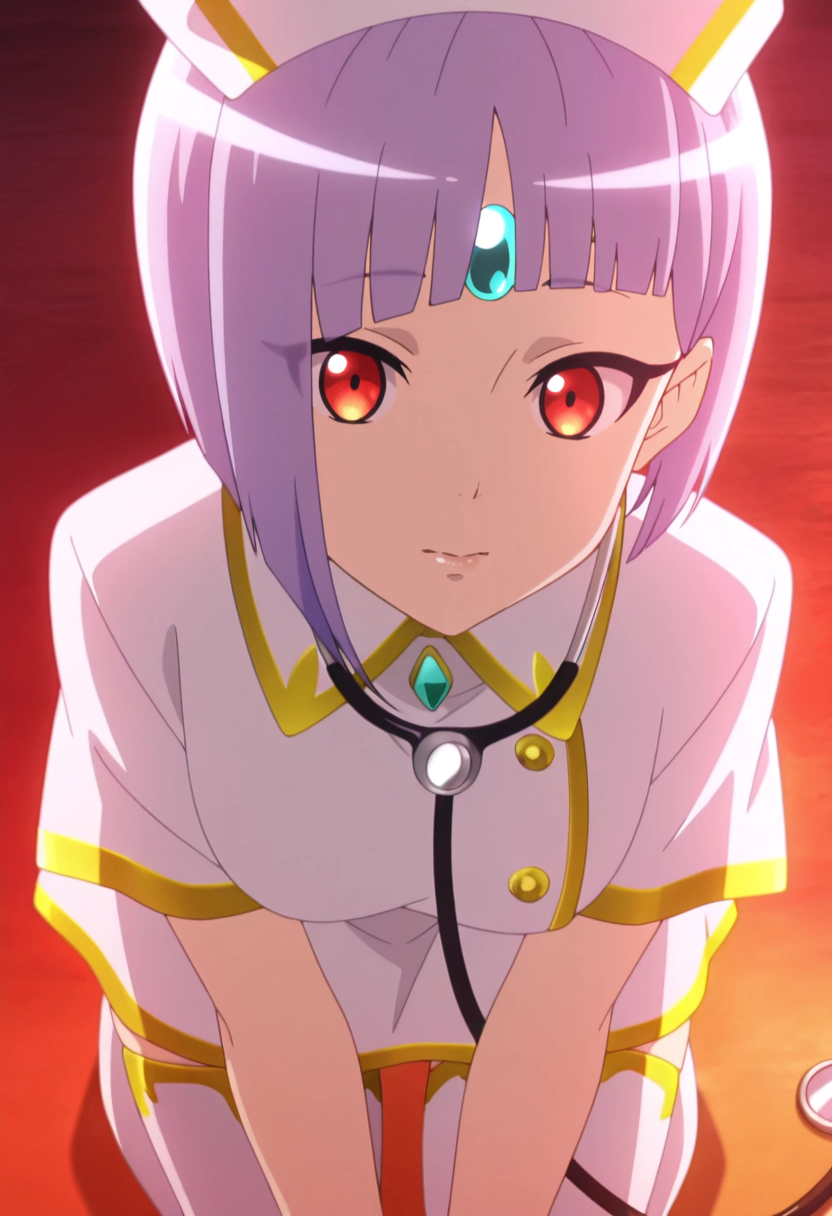 SPZSheama, short hair, red eyes, purple hair, blunt bangs, bob cut, inverted bob, hime cut, asymmetrical hair, forehead jewel,