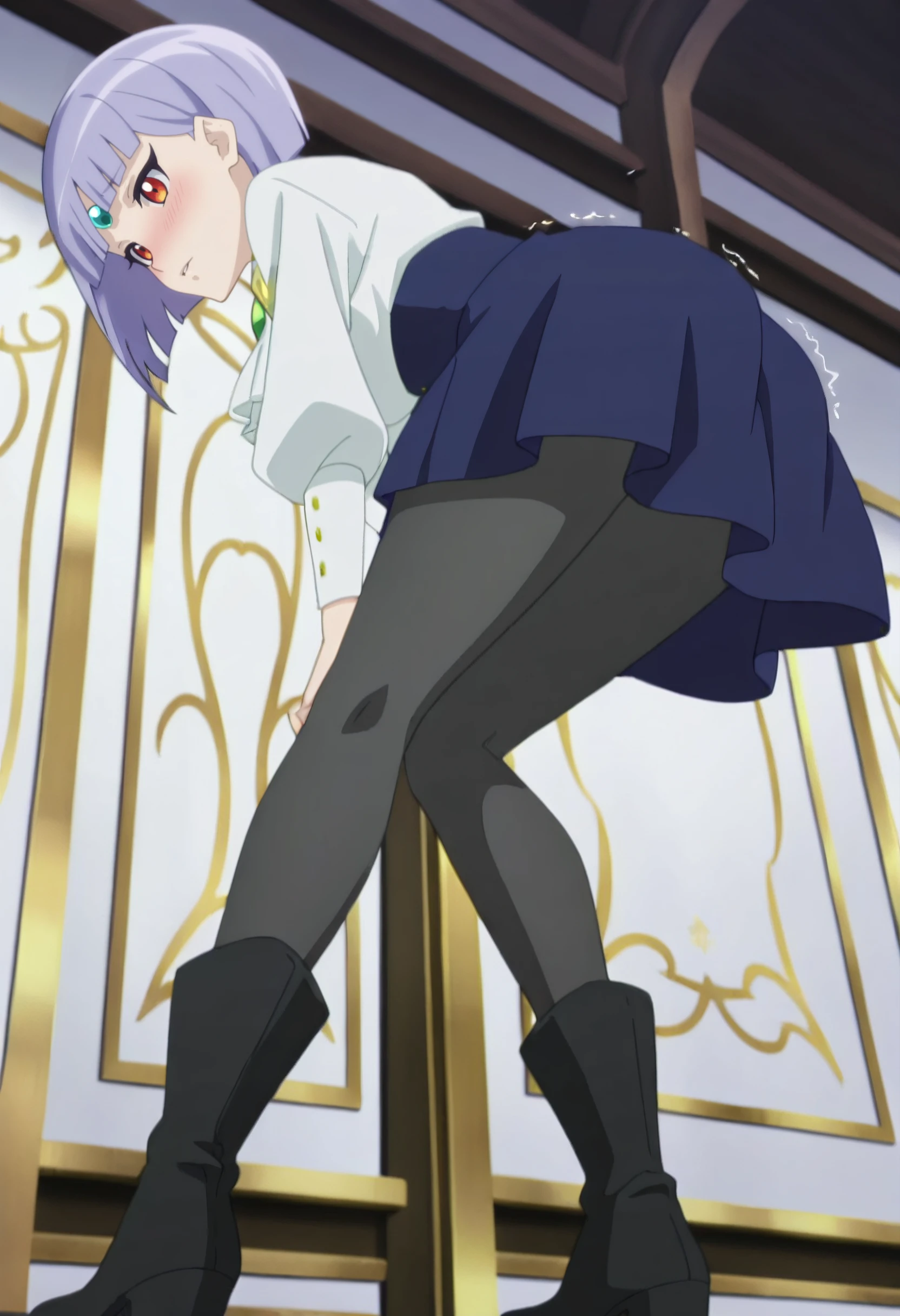 SheamaShirt, white shirt, blue skirt, circlet, long sleeves, bare shoulders, black pantyhose, white ascot, high-waist skirt, boots, green gemstone, black footwear,
