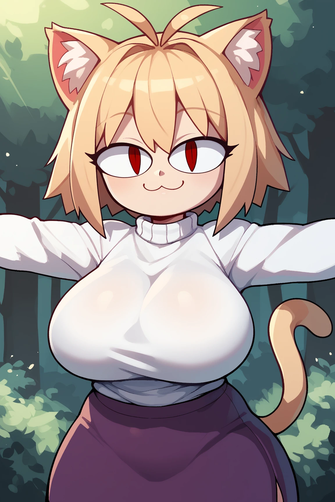 NecoArcTMPXL, shortstack, red eyes, slit eyes, blonde hair, short hair, bangs, antenna hair, animal ears, cat ears, animal fluff ears, cat tail, large breasts, white sweater, long sleeves, purple skirt, black pantyhose, black socks
