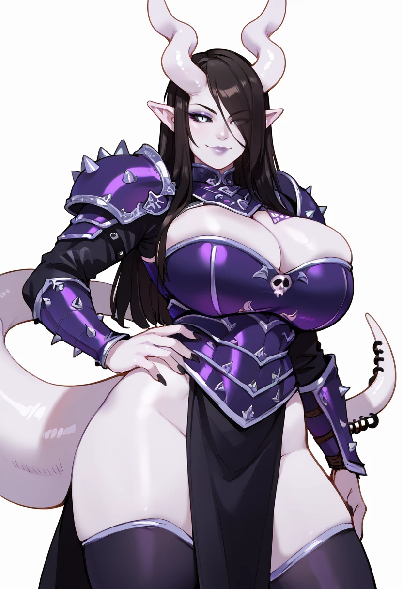 1girl, Bekka, succubus, horns, black sclera, heart horns, unusual skin tone, white skin, grey skin, albino, black hair, tail, thick tail, colored skin, long hair, demon girl, monster girl, claws, huge breasts,