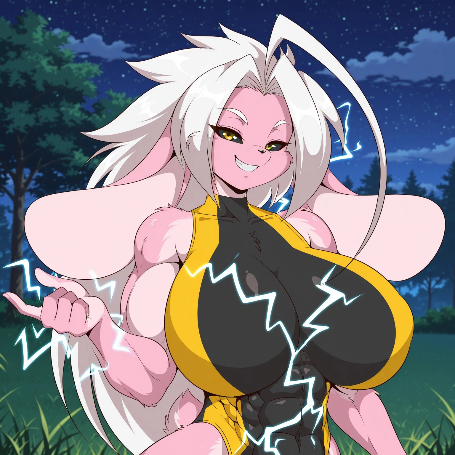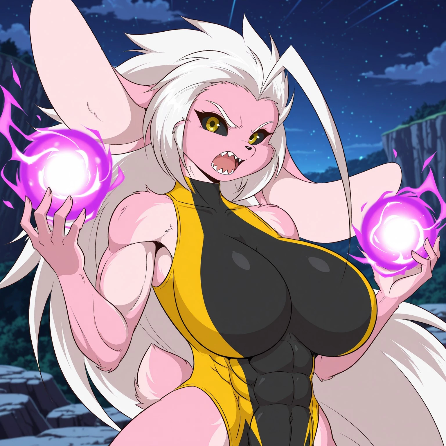Positive Prompts: XeikoMG, furry female, anthro, lagomorph, rabbit, light-pink inner ears, big ears, white eyebrows, black sclera, yellow eyes, dark-yellow pupils, white hair, black nose, very long hair, pink body, pink fur, light-pink body, light-pink fur, two tone body, two tone fur, muscular female, abs, big breasts, short tail