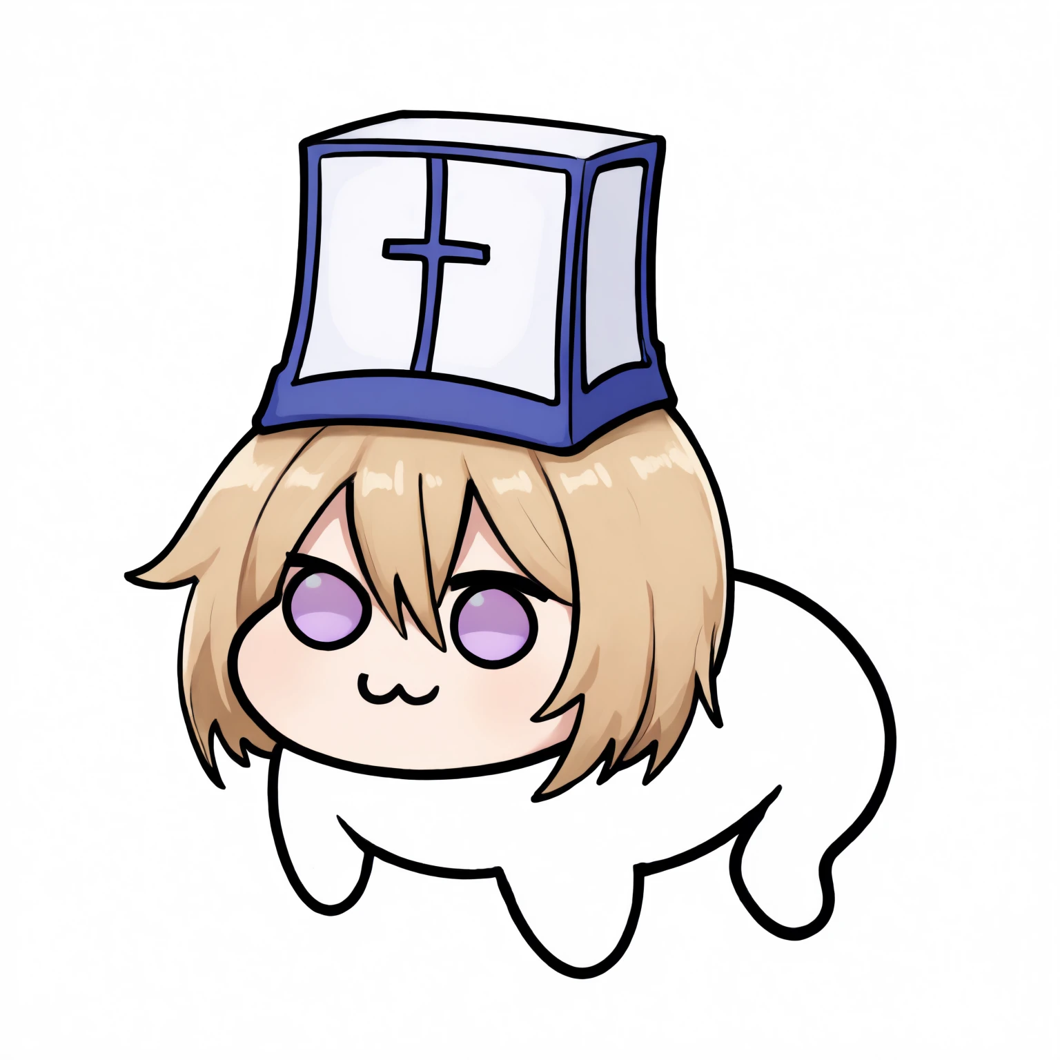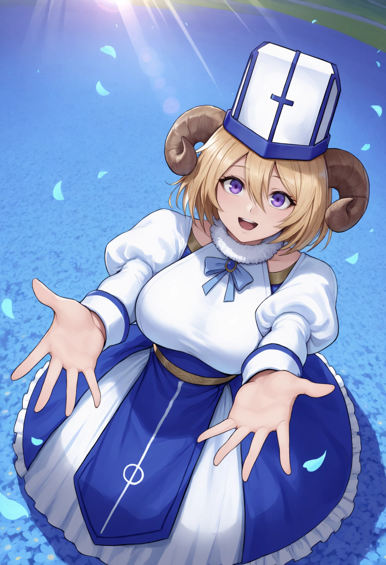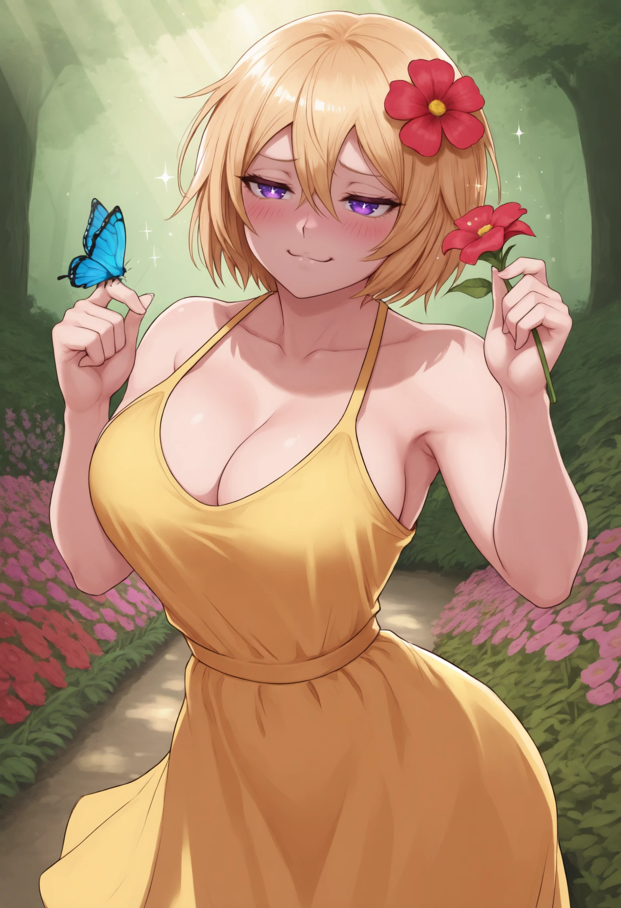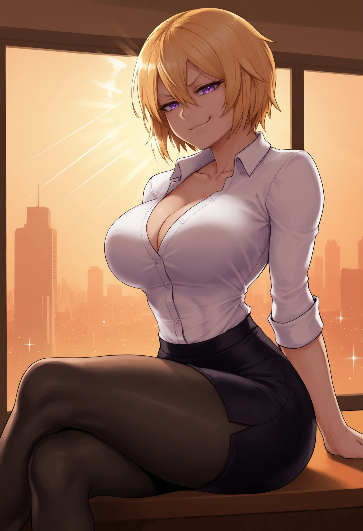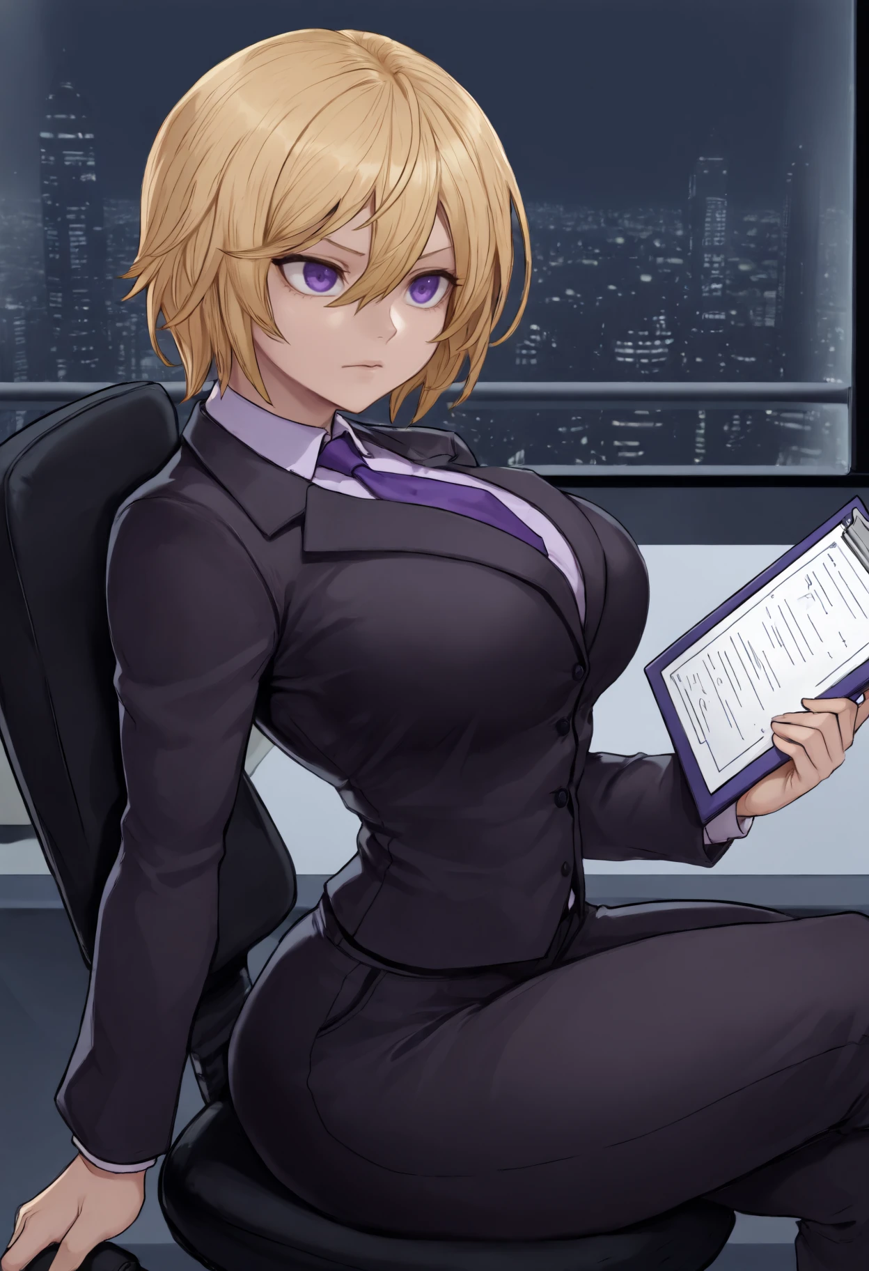 "purple eyes, short hair, hair between eyes, blonde hair, large breasts"