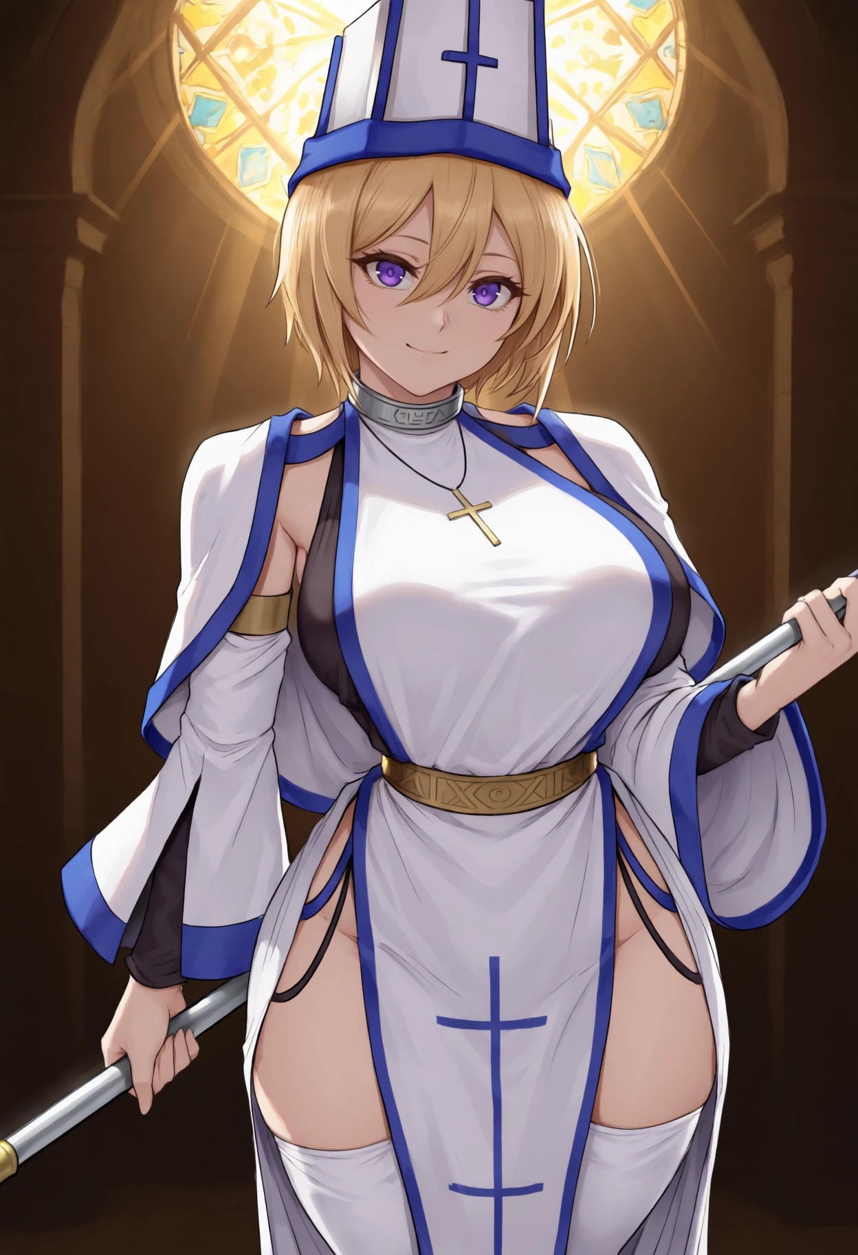 Priest outfit: "mitre, white headwear, collar, cross necklace, white caplet, white dress, black shirt, tabard, detached sleeves, wide sleeves, belt, white thighhighs, print dress"