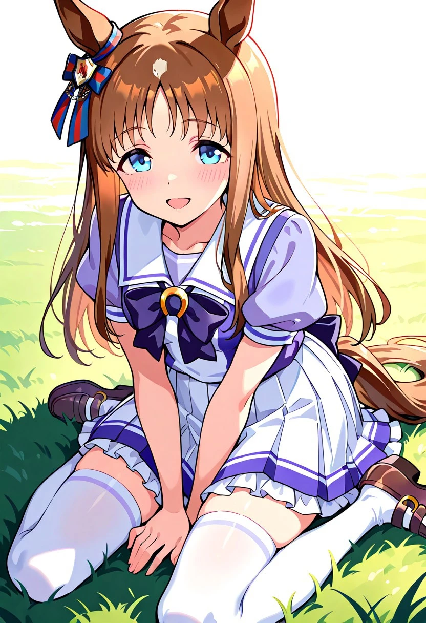 tracen school uniform, sailor collar, sailor shirt, purple shirt, puffy short sleeves, puffy sleeves, purple bow, purple bowtie, white skirt, pleated skirt, miniskirt, frilled skirt, frills, white thighhighs, zettai ryouiki, brown footwear, shoes, horseshoe ornament, summer uniform, serafuku