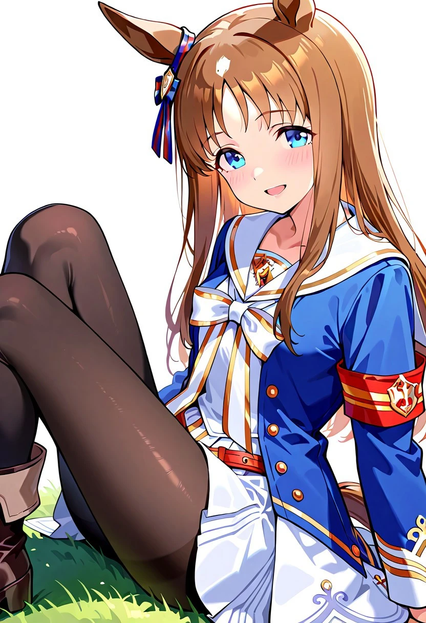 blue jacket, white sailor collar, white dress, white skirt, black pantyhose, white footwear, black footwear, brown footwear, boots, white bow, red armband, mismatched footwear, asymmetrical footwear, long sleeves