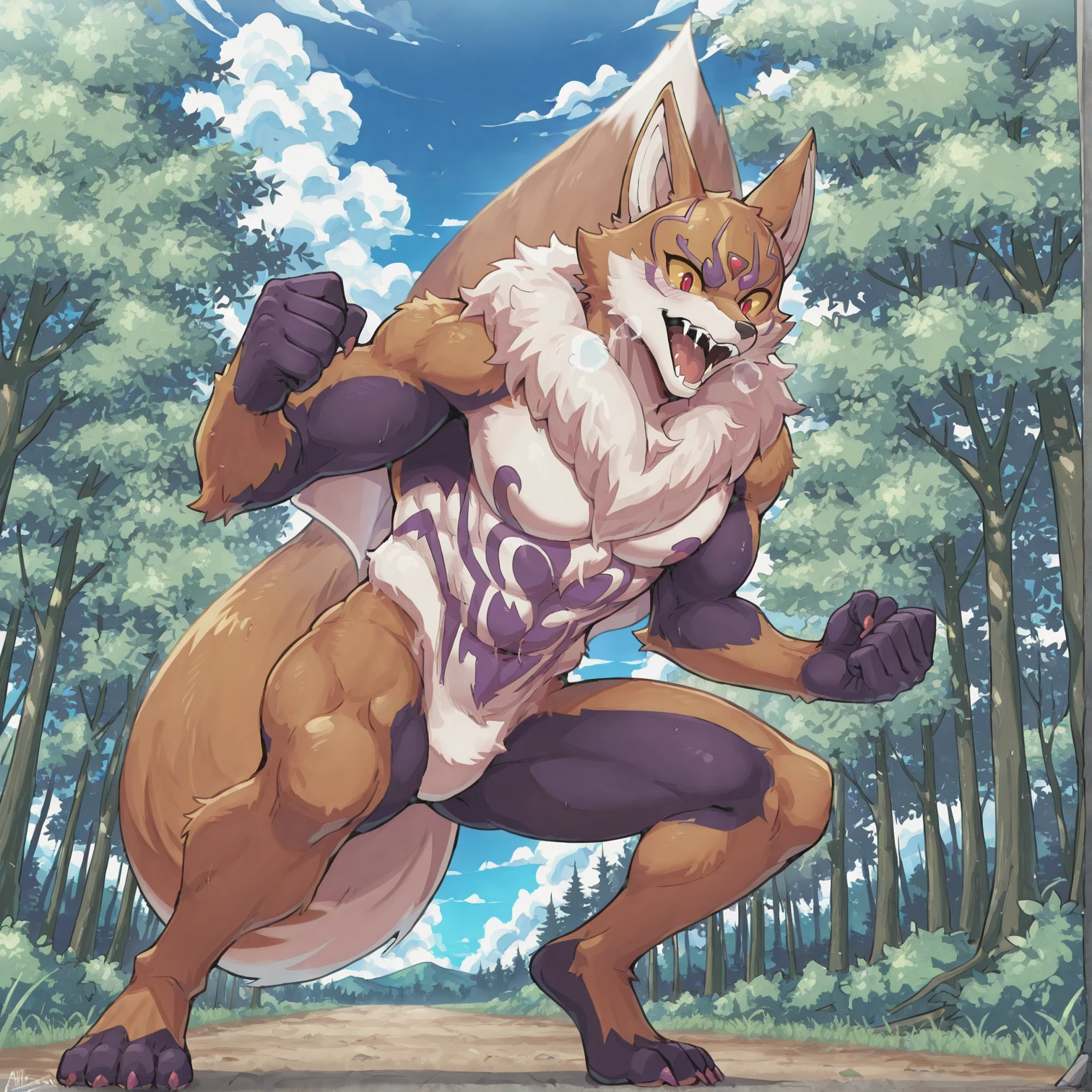 Fox Evo,fox,Anthro,forehead gem,red eyes,yellow sclera,purple markings,tan body,5 fingers,claws,3 toes,tail