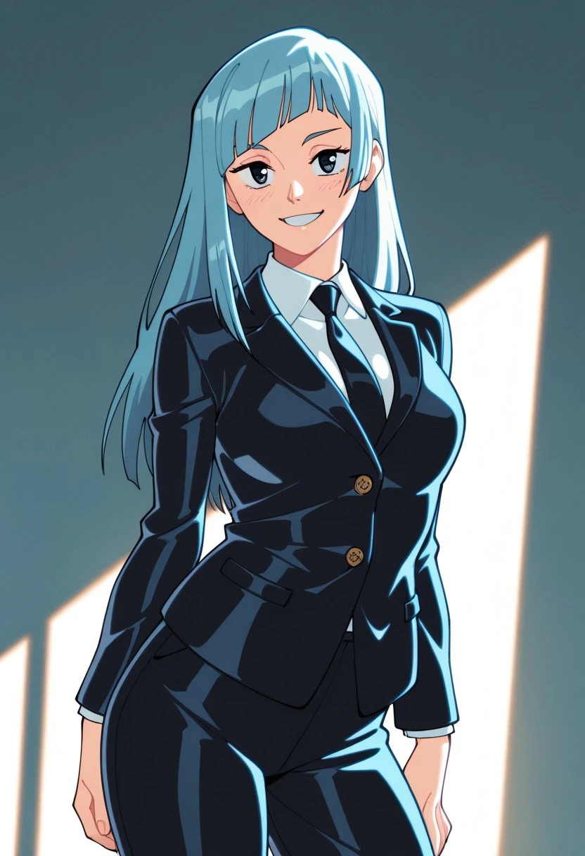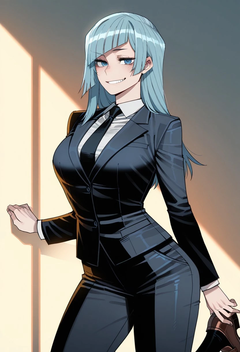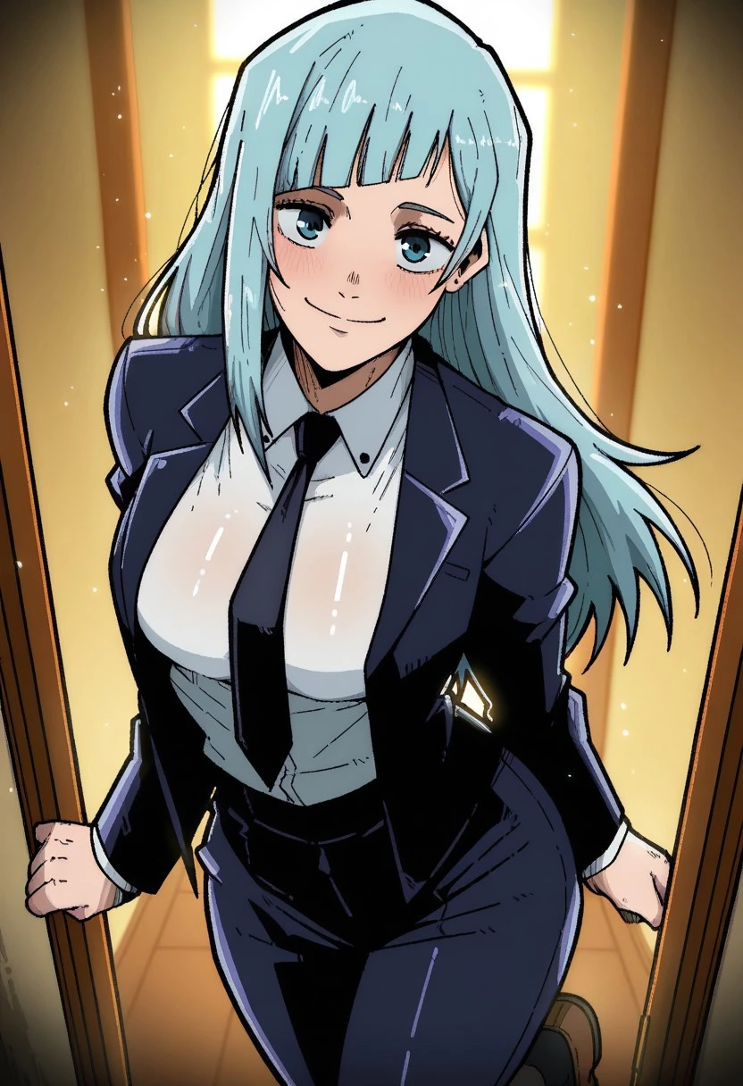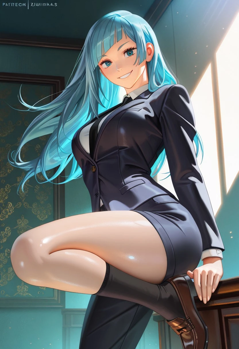 Miwa Kasumi from Jujutsu Kaisen, long hair, cyan blue hair, diagonal bangs, sidelocks, cyan blue eyes, pant suit, long sleeves, black jacket, white shirt, collared shirt, black necktie, long black pants, black socks, brown footwear, loafers, medium ,