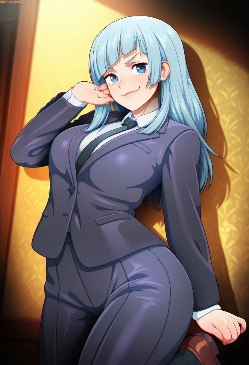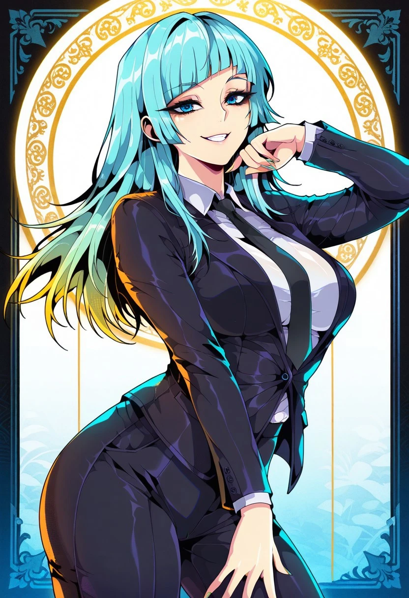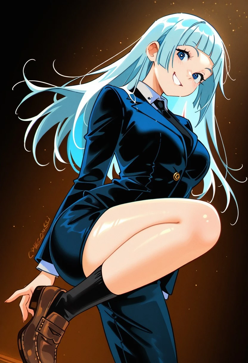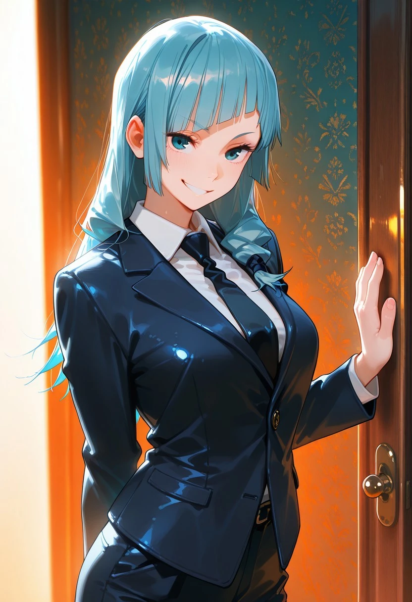Miwa Kasumi from Jujutsu Kaisen, long hair, cyan blue hair, diagonal bangs, sidelocks, cyan blue eyes, pant suit, long sleeves, black jacket, white shirt, collared shirt, black necktie, long black pants, black socks, brown footwear, loafers, medium ,