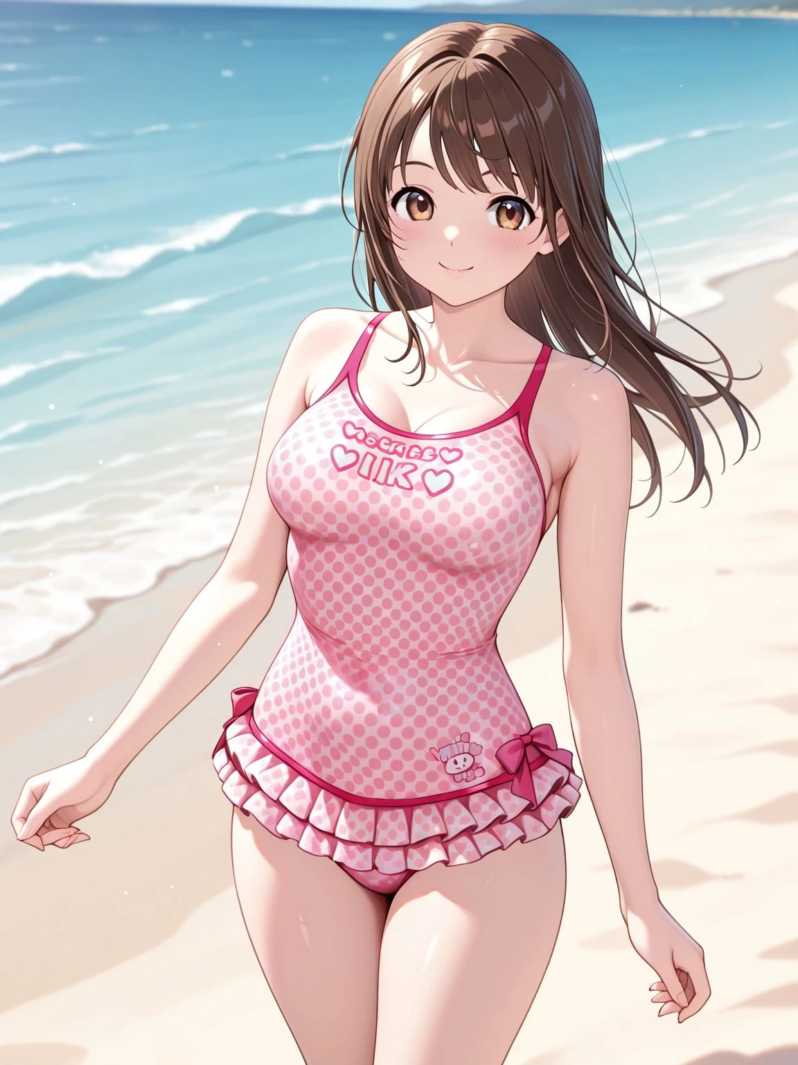 swimsuit,one-piece swimsuit,pink one-piece swimsuit,casual one-piece swimsuit,frilled swimsuit,frills,polka dot,polka dot swimsuit,clothes writing