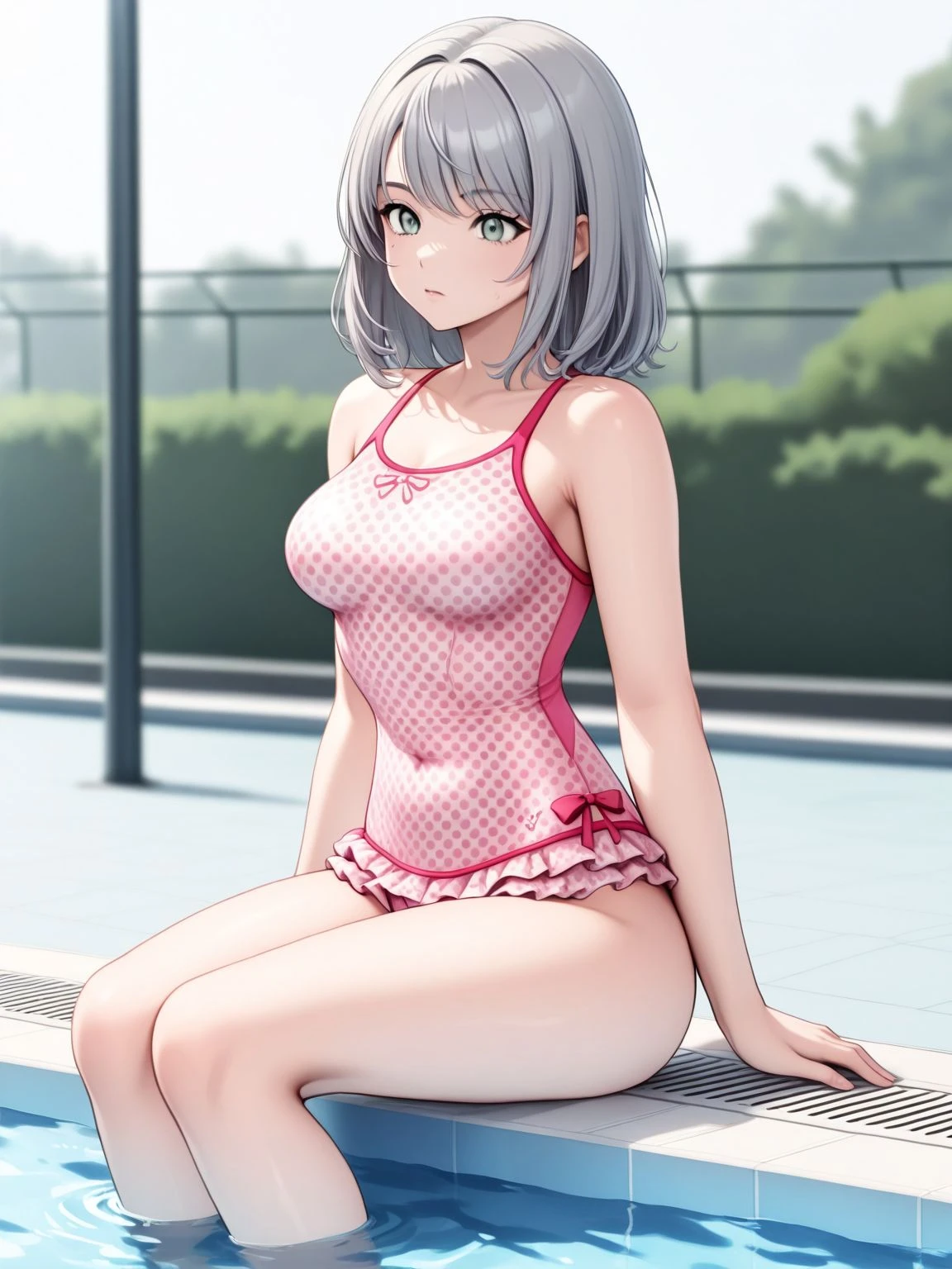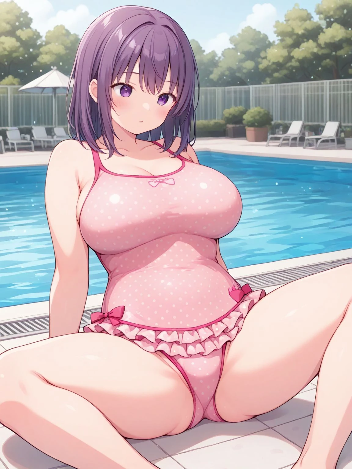 swimsuit,one-piece swimsuit,pink one-piece swimsuit,casual one-piece swimsuit,frilled swimsuit,frills,polka dot,polka dot swimsuit