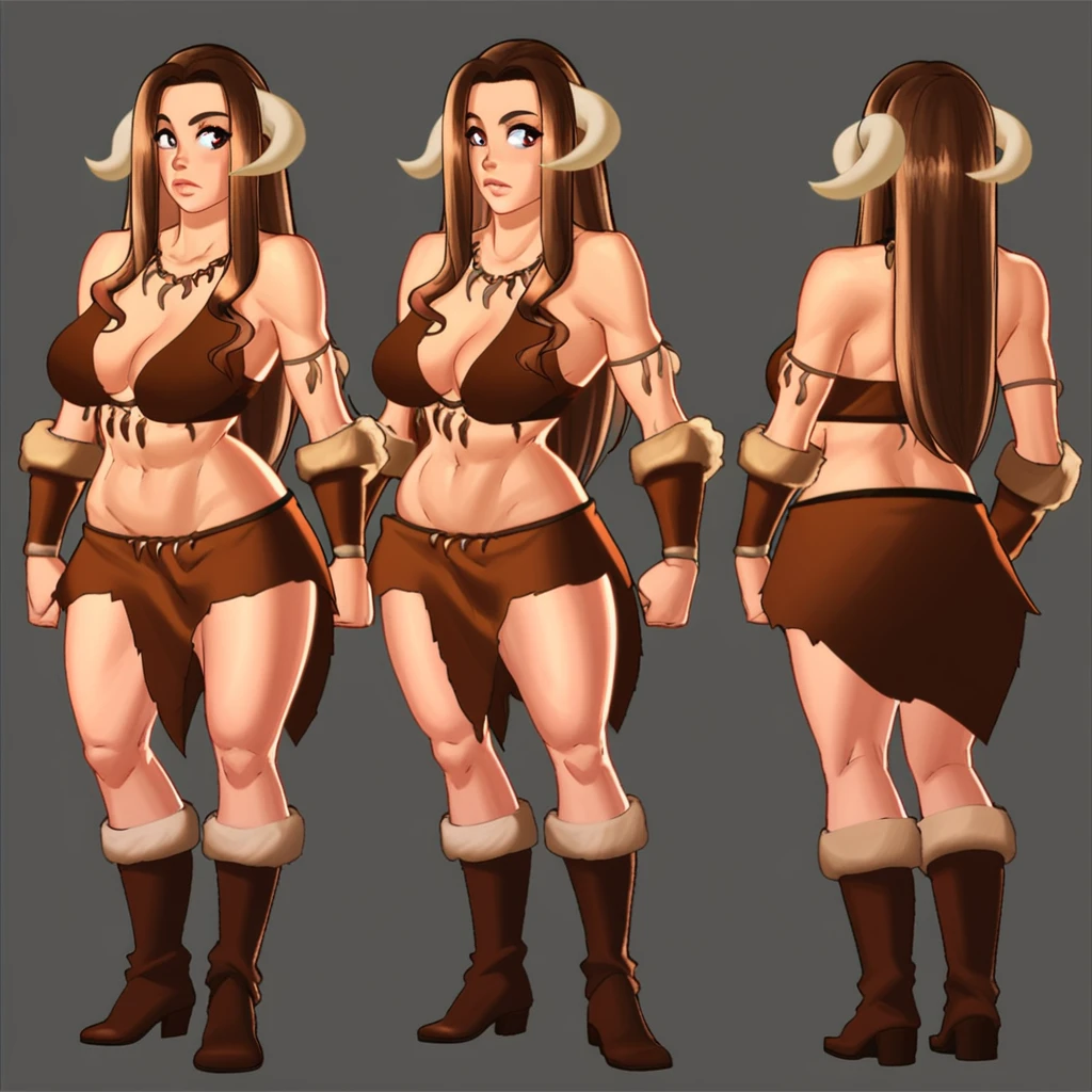 1girl, selene, brown hair, white horns, red eyes, hunter necklace, brown revealing clothes, clevage, belly exposed, brow bracelet, brown skirt, brown boots,