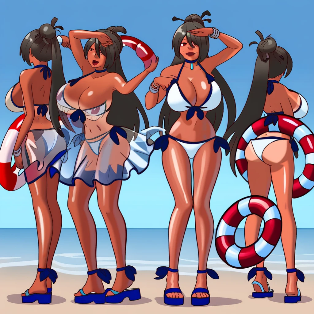 1girl,monike, red eyes, red eyes, black hair, ponytail, blue necklace, brown skin, tanned, white bikini, blue details on bikini, white panties, tiny transparent skirt, blue sandals, white bracelet, standing, buoy,
