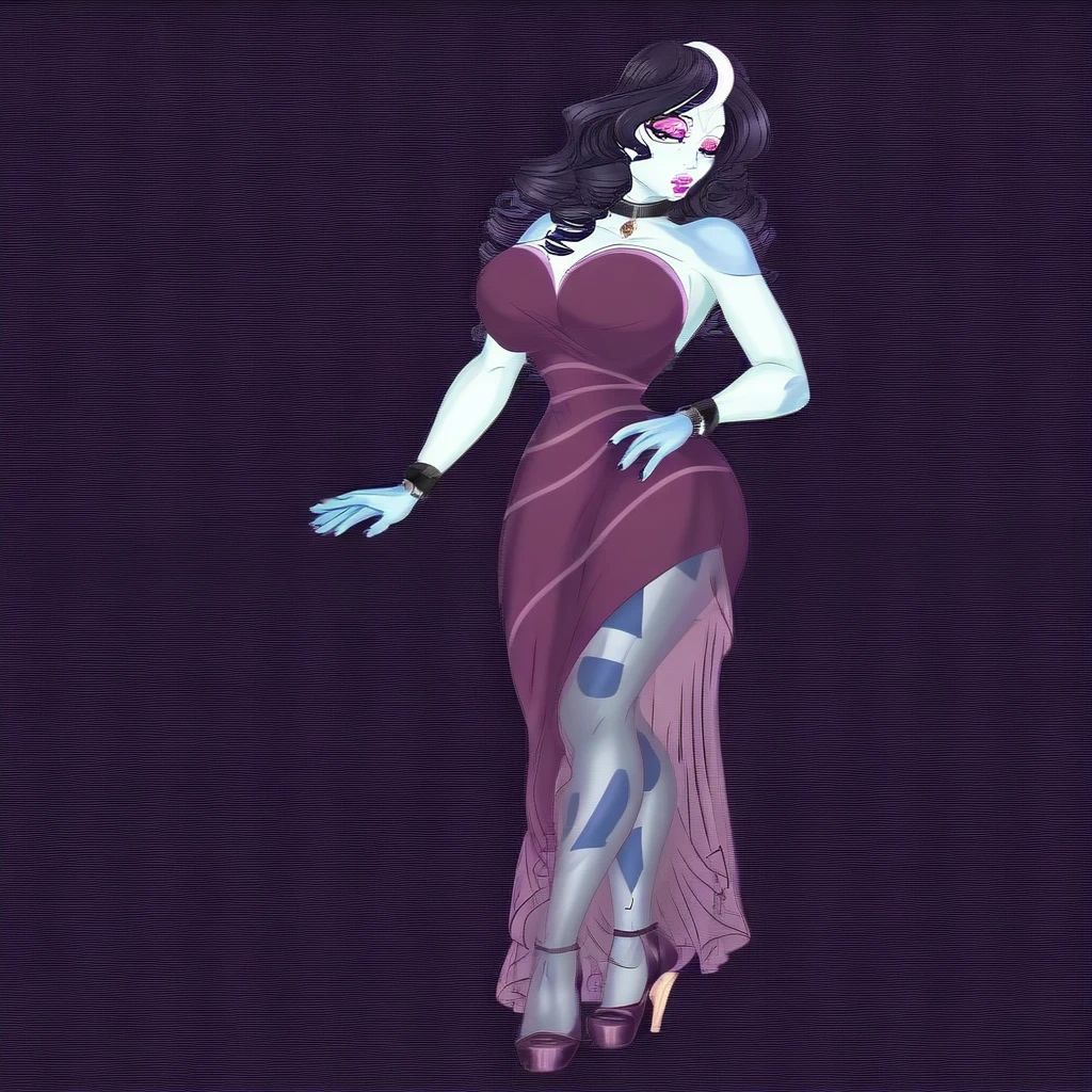 1girl, Letícia, black hair, pink lips, pink eyes, light blue skin, blue marks on body, make-up, purple dress, transparent pantyhose, purple heels, standing, black bracelet, Black necklace, clevage,