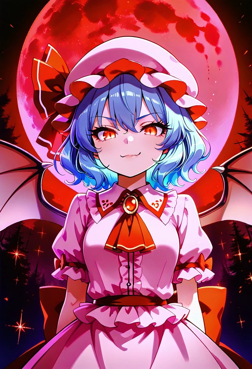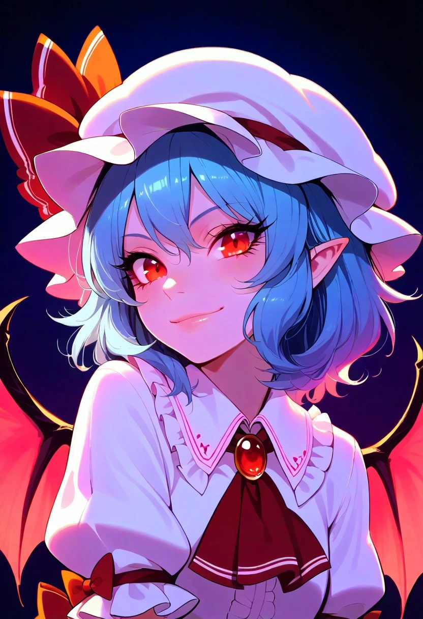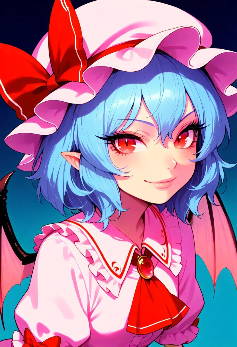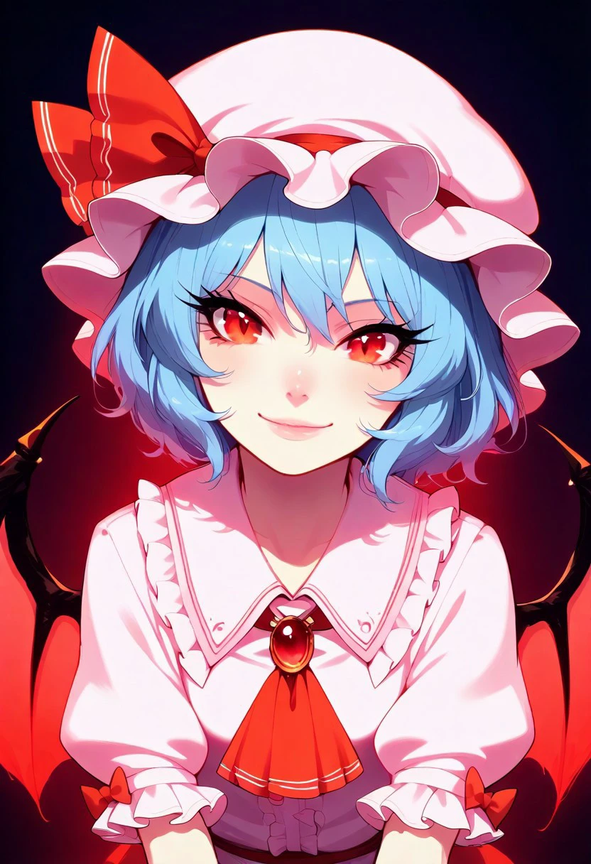 zzRemilia, red eyes, blue hair, short hair, hat, ribbon, wings, ascot, hat ribbon, bat wings, short sleeves, frills, puffy sleeves,