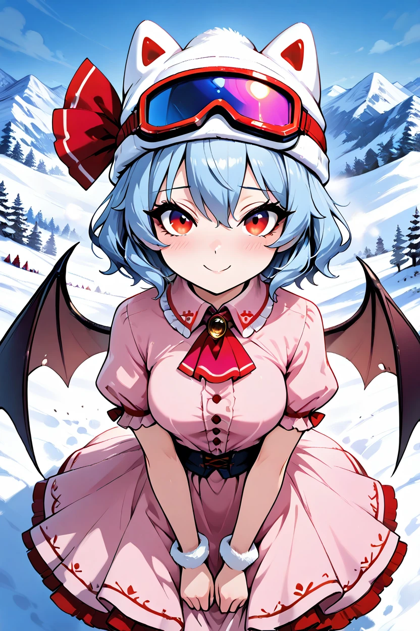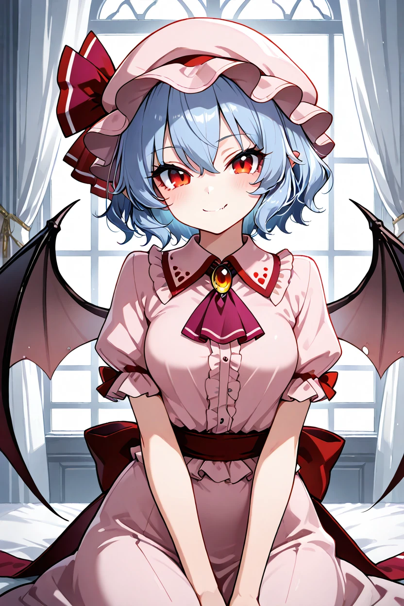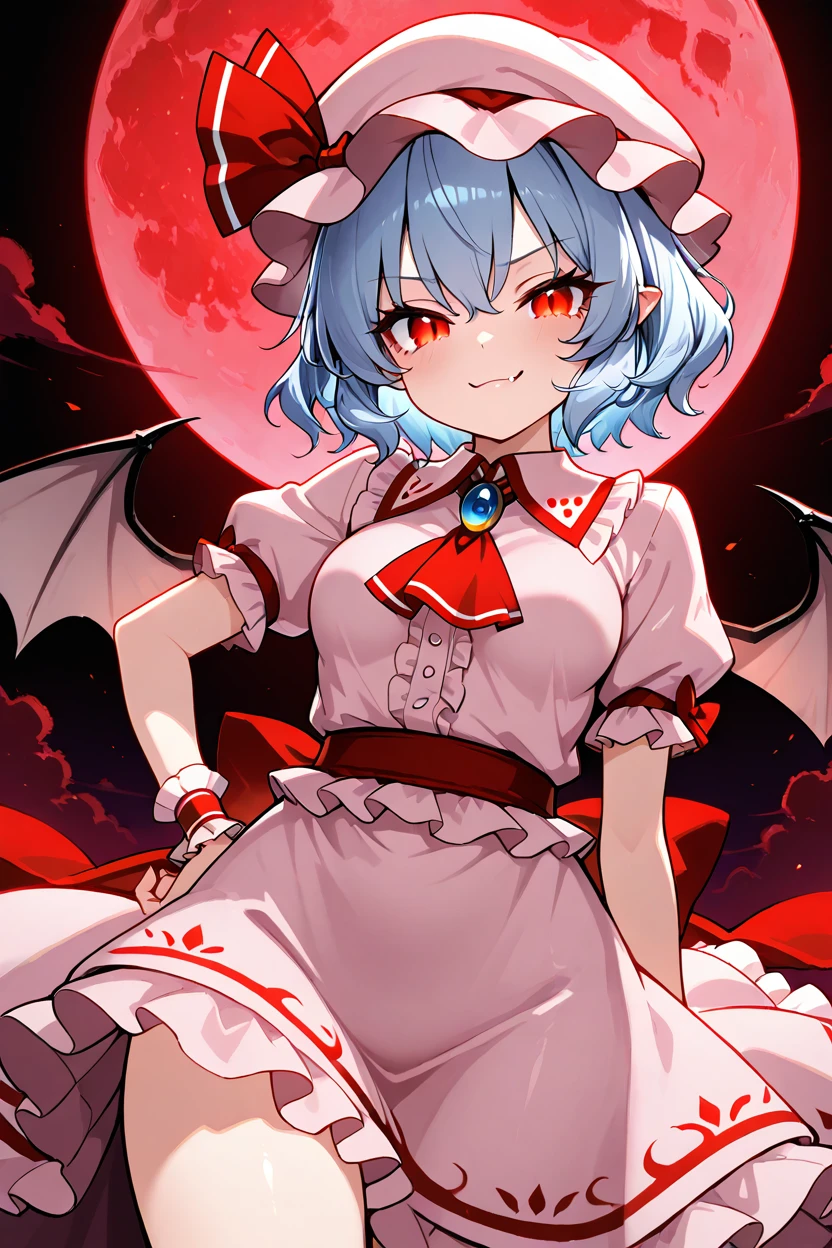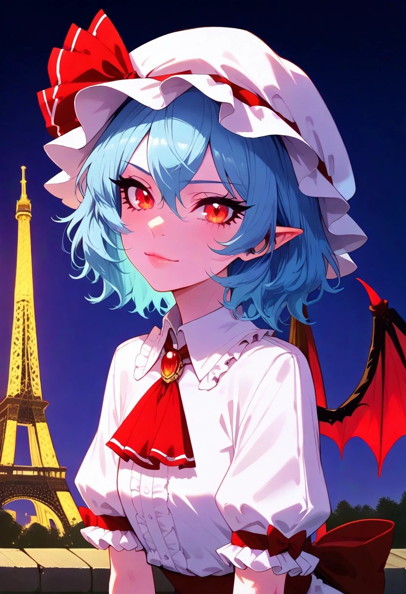 zzRemilia, red eyes, blue hair, short hair, hat, ribbon, wings, ascot, hat ribbon, bat wings, short sleeves, frills, puffy sleeves,