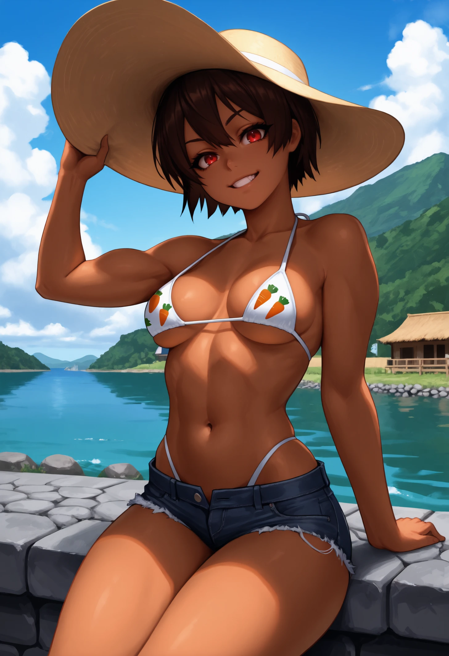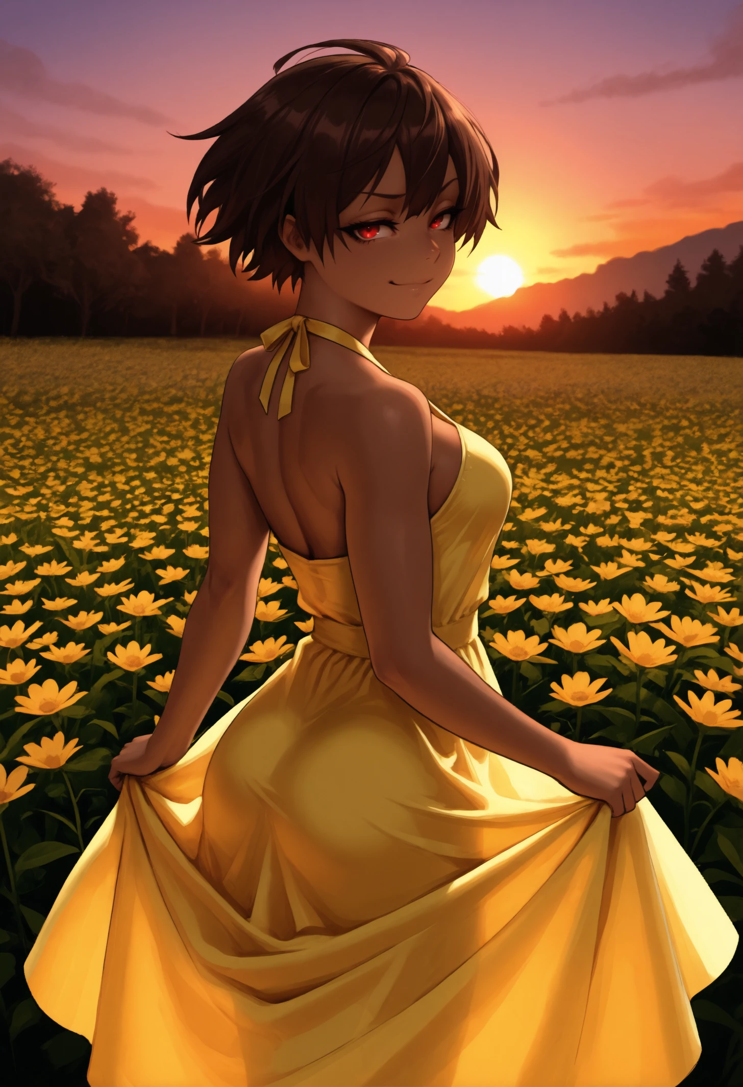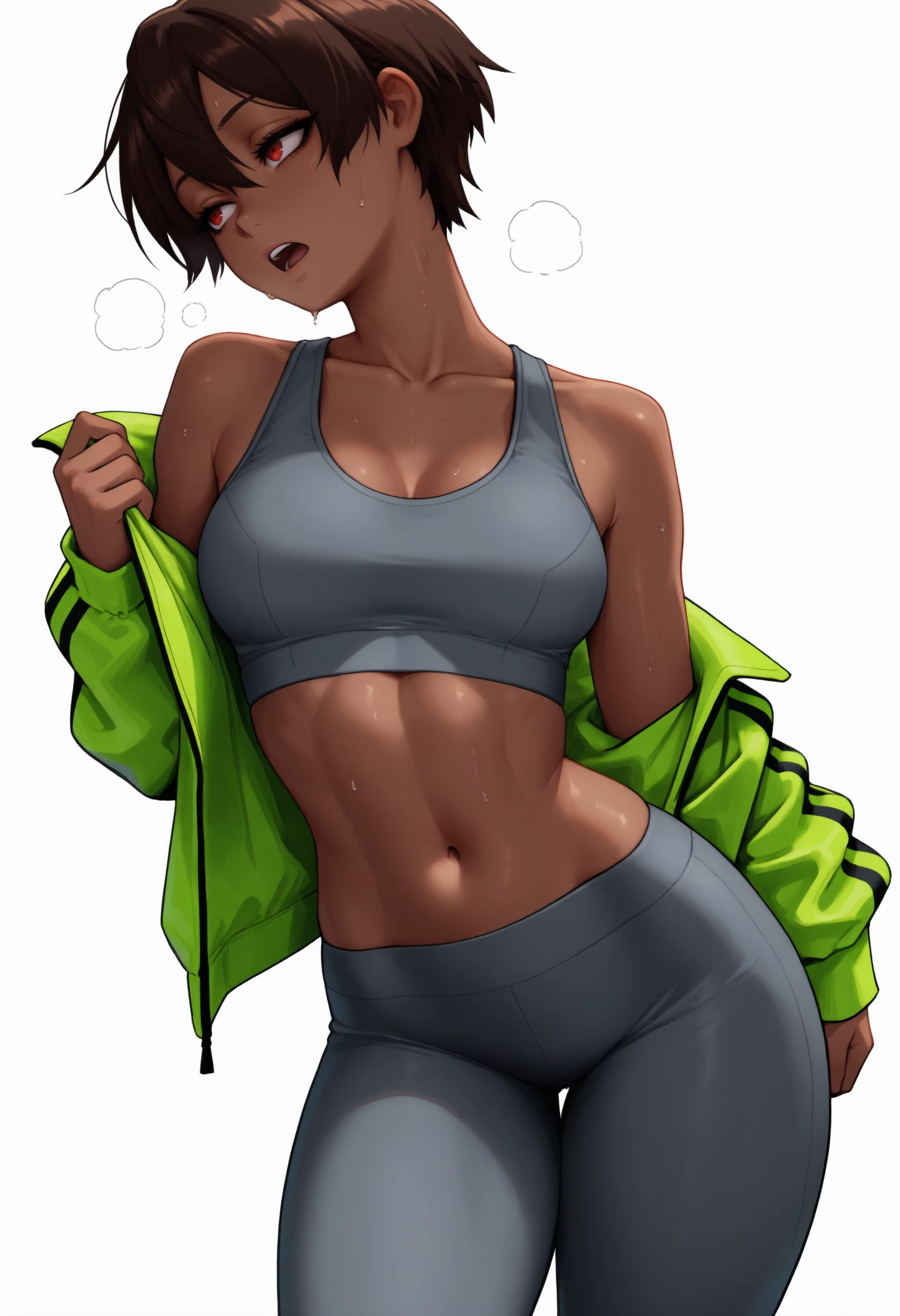 dark-skinned female, red eyes, dark brown hair, short hair, medium breasts, hair between eyes