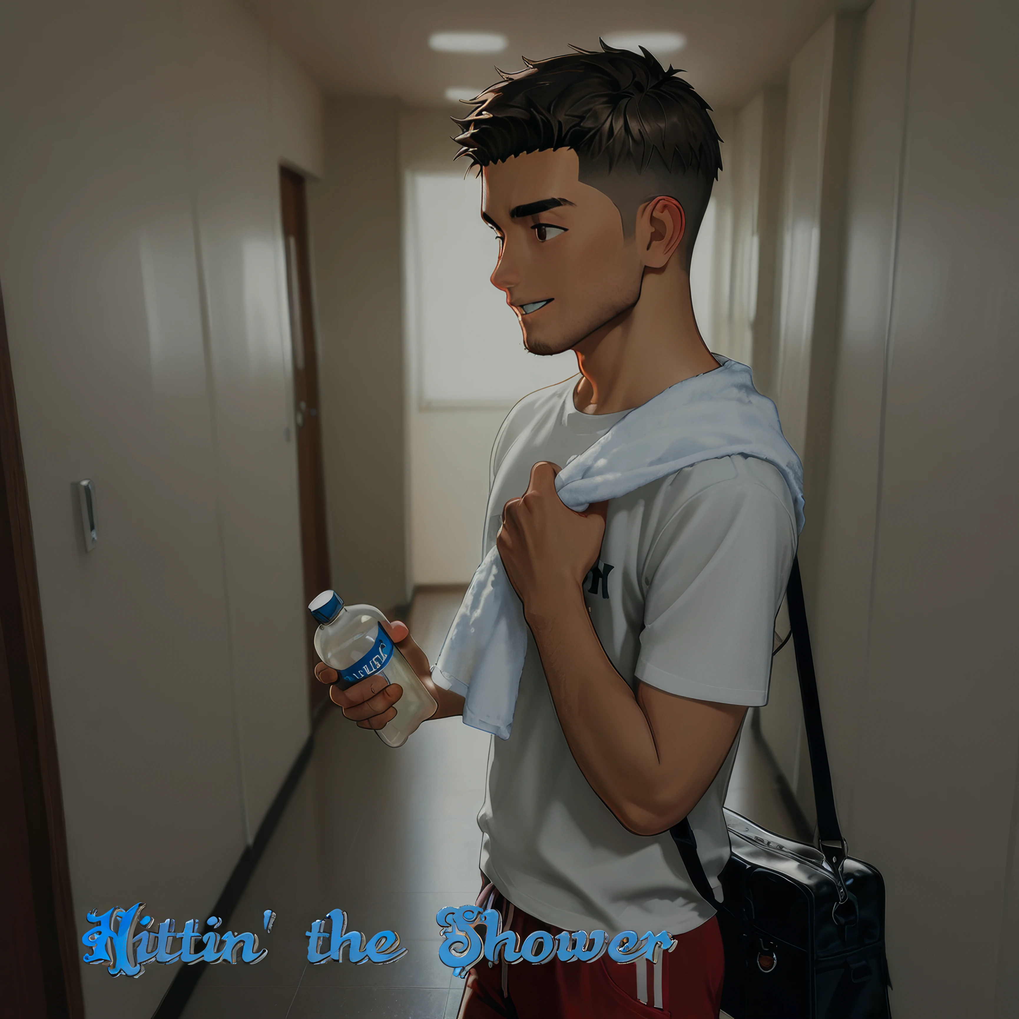 flip-flops - towel_around_waist - towel_on_one_shoulder - shower_(place) - showering - same-sex_bathing - shower_head - water - wet - water_drop - fog - steam - steaming_body - rain - wet_hair - soap - soap_bottle - shampoo - soap_bubbles - washing - washing_hair - shared_bathing - drying_hair - drying_body