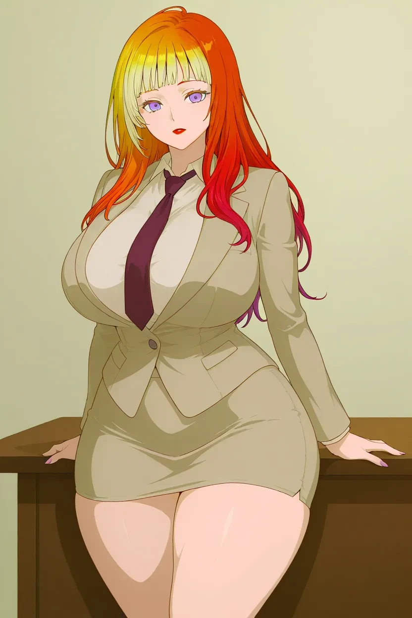 1girl, Sing, light purple eyes, multi colored hair, blonde hair, red hair, orange hair, long hair, hair down, bangs, lipstick, massive breasts, curvy, extremely sexy, wide hips, thick thighs, HD, Hi-res, anime coloring, anime source