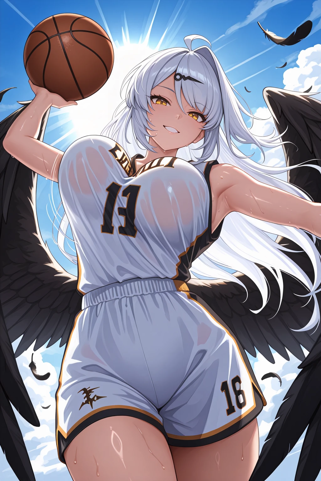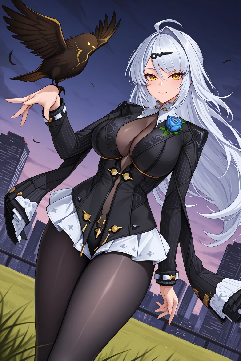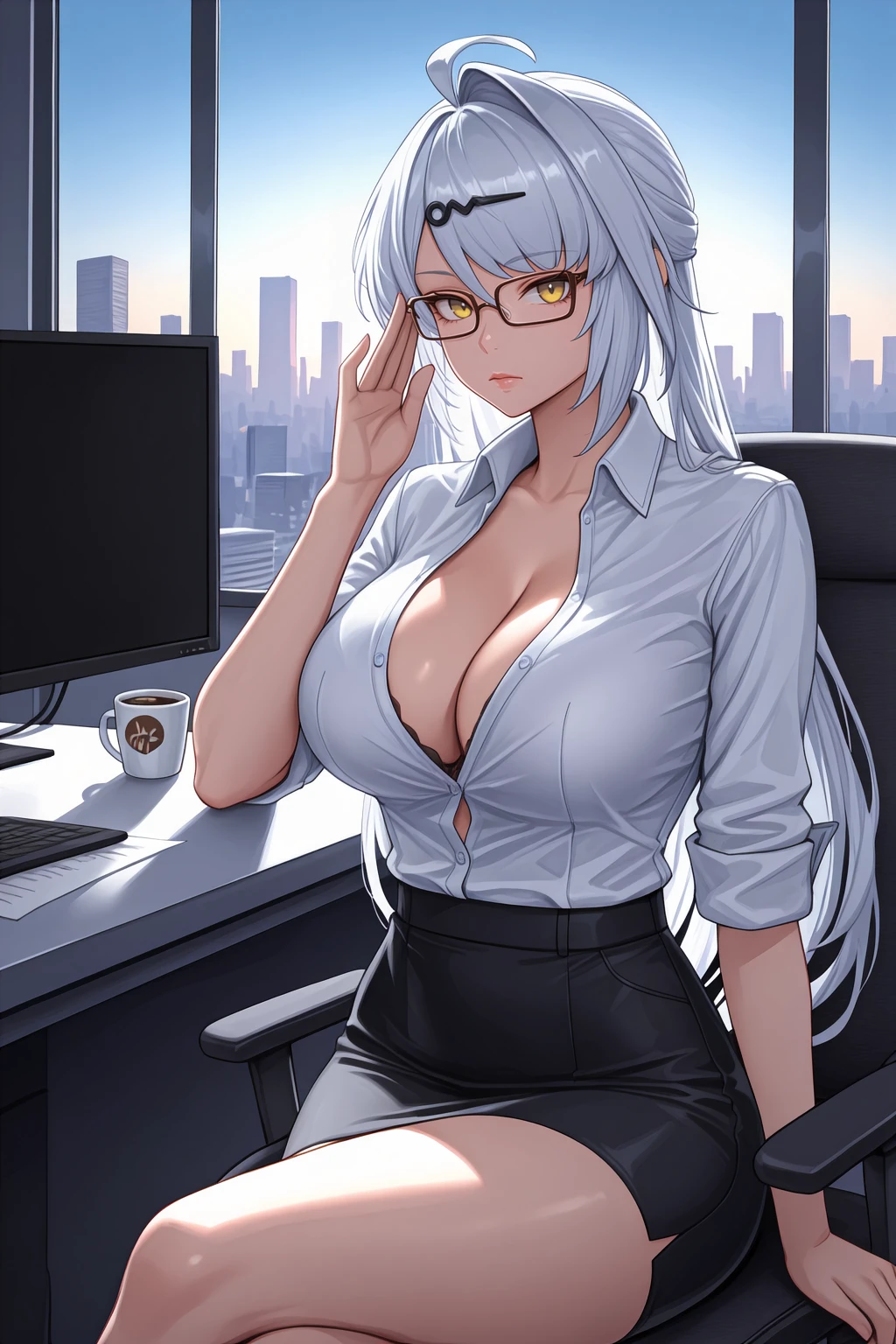 Appearance : yxn, large breasts, yellow eyes, white hair, ahoge, swept bangs, single hair intake, sidelocks, very long hair, half updo, hairclip, hair ornament