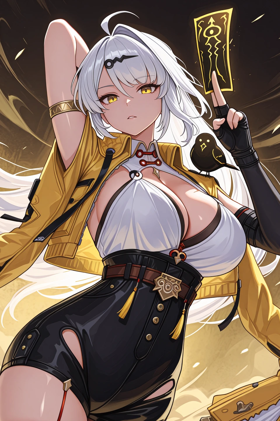 Default outfit : yellow jacket, cropped jacket, open jacket, white collared shirt, cleavage cutout, armlet, uneven gloves, single elbow glove, fingerless gloves, black gloves, high-waist shorts, black shorts, brown belt, high belt, single garter strap, thigh strap, single thighhigh, black thighhighs, two-tone boots, white boots, black boots, high heel boots