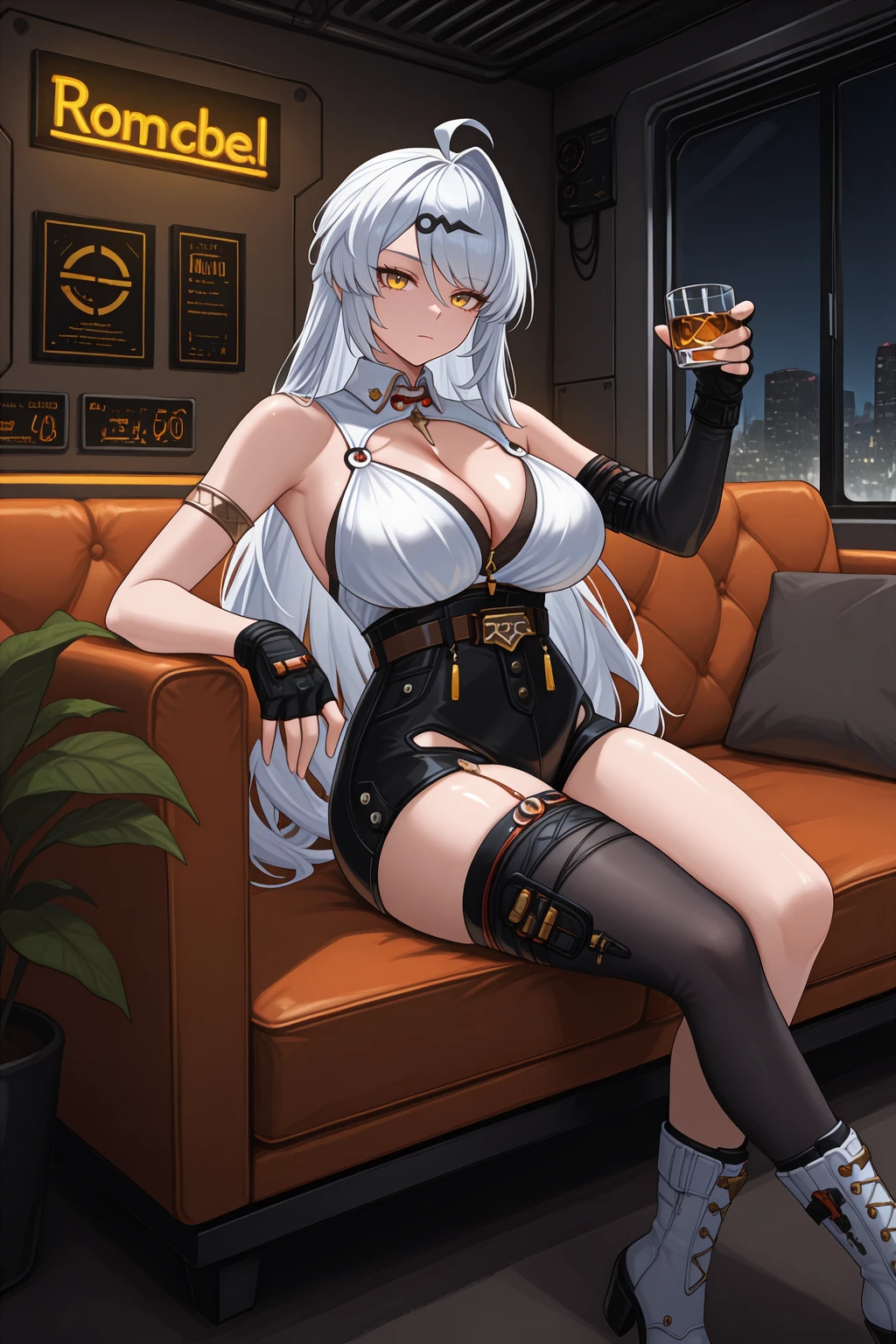 Default alt : bare shoulders, white collared shirt, cleavage cutout, armlet, uneven gloves, single elbow glove, fingerless gloves, black gloves, high-waist shorts, black shorts, brown belt, high belt, single garter strap, thigh strap, single thighhigh, black thighhighs, two-tone boots, white boots, black boots, high heel boots