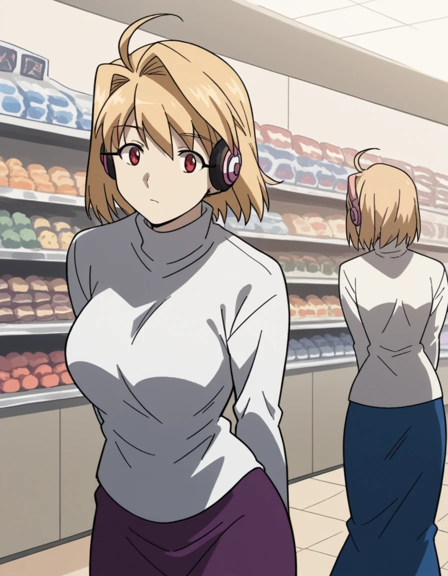 long skirt, purple skirt, skirt, sweater, turtleneck, white sweater,