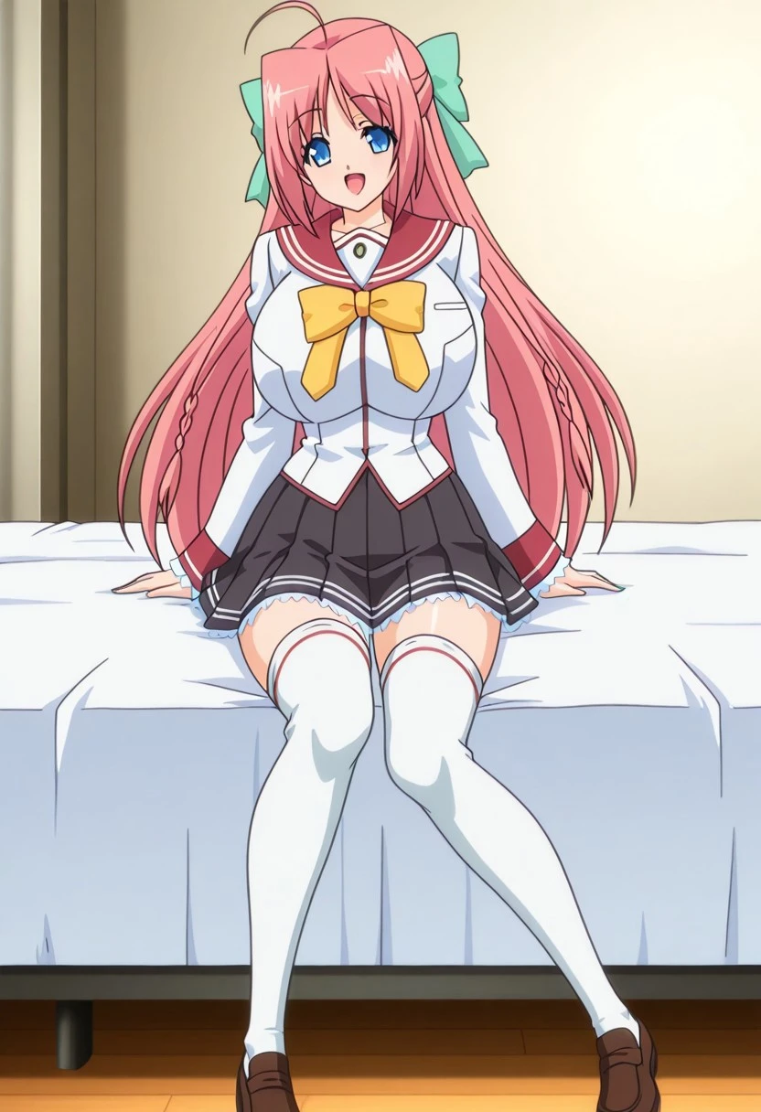 akino's school outfit, white shirt, red sailor collar, yellow bowtie, long sleeves, frilled sleeves, black skirt, pleated skirt, frilled skirt, white thighhighs, brown footwear, loafers,